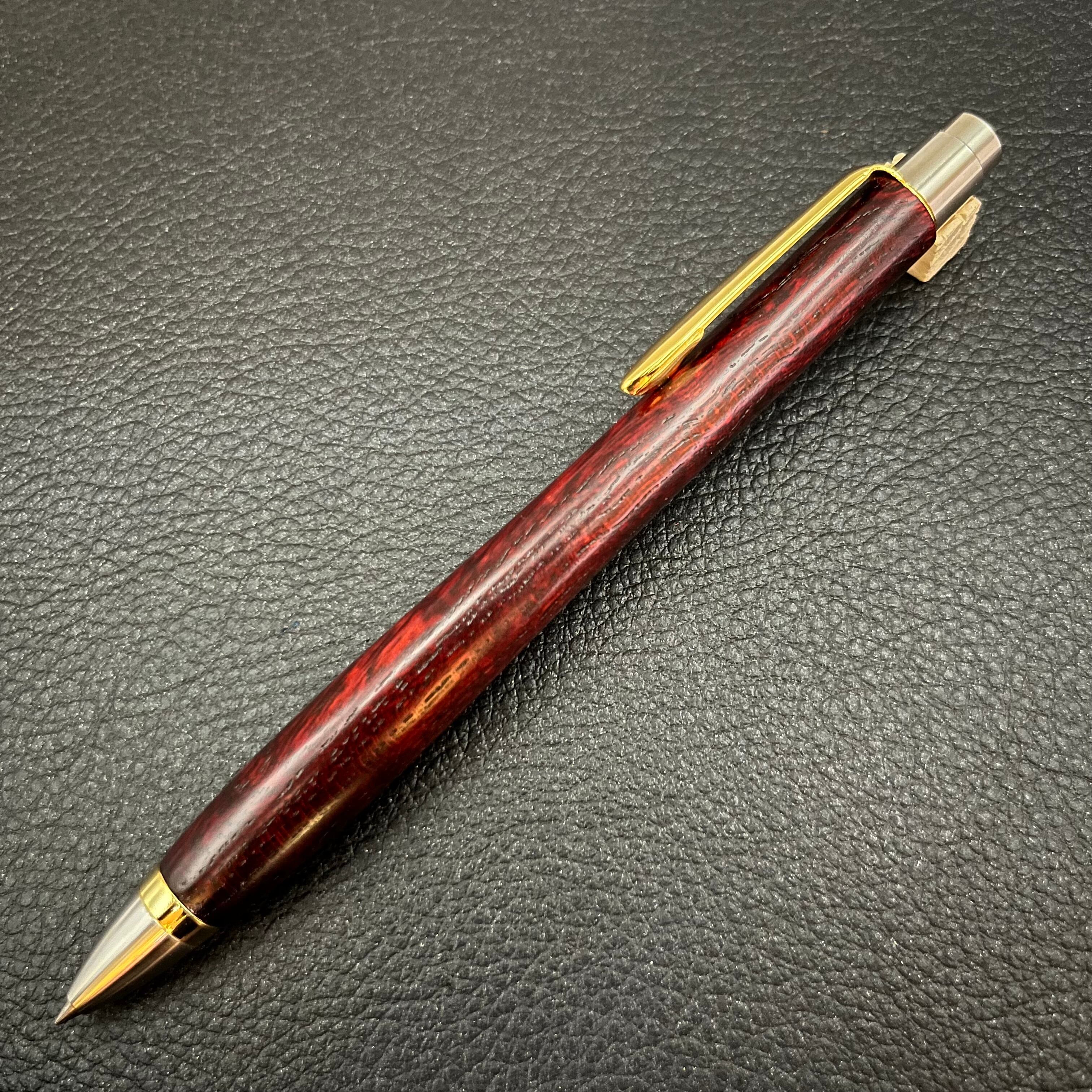 ボールペンのノックシステムは、ドイツ最高のクリックメカニズムを採用してあります。このメカニズムはユニークな機構のため、クリックしたときのカチカチ音が静かで、どんな場所でも気兼ねなく使うことができます。滑らかに動くこのプッシュ感覚を一度味わうと他には戻れなくなってしまうほどの魅力があります。 100分の1単位の加工精度で削り出されたペン先は、軸ブレも全くありません。