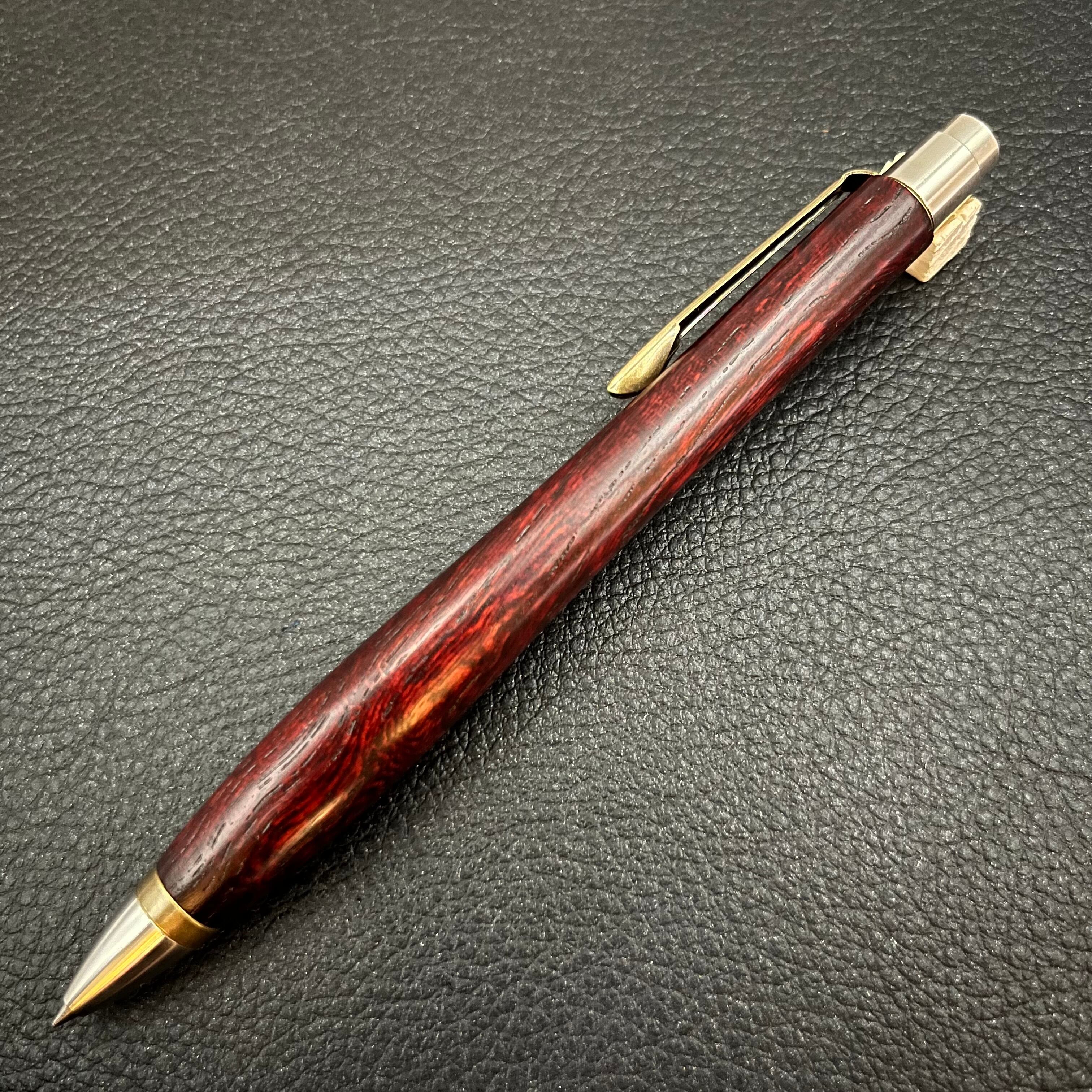 ボールペンのノックシステムは、ドイツ最高のクリックメカニズムを採用してあります。このメカニズムはユニークな機構のため、クリックしたときのカチカチ音が静かで、どんな場所でも気兼ねなく使うことができます。滑らかに動くこのプッシュ感覚を一度味わうと他には戻れなくなってしまうほどの魅力があります。 100分の1単位の加工精度で削り出されたペン先は、軸ブレも全くありません。