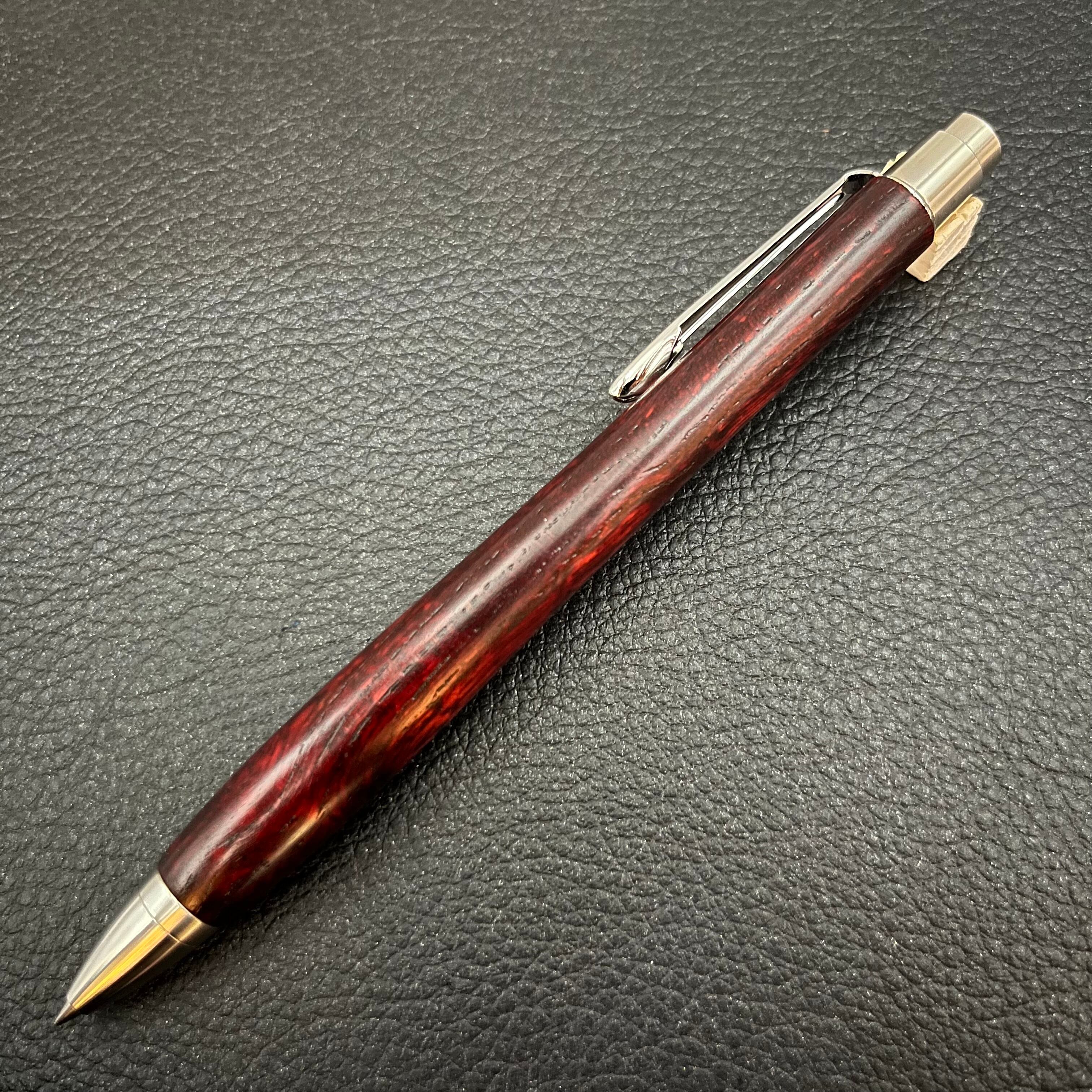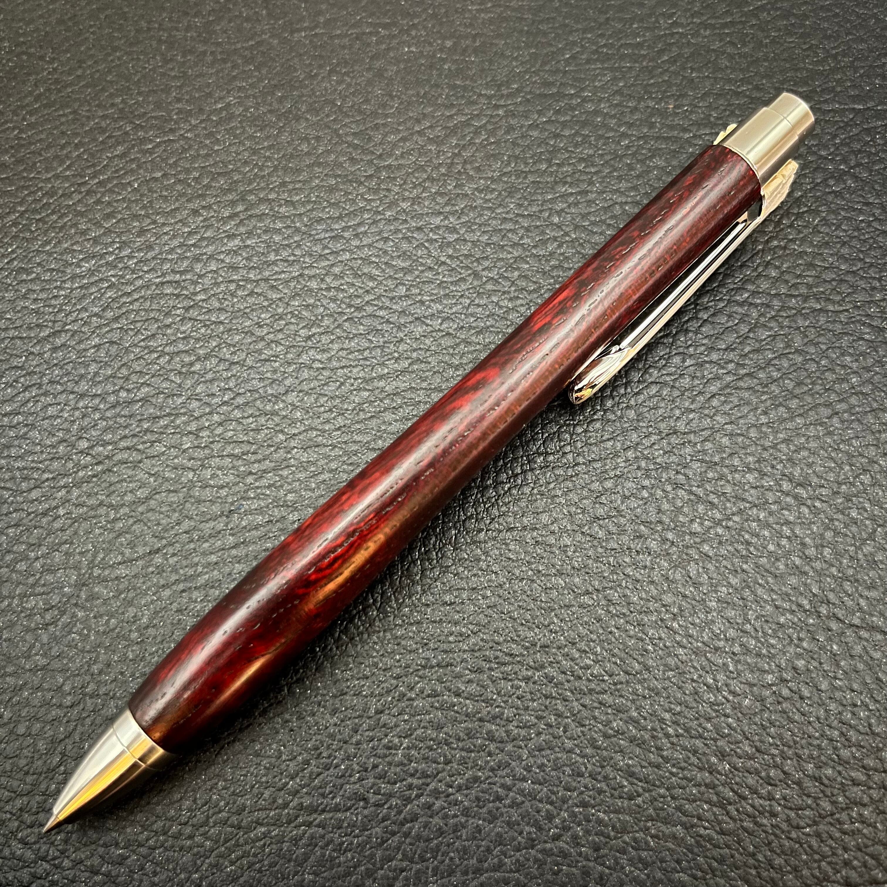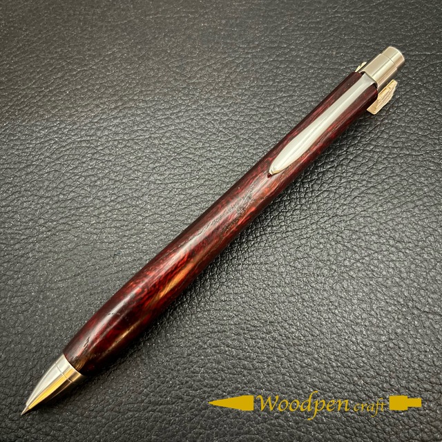 ボールペンのノックシステムは、ドイツ最高のクリックメカニズムを採用してあります。このメカニズムはユニークな機構のため、クリックしたときのカチカチ音が静かで、どんな場所でも気兼ねなく使うことができます。滑らかに動くこのプッシュ感覚を一度味わうと他には戻れなくなってしまうほどの魅力があります。 100分の1単位の加工精度で削り出されたペン先は、軸ブレも全くありません。