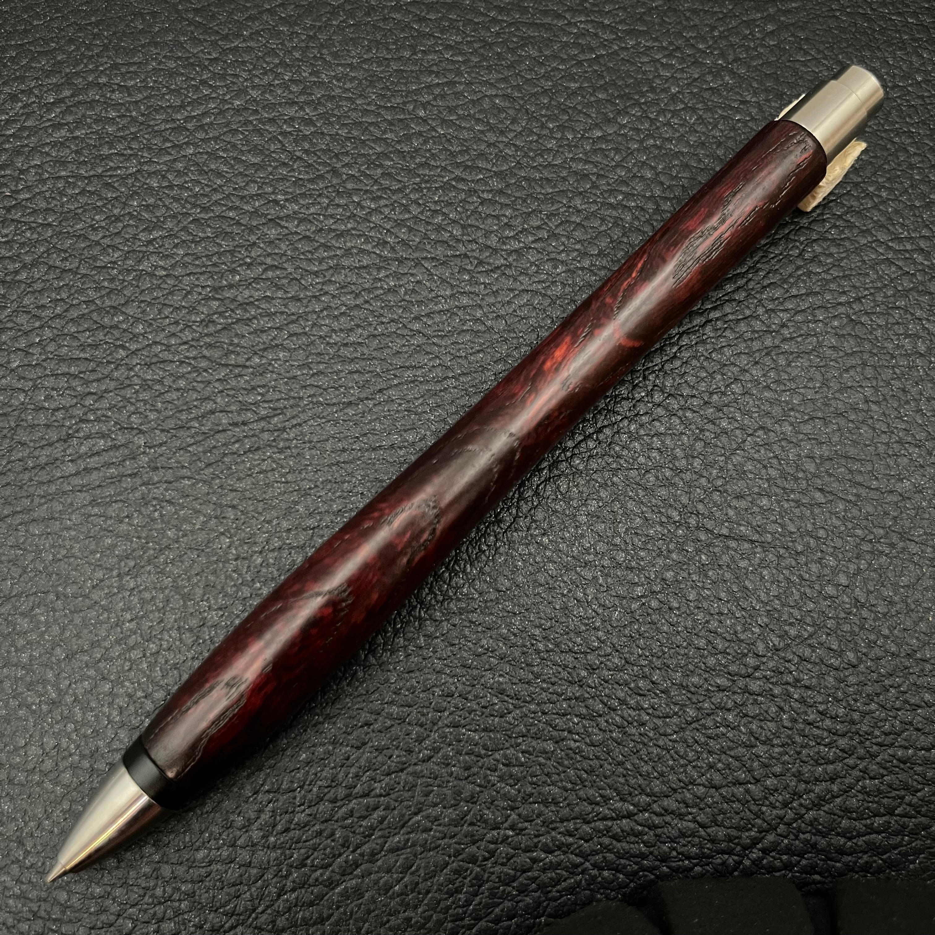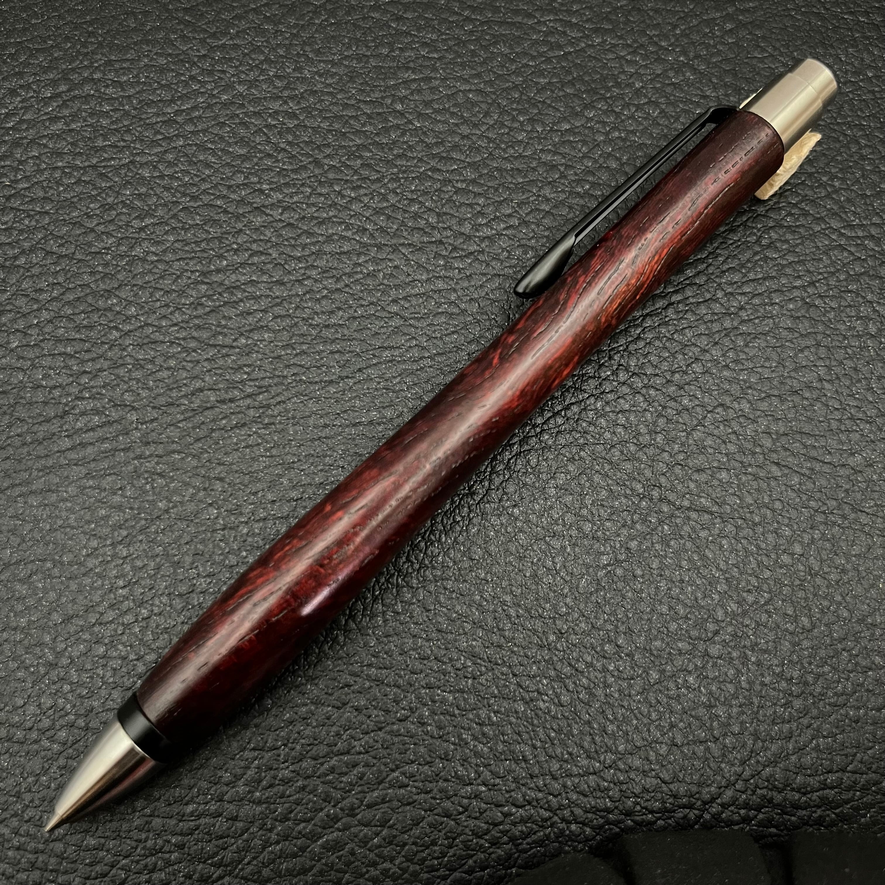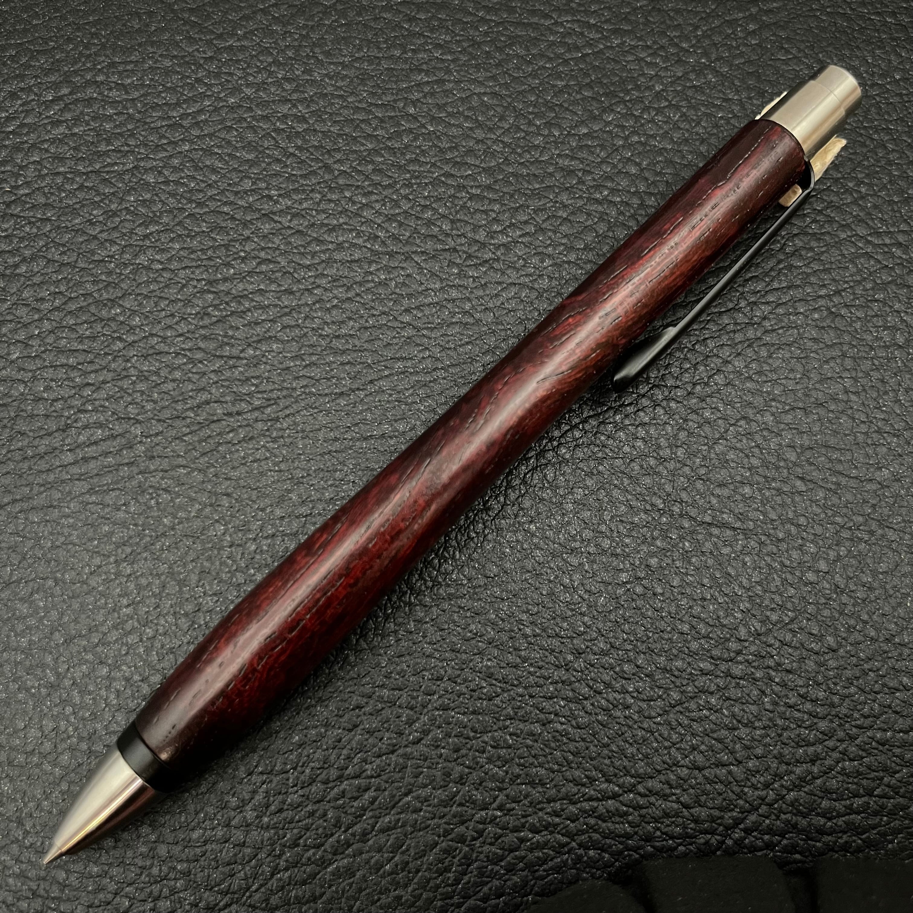 ボールペンのノックシステムは、ドイツ最高のクリックメカニズムを採用してあります。このメカニズムはユニークな機構のため、クリックしたときのカチカチ音が静かで、どんな場所でも気兼ねなく使うことができます。滑らかに動くこのプッシュ感覚を一度味わうと他には戻れなくなってしまうほどの魅力があります。 100分の1単位の加工精度で削り出されたペン先は、軸ブレも全くありません。