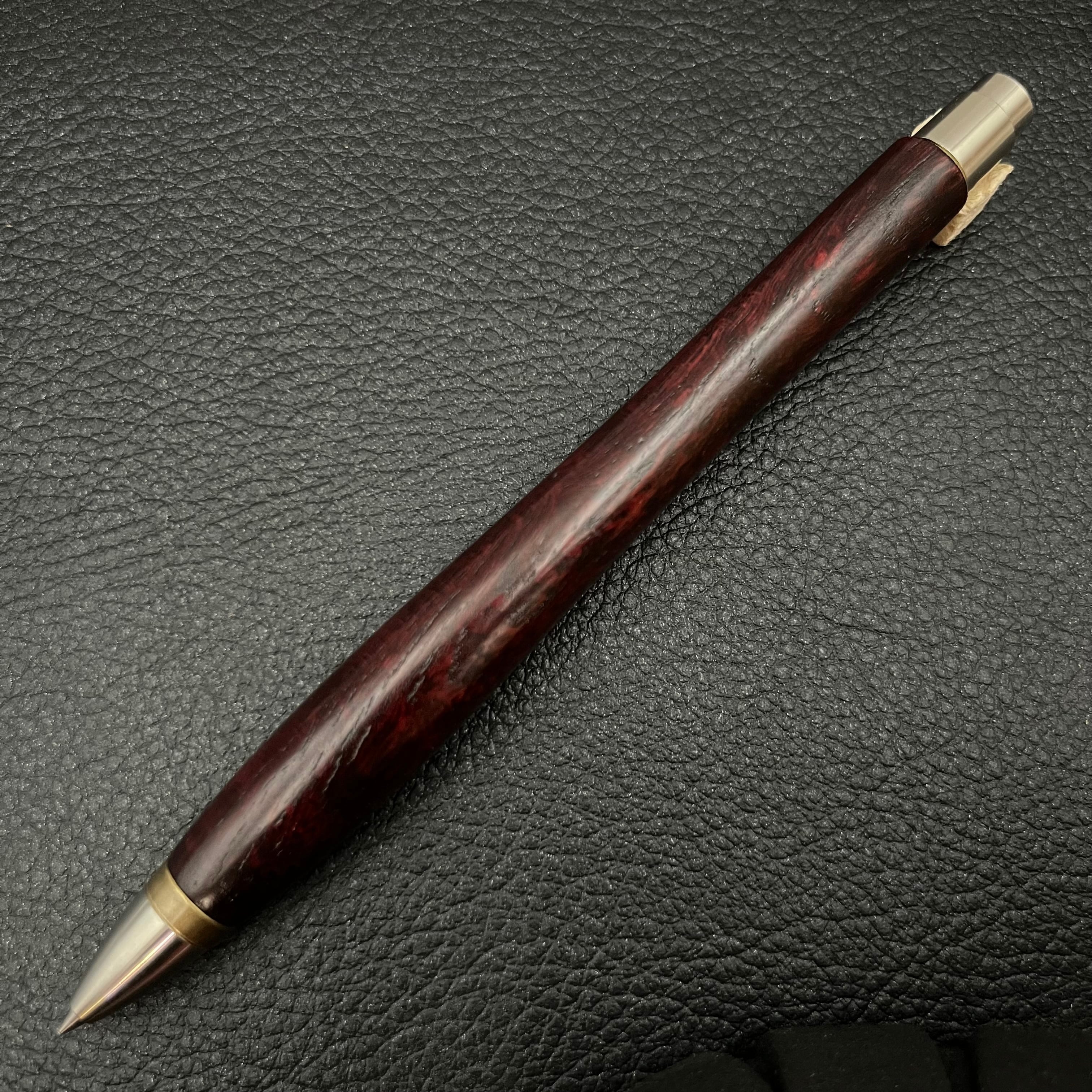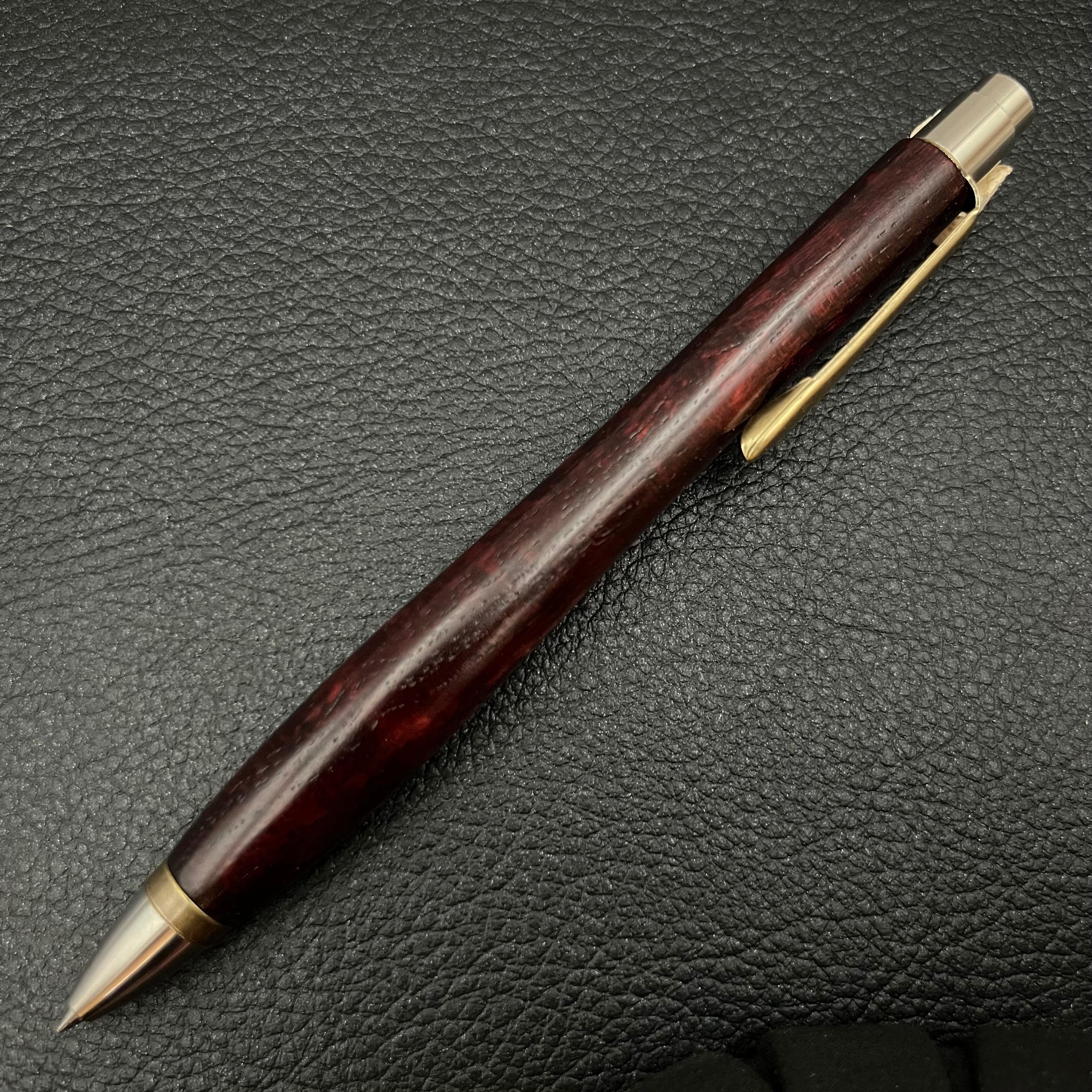 ボールペンのノックシステムは、ドイツ最高のクリックメカニズムを採用してあります。このメカニズムはユニークな機構のため、クリックしたときのカチカチ音が静かで、どんな場所でも気兼ねなく使うことができます。滑らかに動くこのプッシュ感覚を一度味わうと他には戻れなくなってしまうほどの魅力があります。 100分の1単位の加工精度で削り出されたペン先は、軸ブレも全くありません。