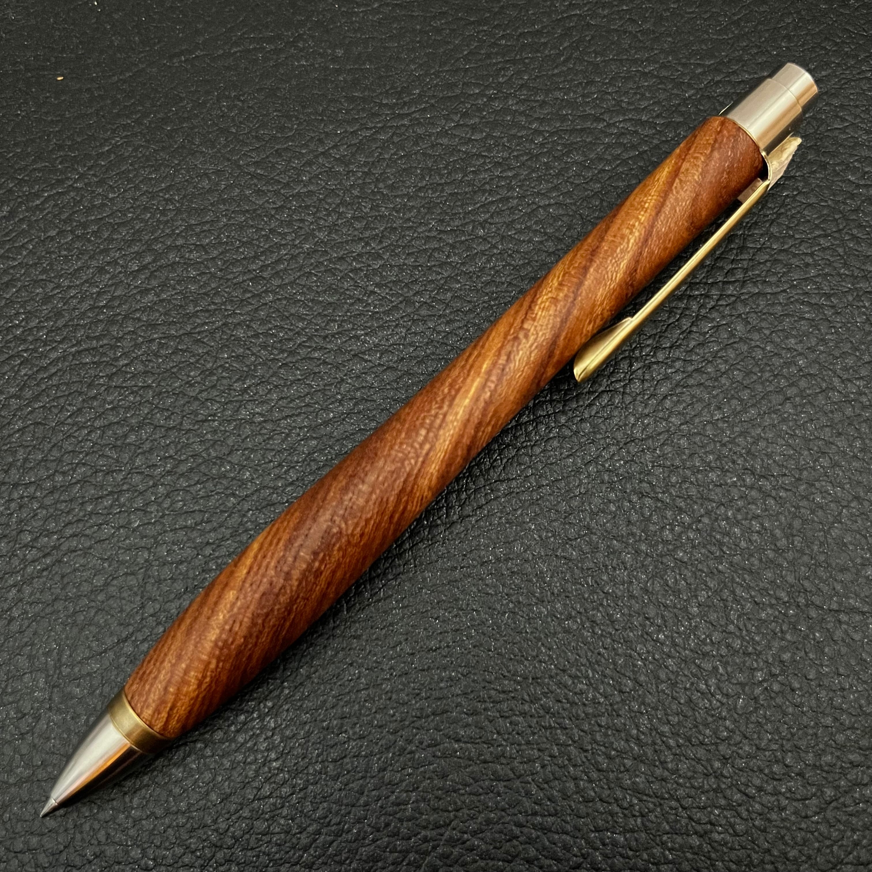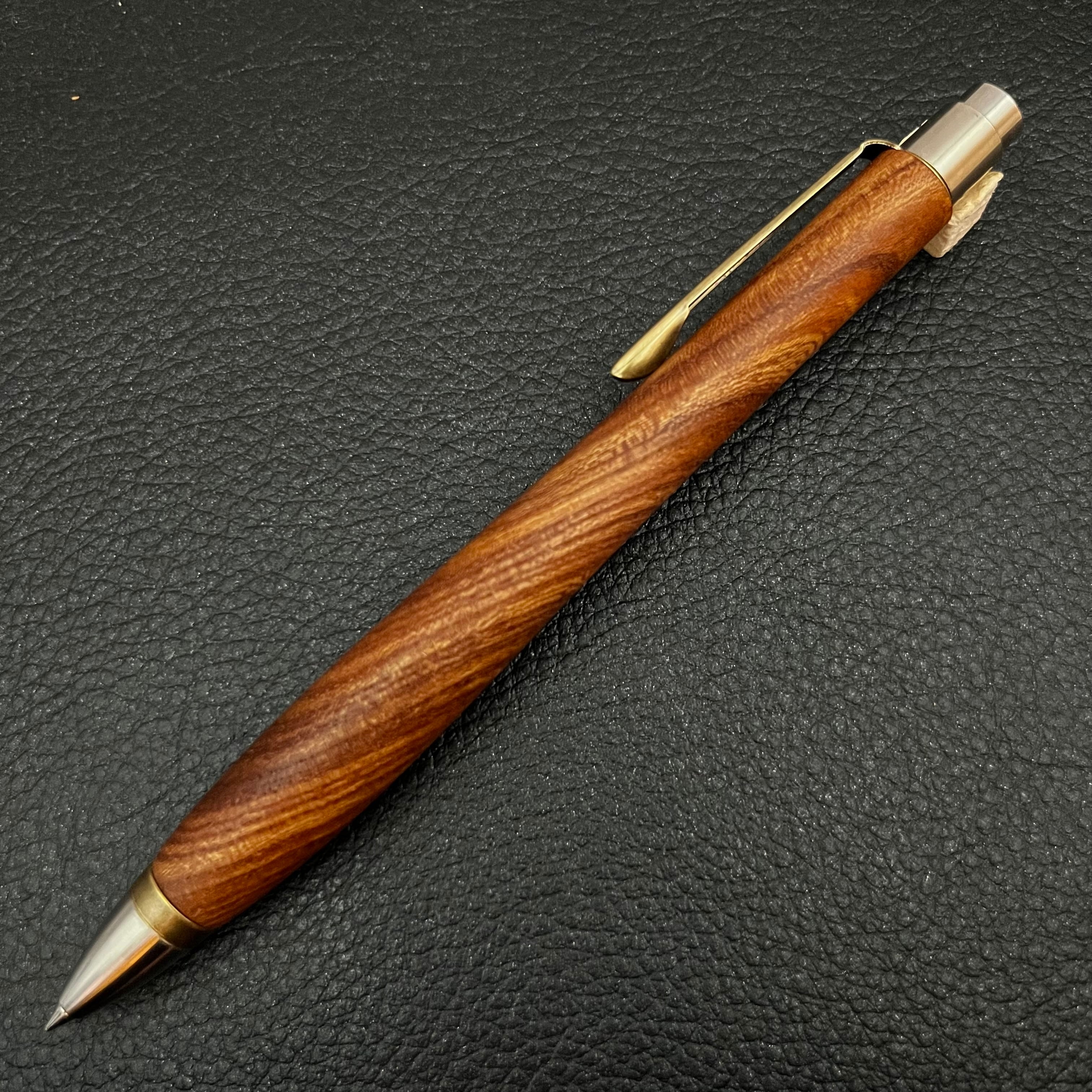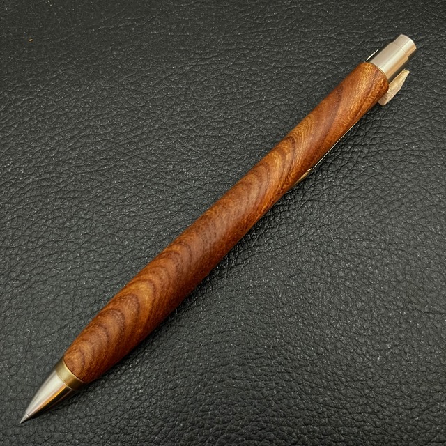 ペンに使った木は、推定50年以上も前に雷に打たれた大枝を強剪定したもので、巨木と雷の影響で普通の欅と色合いが全く違い濃いです。