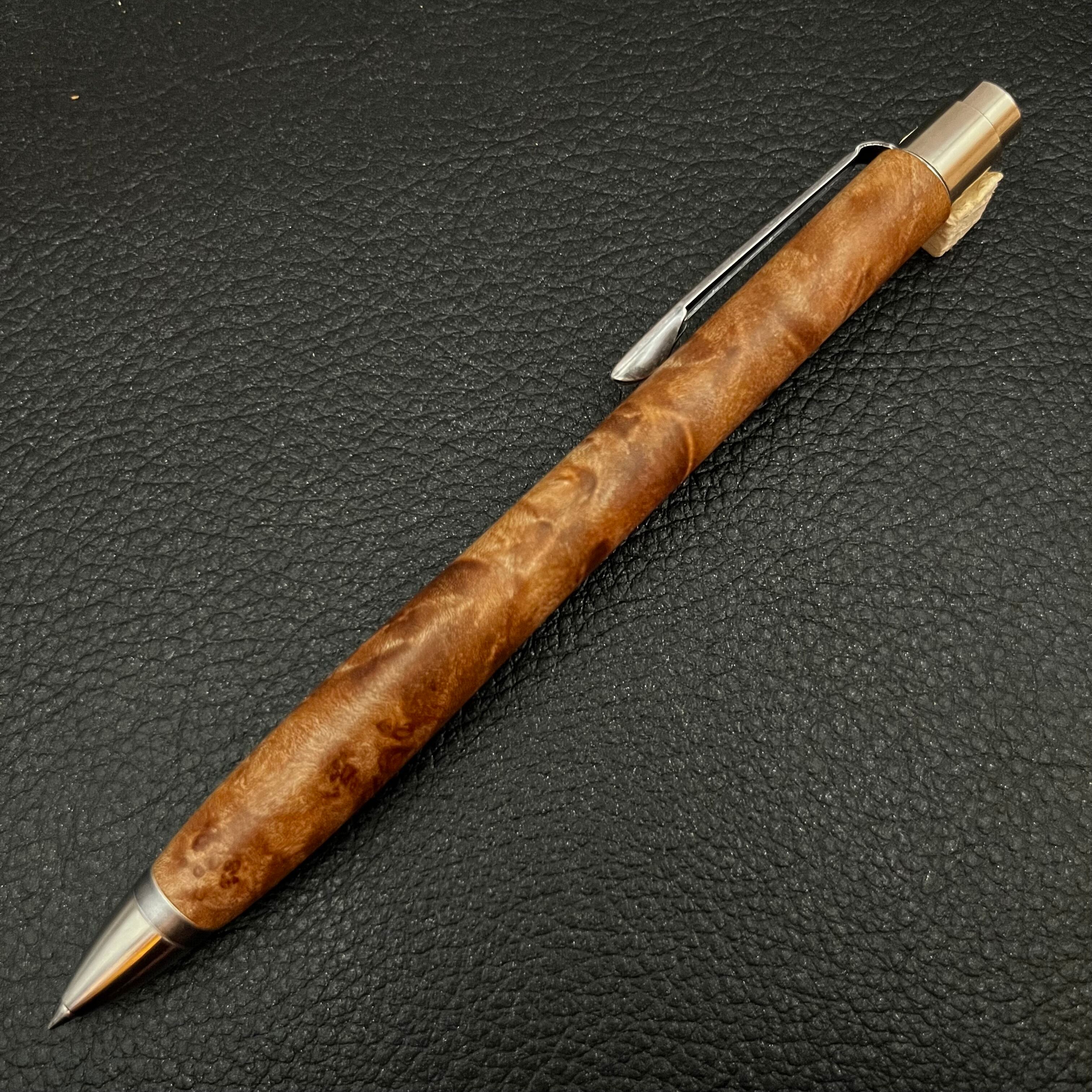 ボールペンのノックシステムは、ドイツ最高のクリックメカニズムを採用してあります。このメカニズムはユニークな機構のため、クリックしたときのカチカチ音が静かで、どんな場所でも気兼ねなく使うことができます。滑らかに動くこのプッシュ感覚を一度味わうと他には戻れなくなってしまうほどの魅力があります。 100分の1単位の加工精度で削り出されたペン先は、軸ブレも全くありません。