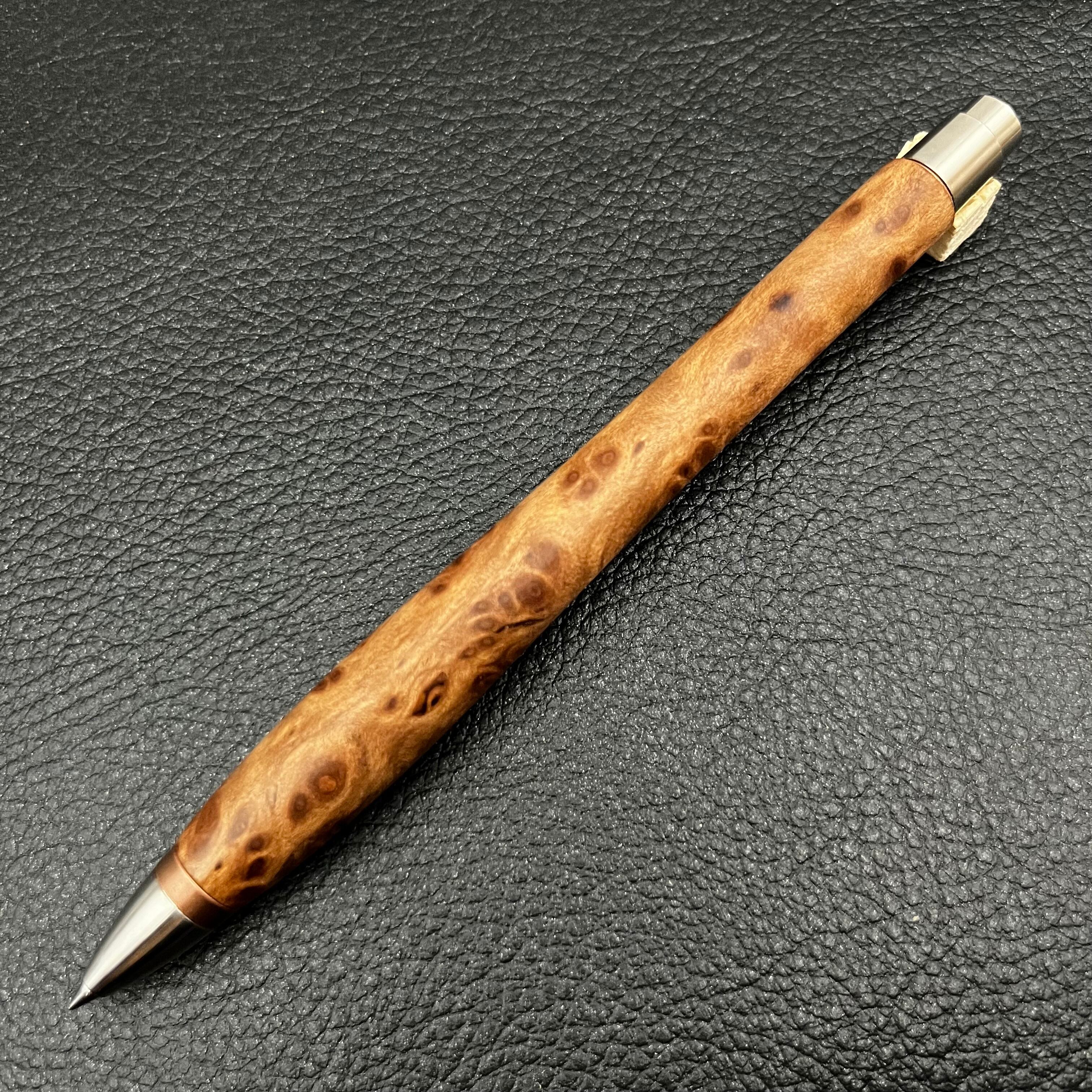 ※40年以上前に京都府中部で伐採された杉の瘤です。大好きな木で当たり前のように身近に在る木だからこそ誰も見たことのない杉瘤との出会いは衝撃的でした。こんな素晴らしい木を使ったペンを制作できたことを幸せに思っています。