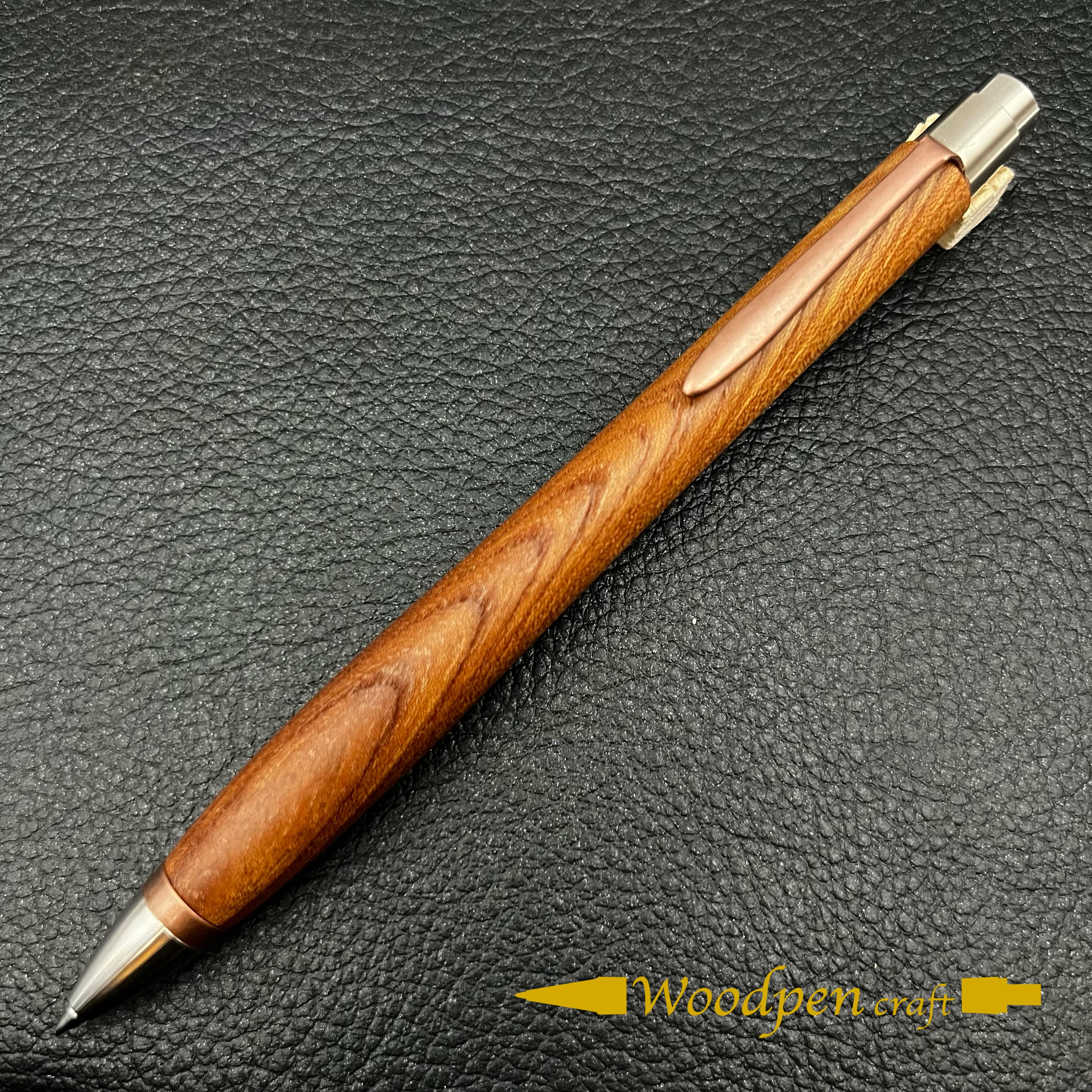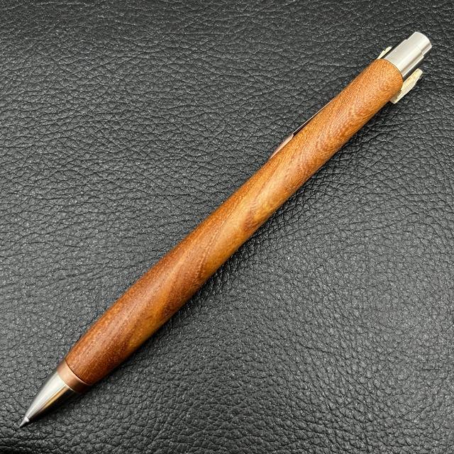 ペンに使った木は、推定50年以上も前に雷に打たれた大枝を強剪定したもので、巨木と雷の影響で普通の欅と色合いが全く違い濃いです。