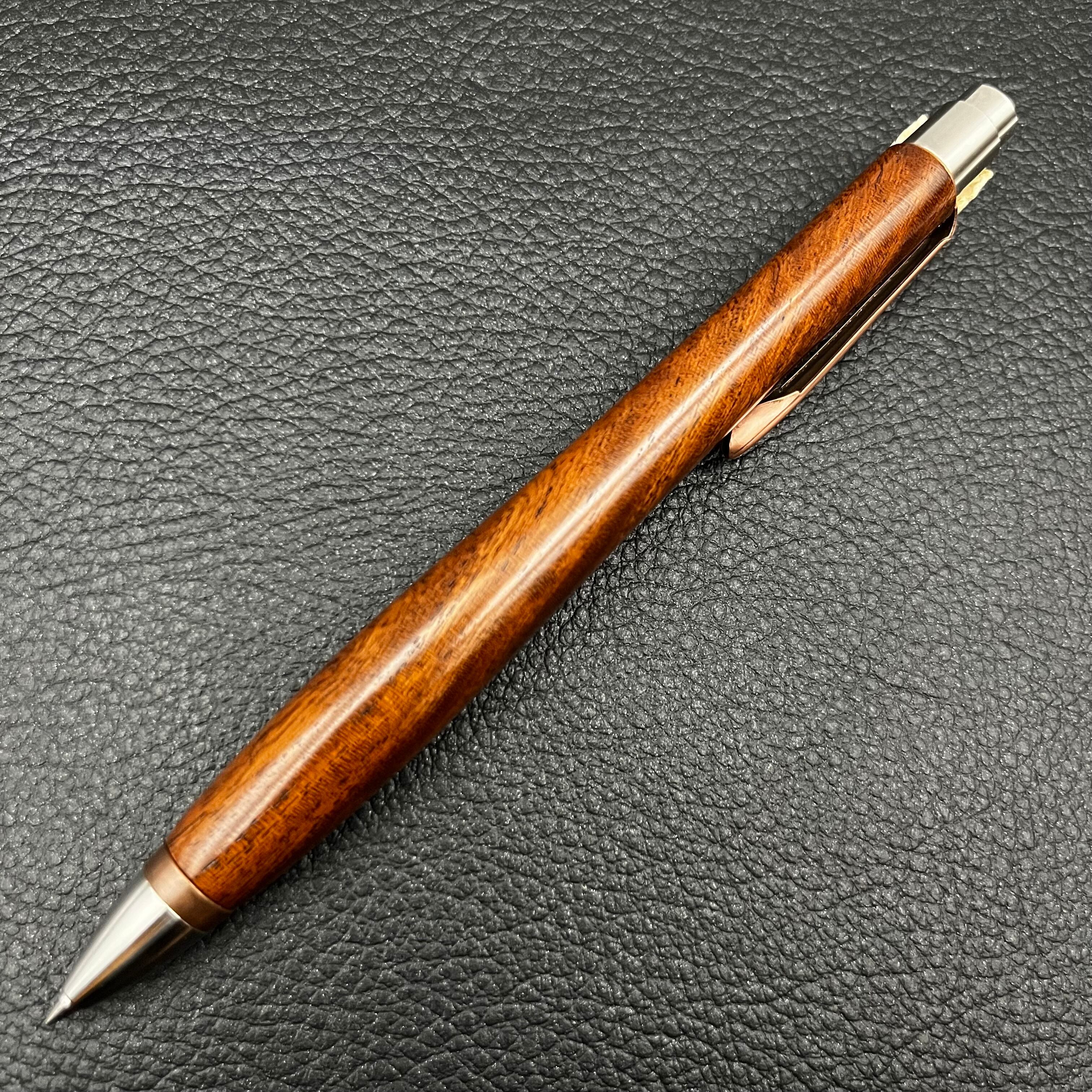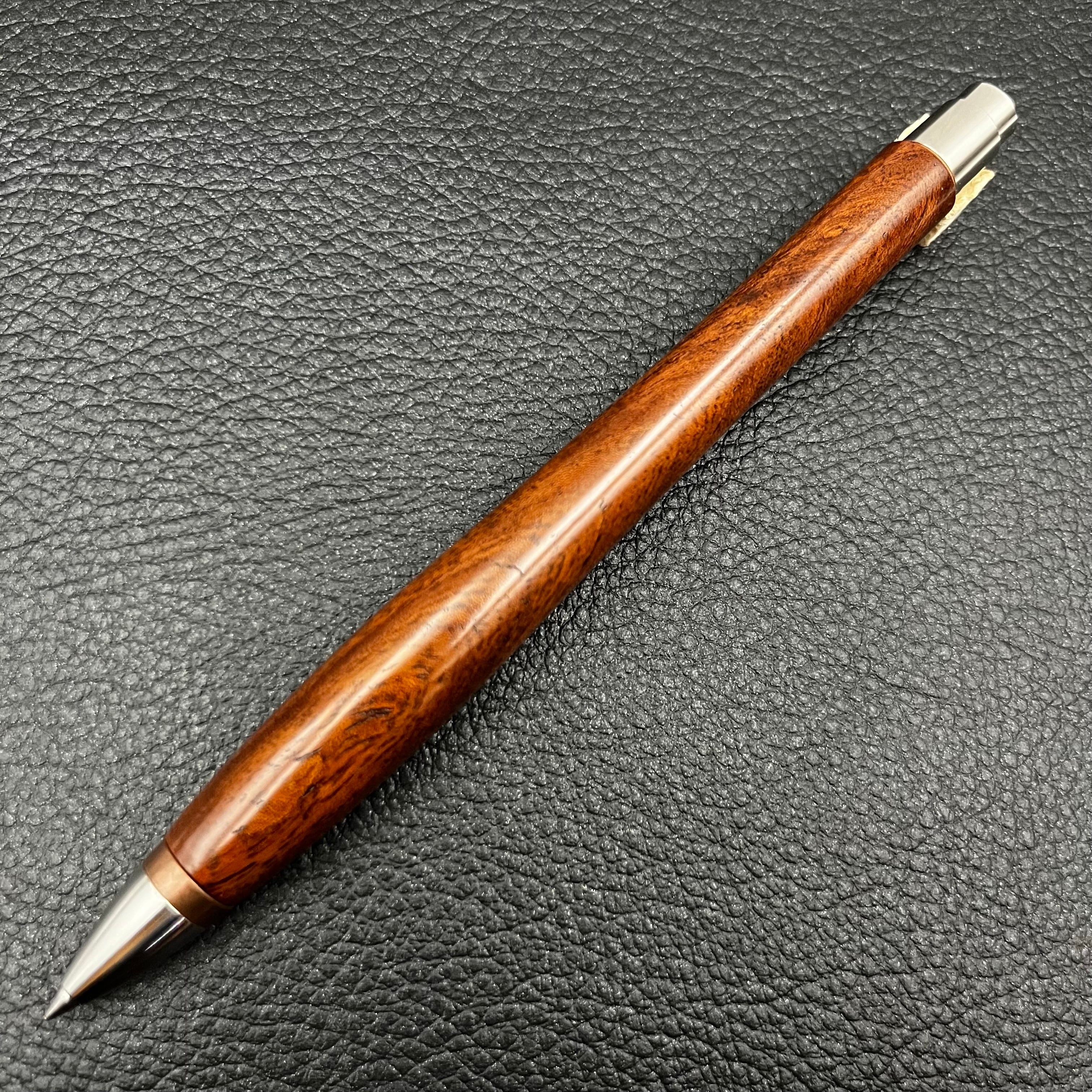 ボールペンのノックシステムは、ドイツ最高のクリックメカニズムを採用してあります。このメカニズムはユニークな機構のため、クリックしたときのカチカチ音が静かで、どんな場所でも気兼ねなく使うことができます。滑らかに動くこのプッシュ感覚を一度味わうと他には戻れなくなってしまうほどの魅力があります。 100分の1単位の加工精度で削り出されたペン先は、軸ブレも全くありません。