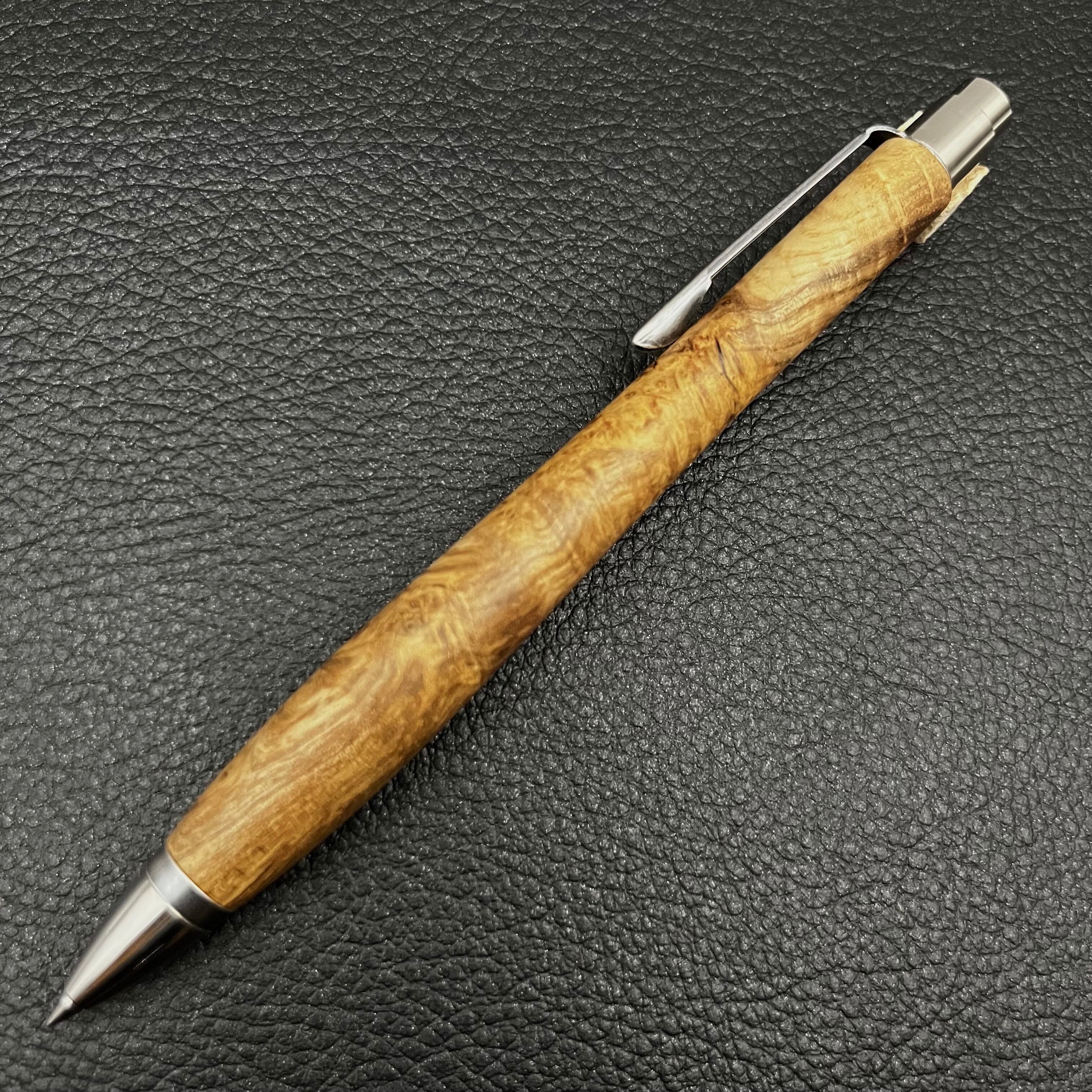 ボールペンのノックシステムは、ドイツ最高のクリックメカニズムを採用してあります。このメカニズムはユニークな機構のため、クリックしたときのカチカチ音が静かで、どんな場所でも気兼ねなく使うことができます。滑らかに動くこのプッシュ感覚を一度味わうと他には戻れなくなってしまうほどの魅力があります。 100分の1単位の加工精度で削り出されたペン先は、軸ブレも全くありません。