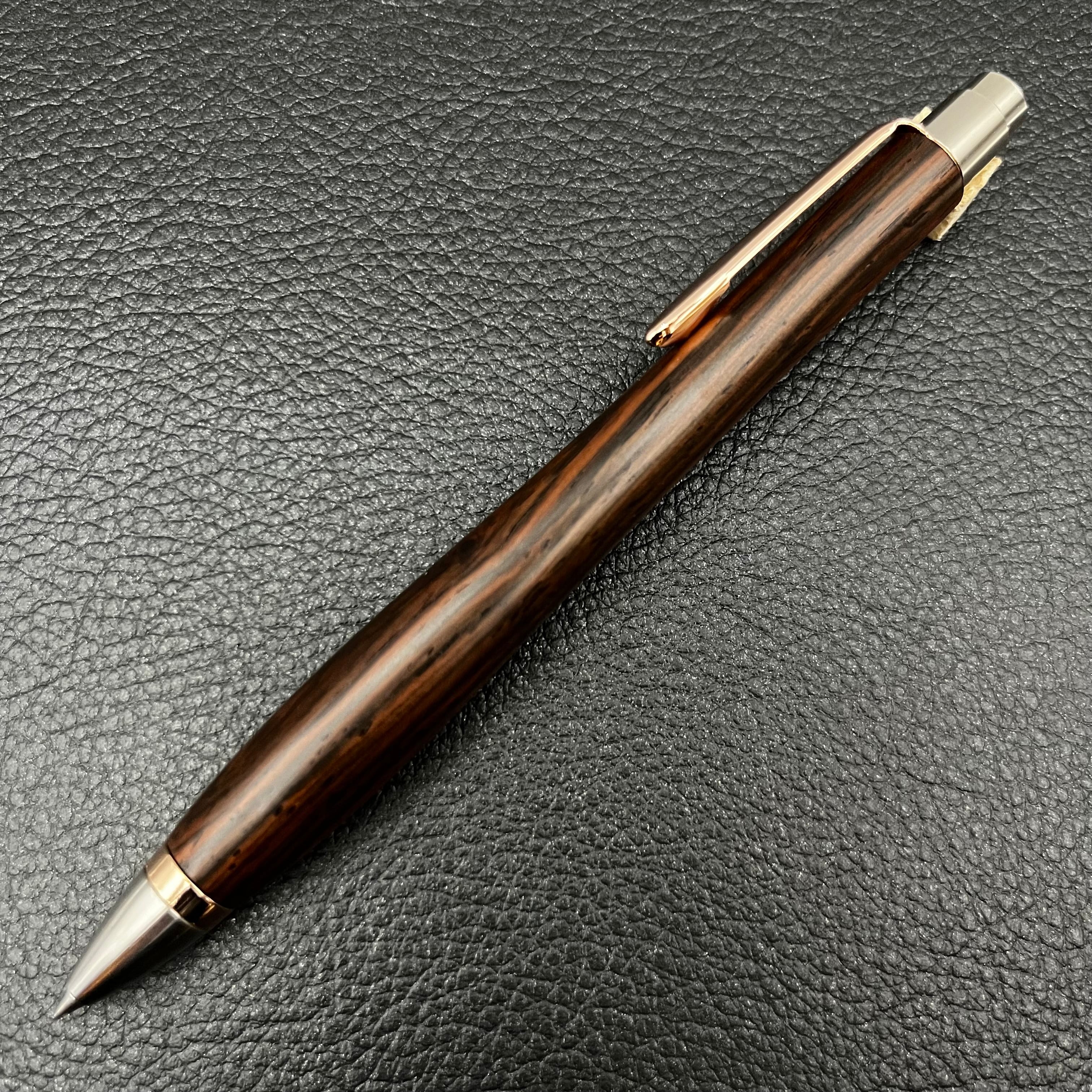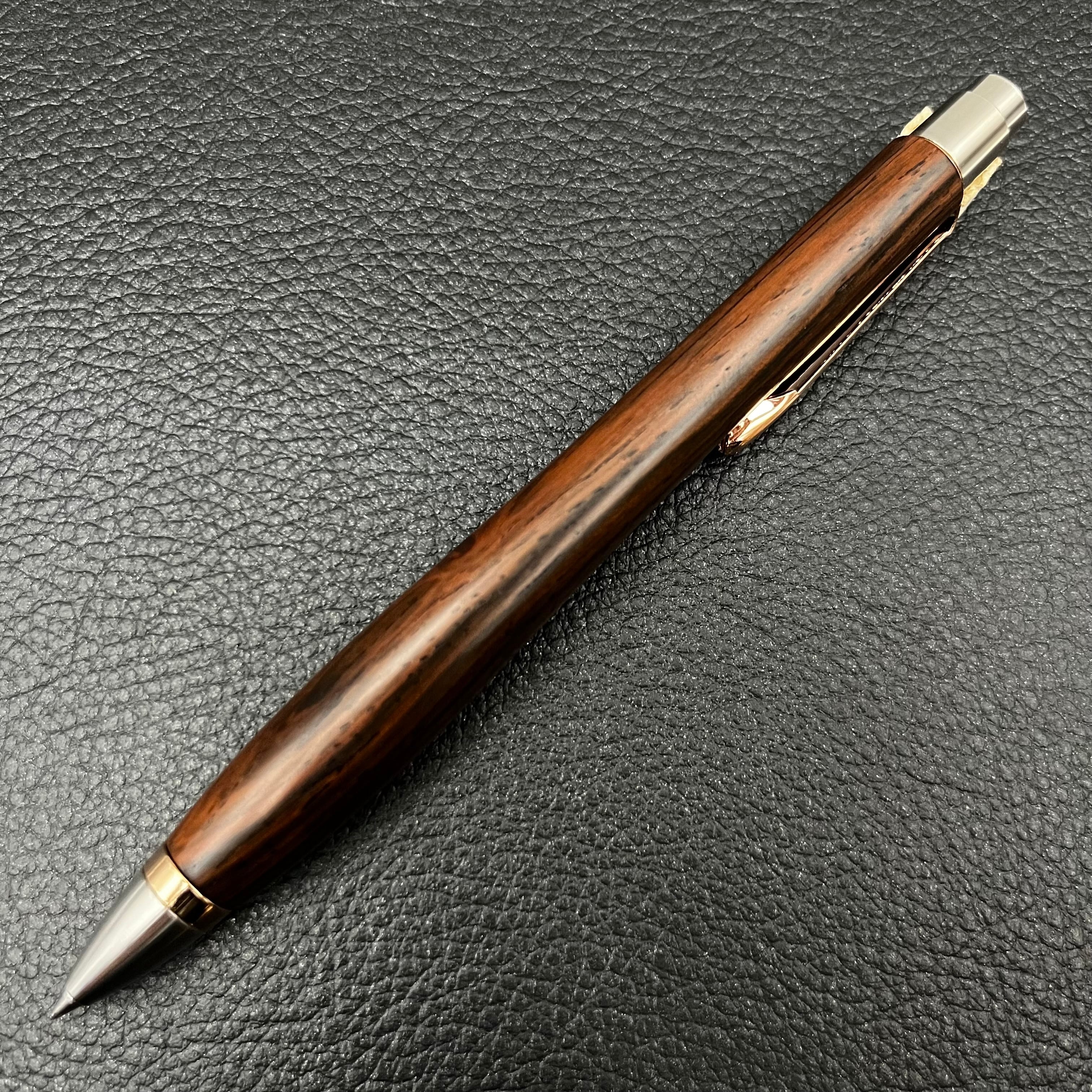 ボールペンのノックシステムは、ドイツ最高のクリックメカニズムを採用してあります。このメカニズムはユニークな機構のため、クリックしたときのカチカチ音が静かで、どんな場所でも気兼ねなく使うことができます。滑らかに動くこのプッシュ感覚を一度味わうと他には戻れなくなってしまうほどの魅力があります。 100分の1単位の加工精度で削り出されたペン先は、軸ブレも全くありません。