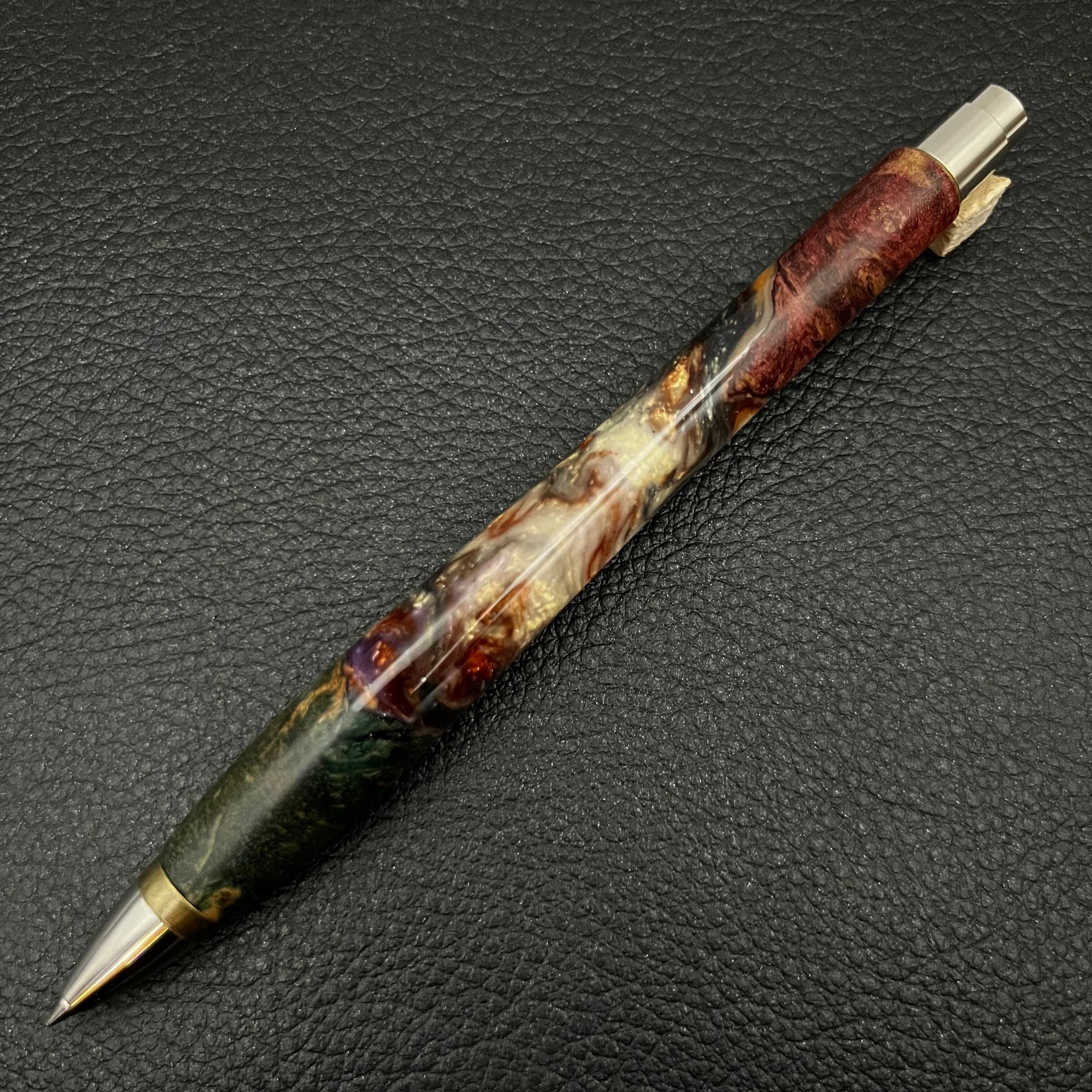 ボールペンのノックシステムは、ドイツ最高のクリックメカニズムを採用してあります。このメカニズムはユニークな機構のため、クリックしたときのカチカチ音が静かで、どんな場所でも気兼ねなく使うことができます。滑らかに動くこのプッシュ感覚を一度味わうと他には戻れなくなってしまうほどの魅力があります。 100分の1単位の加工精度で削り出されたペン先は、軸ブレも全くありません。