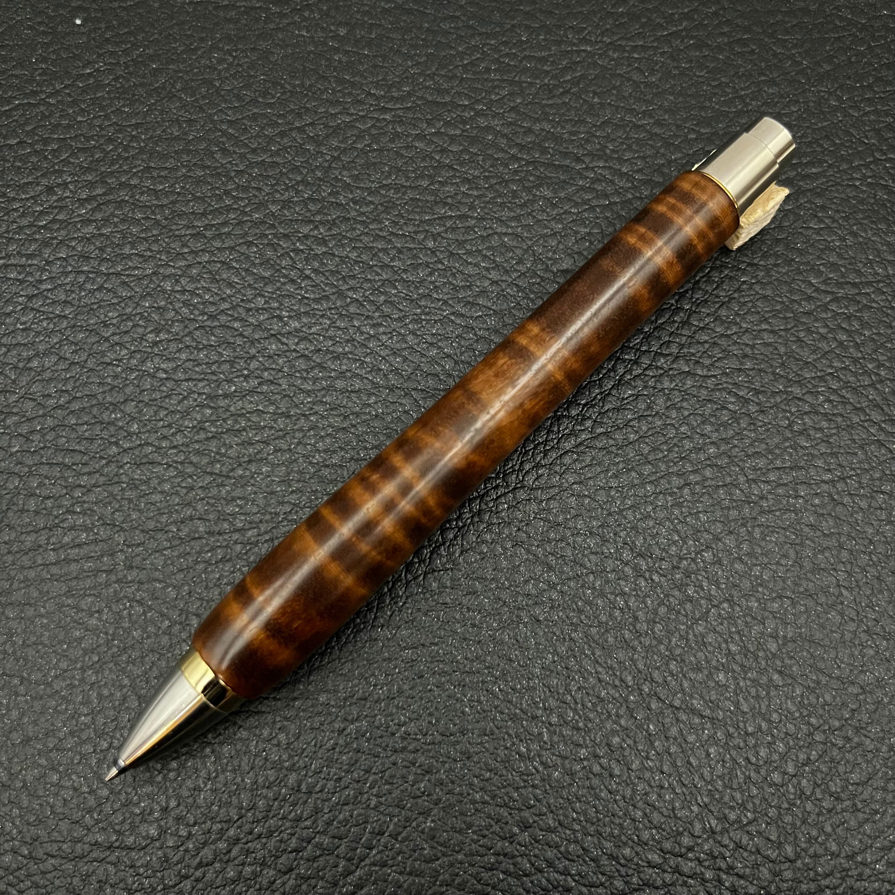ボールペンのノックシステムは、ドイツ最高のクリックメカニズムを採用してあります。このメカニズムはユニークな機構のため、クリックしたときのカチカチ音が静かで、どんな場所でも気兼ねなく使うことができます。滑らかに動くこのプッシュ感覚を一度味わうと他には戻れなくなってしまうほどの魅力があります。 高級ステンレス材を100分の1単位の加工精度で削り出された口金により芯ブレも全くありません。内部のアルミを使ったリフィルアダプターもオリジナルです。