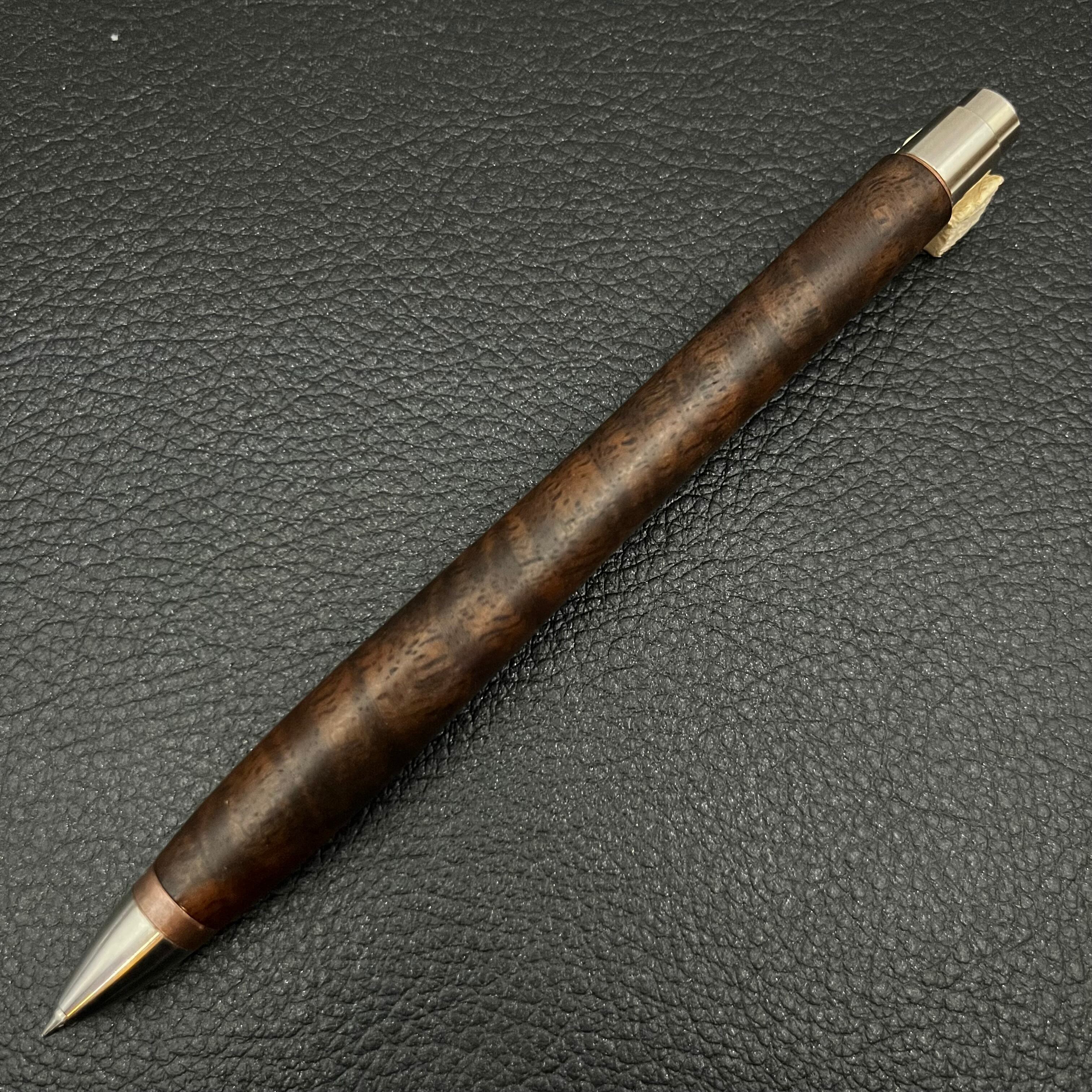 ボールペンのノックシステムは、ドイツ最高のクリックメカニズムを採用してあります。このメカニズムはユニークな機構のため、クリックしたときのカチカチ音が静かで、どんな場所でも気兼ねなく使うことができます。滑らかに動くこのプッシュ感覚を一度味わうと他には戻れなくなってしまうほどの魅力があります。 100分の1単位の加工精度で削り出されたペン先は、軸ブレも全くありません。