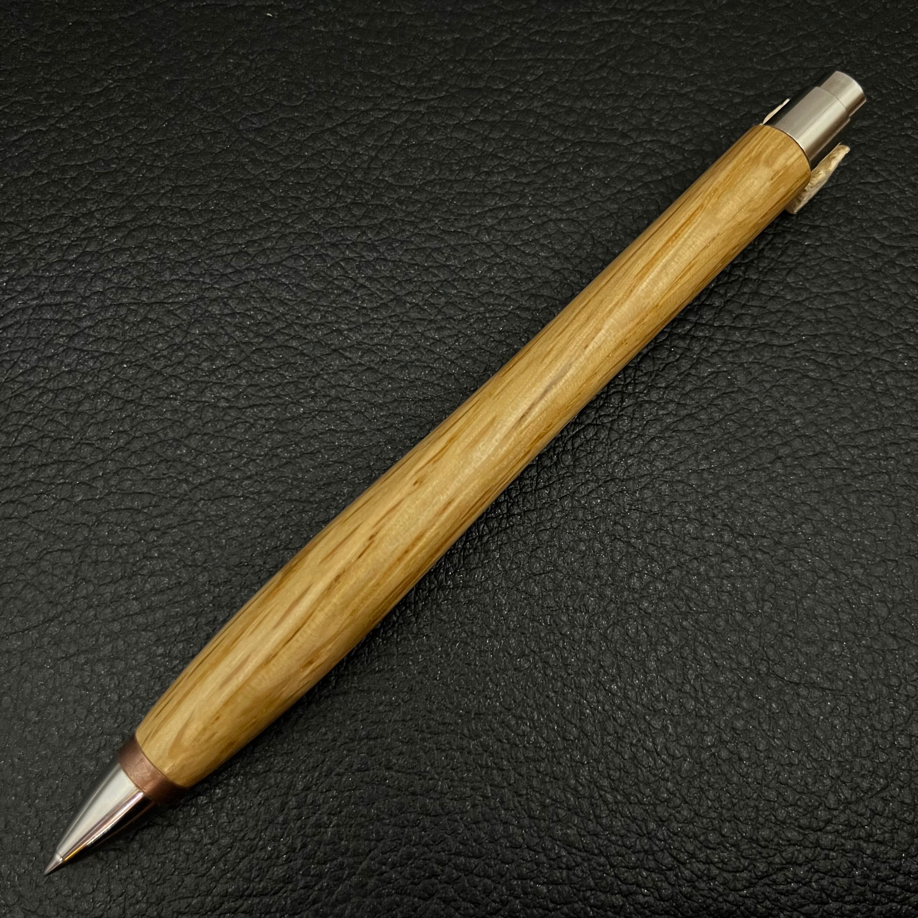 ボールペンのノックシステムは、ドイツ最高のクリックメカニズムを採用してあります。このメカニズムはユニークな機構のため、クリックしたときのカチカチ音が静かで、どんな場所でも気兼ねなく使うことができます。滑らかに動くこのプッシュ感覚を一度味わうと他には戻れなくなってしまうほどの魅力があります。 100分の1単位の加工精度で削り出されたペン先は、軸ブレも全くありません。