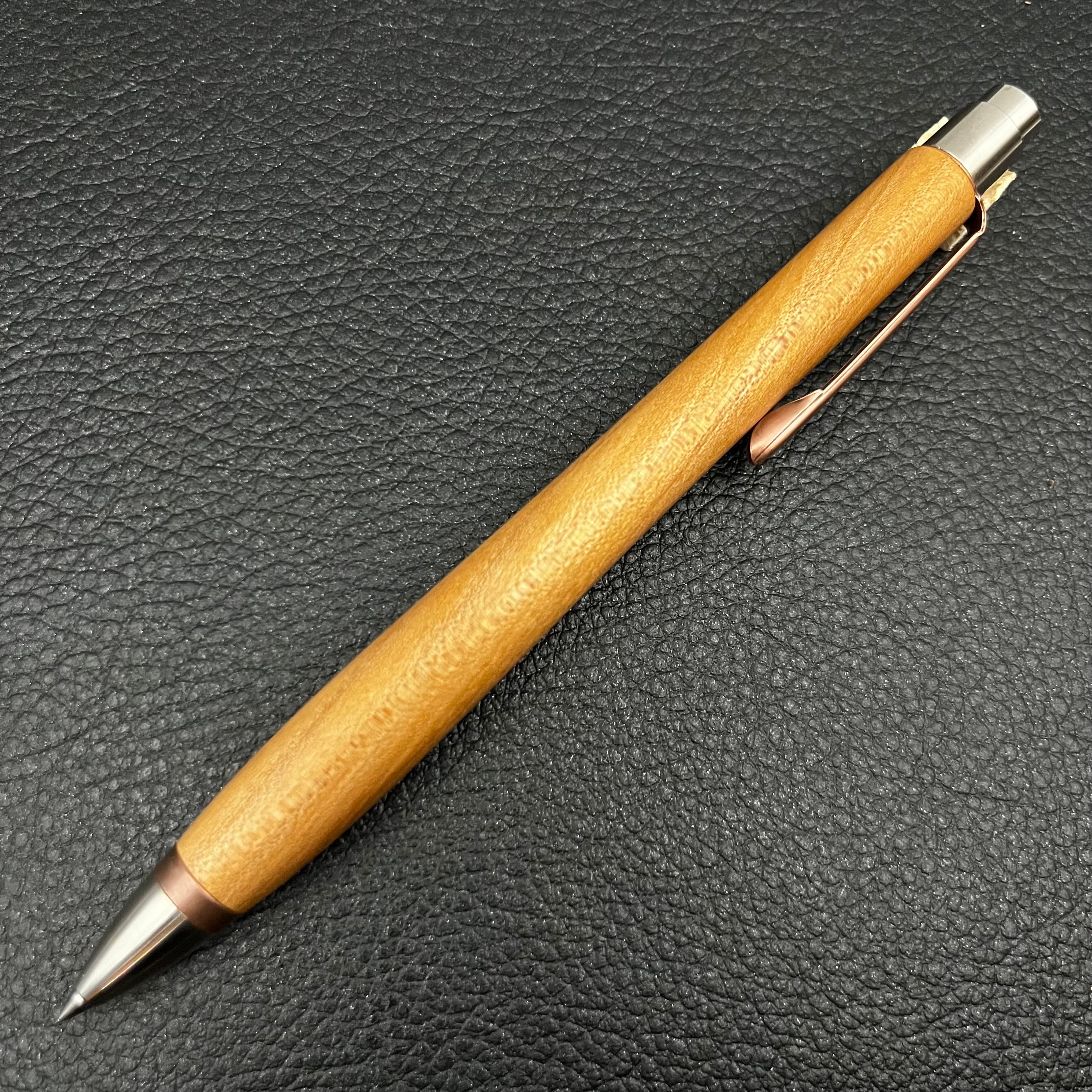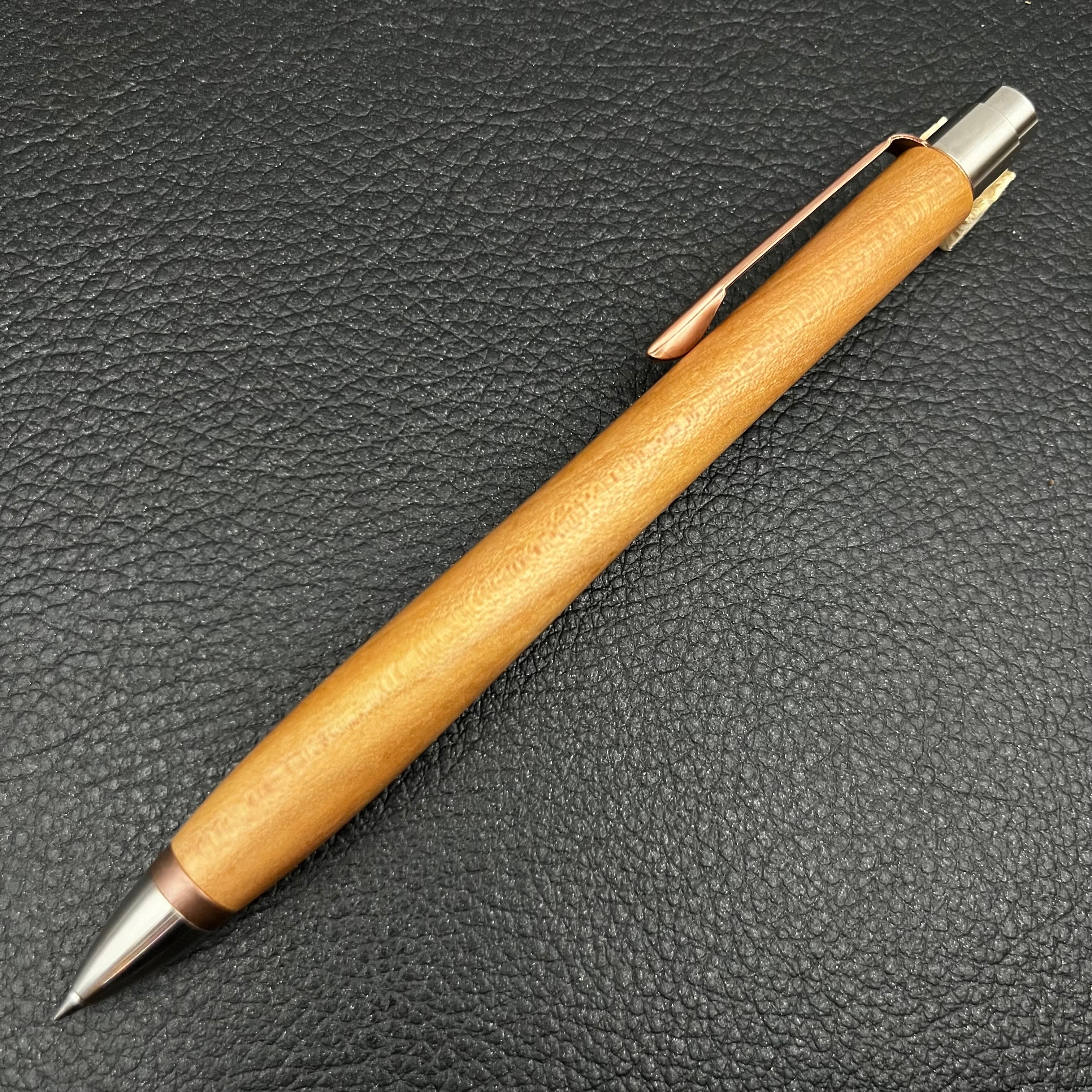 ボールペンのノックシステムは、ドイツ最高のクリックメカニズムを採用してあります。このメカニズムはユニークな機構のため、クリックしたときのカチカチ音が静かで、どんな場所でも気兼ねなく使うことができます。滑らかに動くこのプッシュ感覚を一度味わうと他には戻れなくなってしまうほどの魅力があります。 100分の1単位の加工精度で削り出されたペン先は、軸ブレも全くありません。