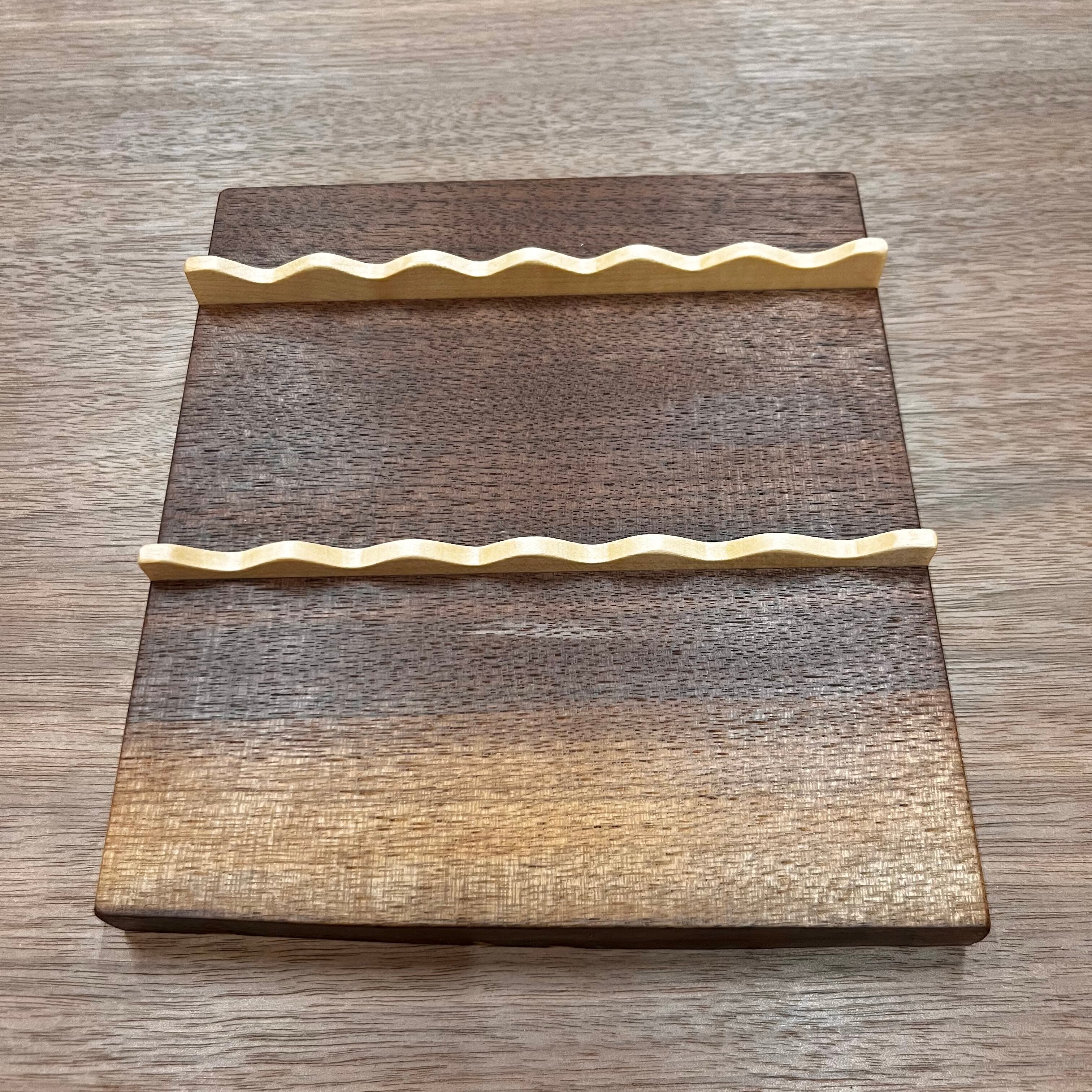 デスクの上でペンを6本飾ることができる、木の温かみや表情をそのまま活かした6本置きペントレイです。ペンを優しく支えれるように黒い曲線部分は黒檀を加工しています。