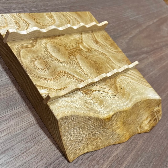 耳付き一枚板を天然オイルで仕上げてあり、ペンの長さや太さが違っても置けるように作られています。
