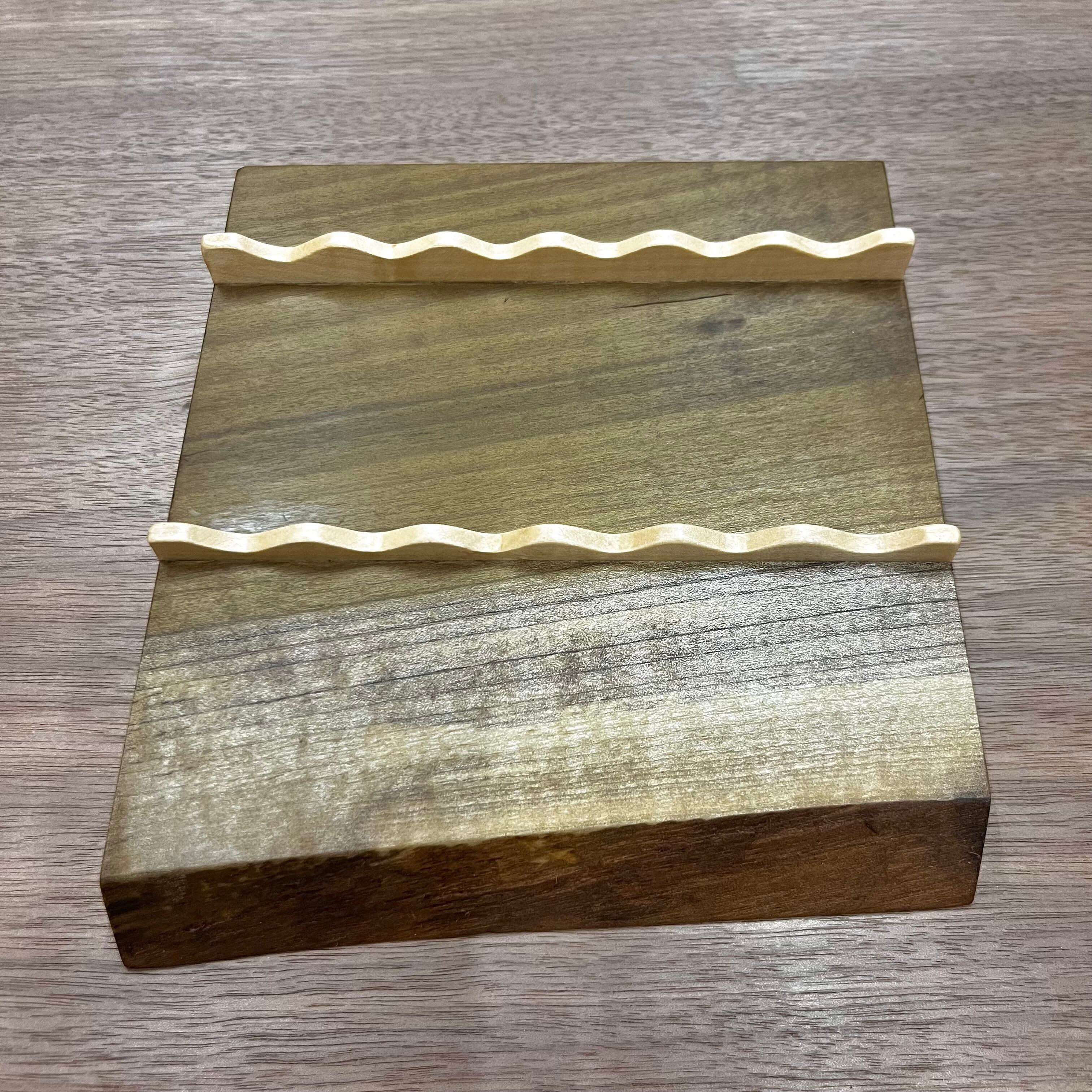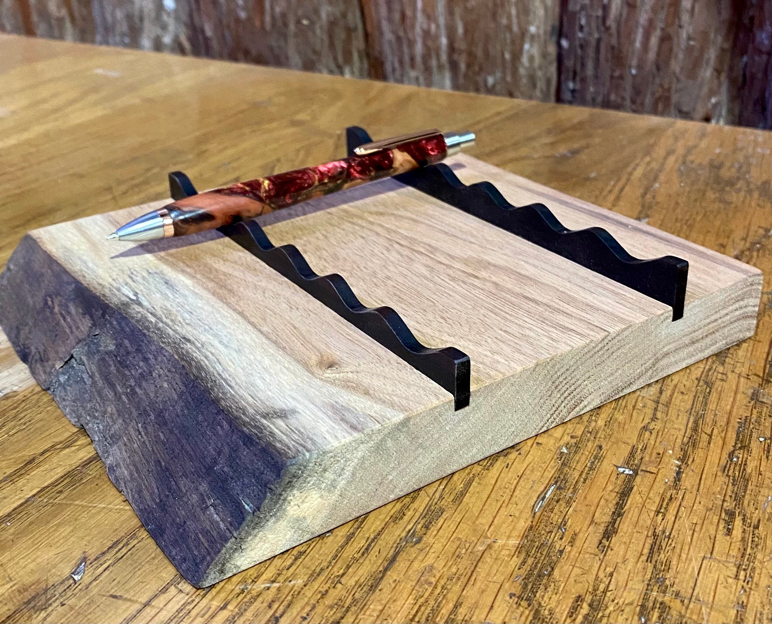 耳付き一枚板を天然オイルで仕上げてあり、ペンの長さや太さが違っても置けるように作られています。