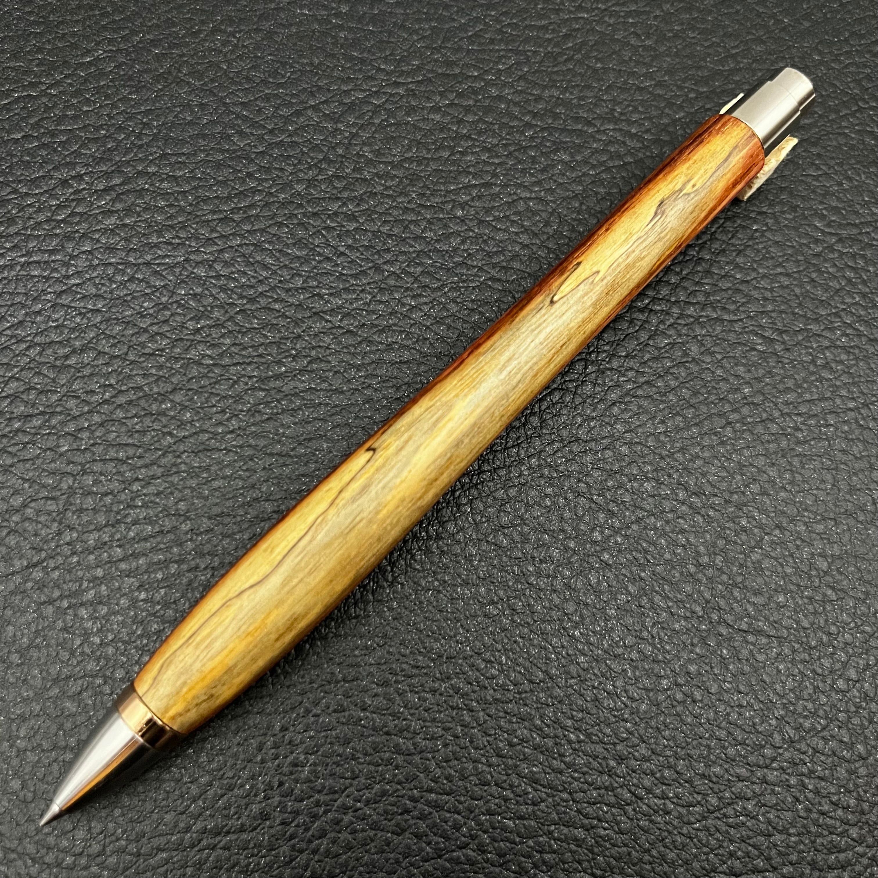 ボールペンのノックシステムは、ドイツ最高のクリックメカニズムを採用してあります。このメカニズムはユニークな機構のため、クリックしたときのカチカチ音が静かで、どんな場所でも気兼ねなく使うことができます。滑らかに動くこのプッシュ感覚を一度味わうと他には戻れなくなってしまうほどの魅力があります。 100分の1単位の加工精度で削り出されたペン先は、軸ブレも全くありません。