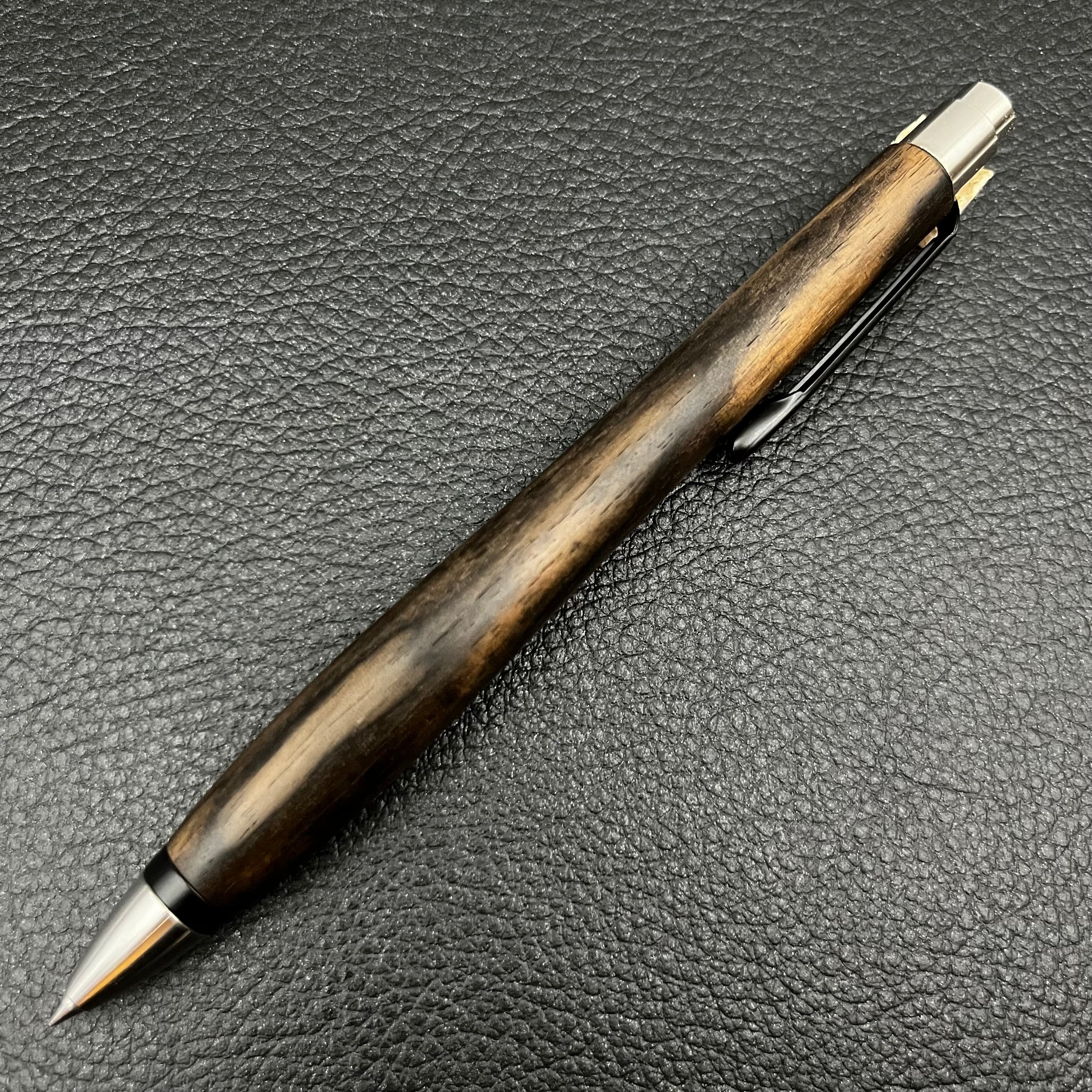 ボールペンのノックシステムは、ドイツ最高のクリックメカニズムを採用してあります。このメカニズムはユニークな機構のため、クリックしたときのカチカチ音が静かで、どんな場所でも気兼ねなく使うことができます。滑らかに動くこのプッシュ感覚を一度味わうと他には戻れなくなってしまうほどの魅力があります。 100分の1単位の加工精度で削り出されたペン先は、軸ブレも全くありません。