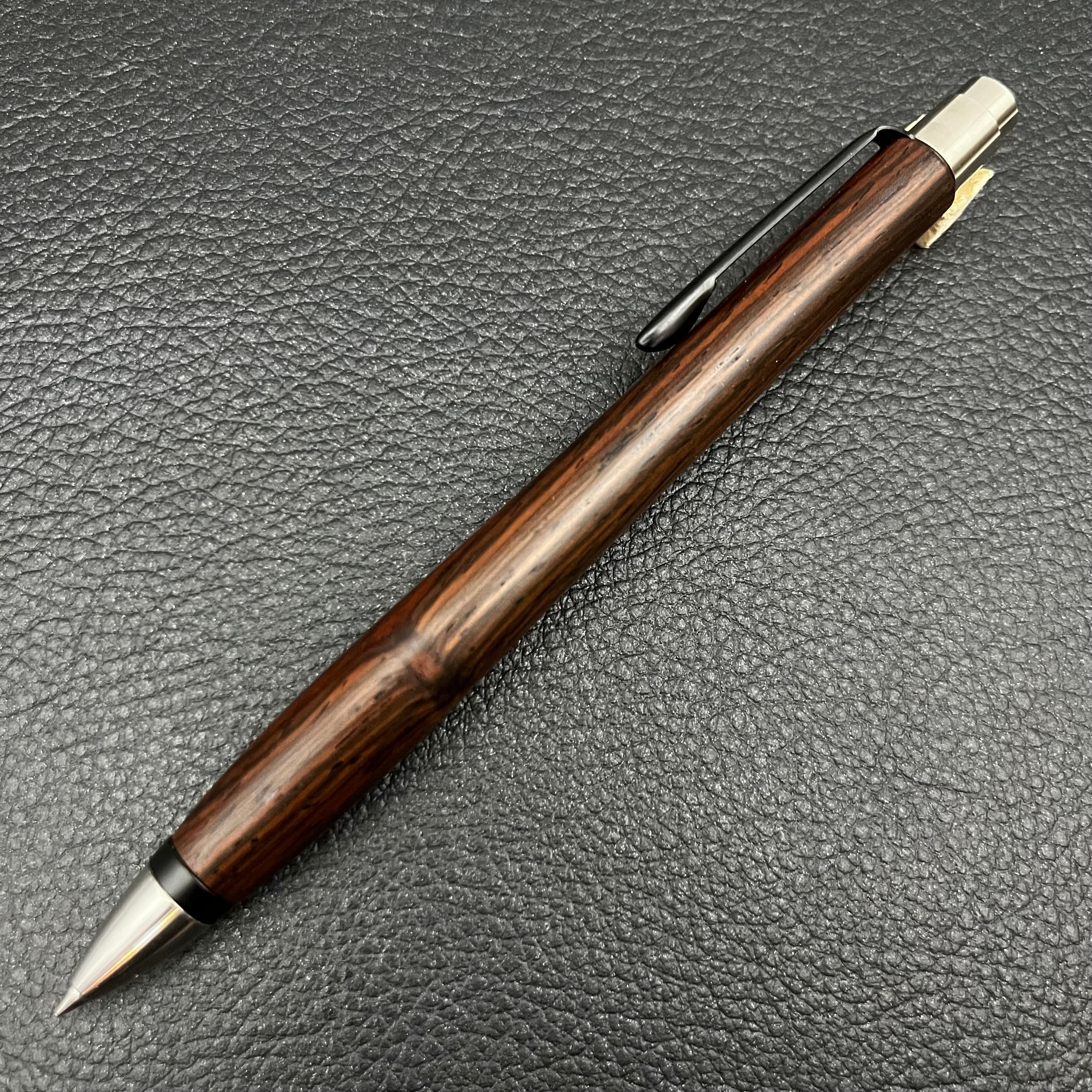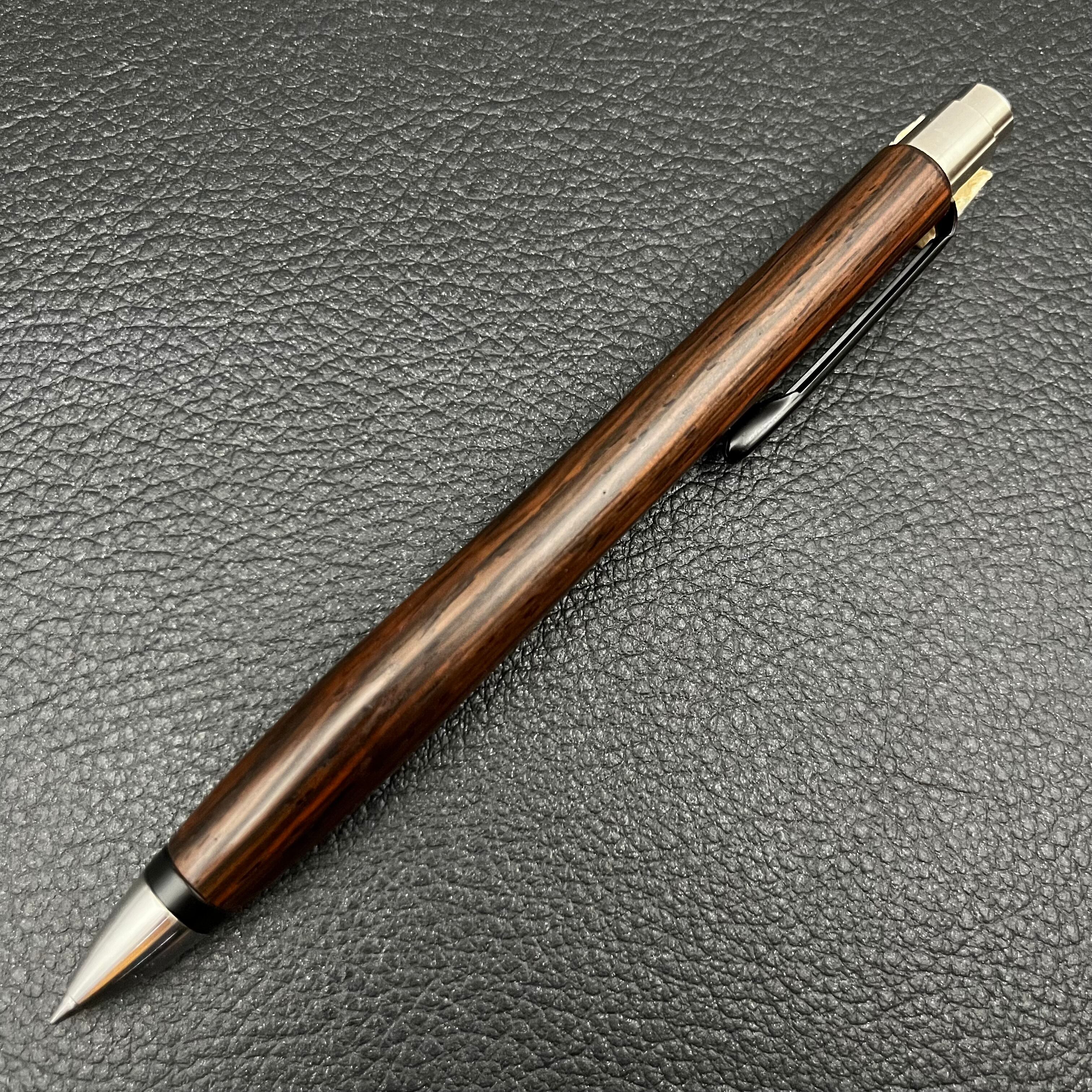ボールペンのノックシステムは、ドイツ最高のクリックメカニズムを採用してあります。このメカニズムはユニークな機構のため、クリックしたときのカチカチ音が静かで、どんな場所でも気兼ねなく使うことができます。滑らかに動くこのプッシュ感覚を一度味わうと他には戻れなくなってしまうほどの魅力があります。 100分の1単位の加工精度で削り出されたペン先は、軸ブレも全くありません。