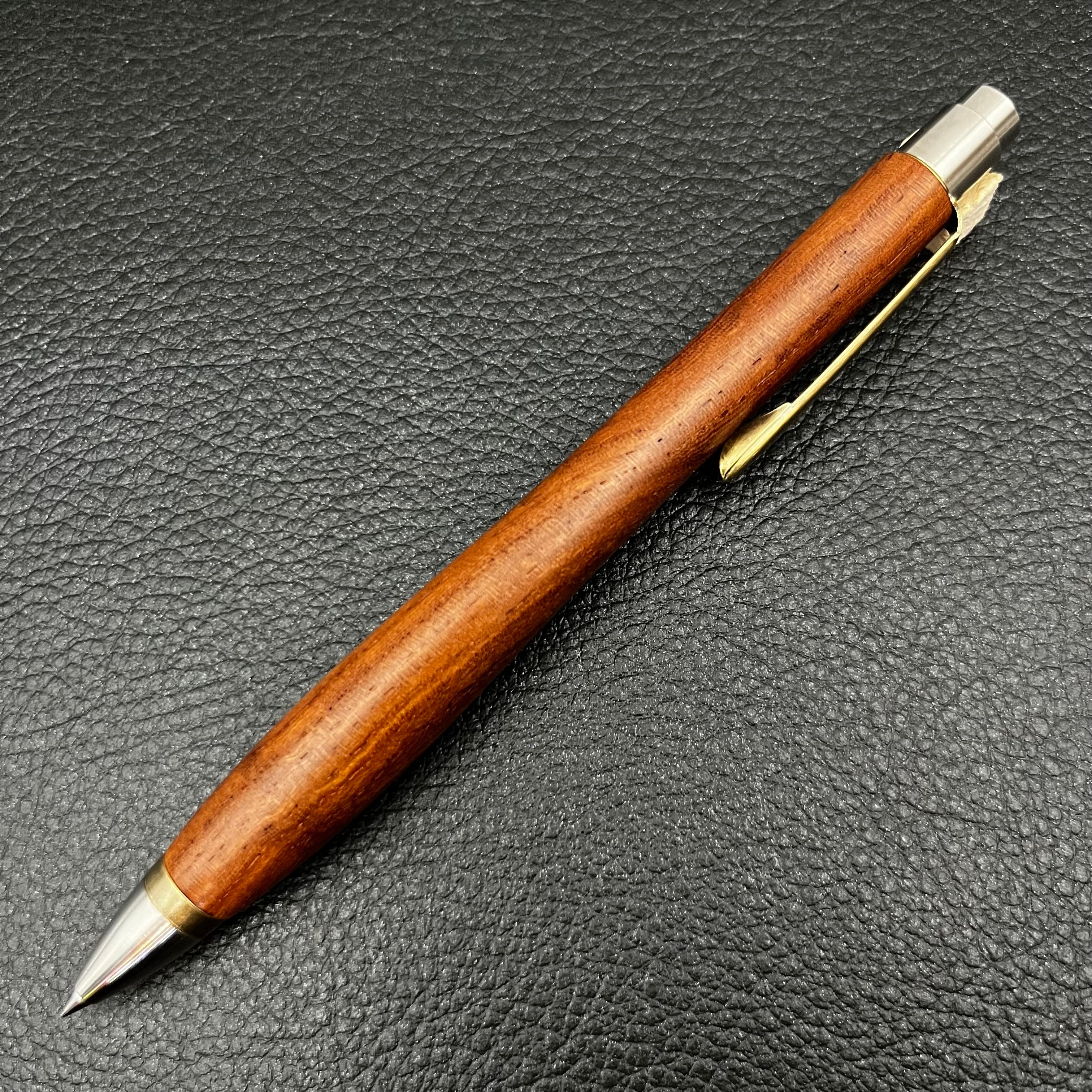 ボールペンのノックシステムは、ドイツ最高のクリックメカニズムを採用してあります。このメカニズムはユニークな機構のため、クリックしたときのカチカチ音が静かで、どんな場所でも気兼ねなく使うことができます。滑らかに動くこのプッシュ感覚を一度味わうと他には戻れなくなってしまうほどの魅力があります。 100分の1単位の加工精度で削り出されたペン先は、軸ブレも全くありません。
