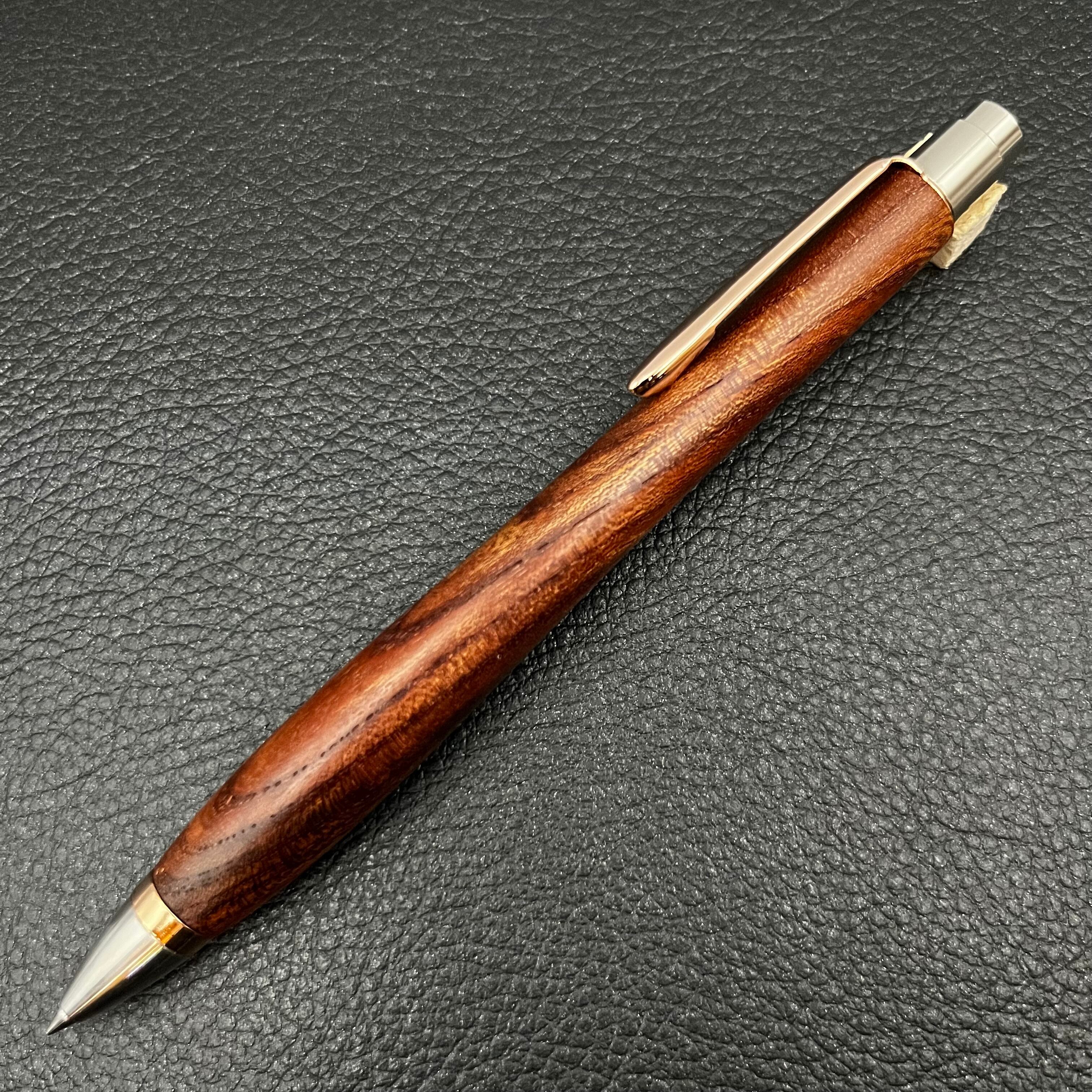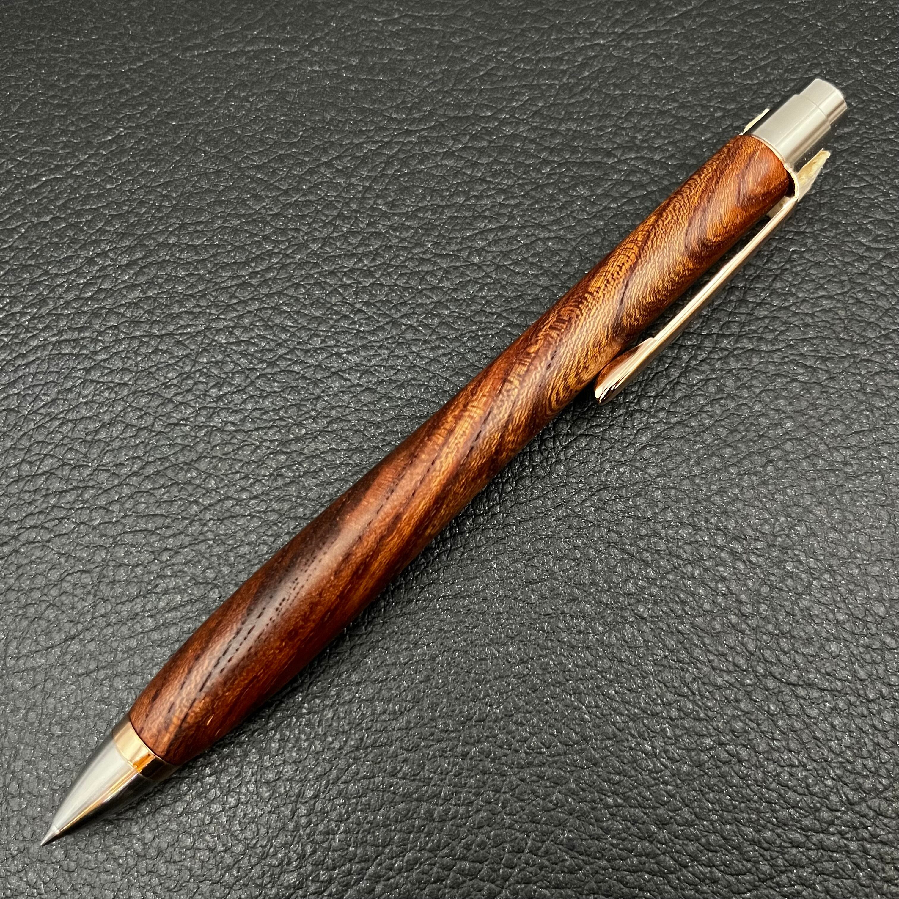 ペンに使った木は、推定50年以上も前に雷に打たれた大枝を強剪定したもので、巨木と雷の影響で普通の欅と色合いが全く違い濃いです。