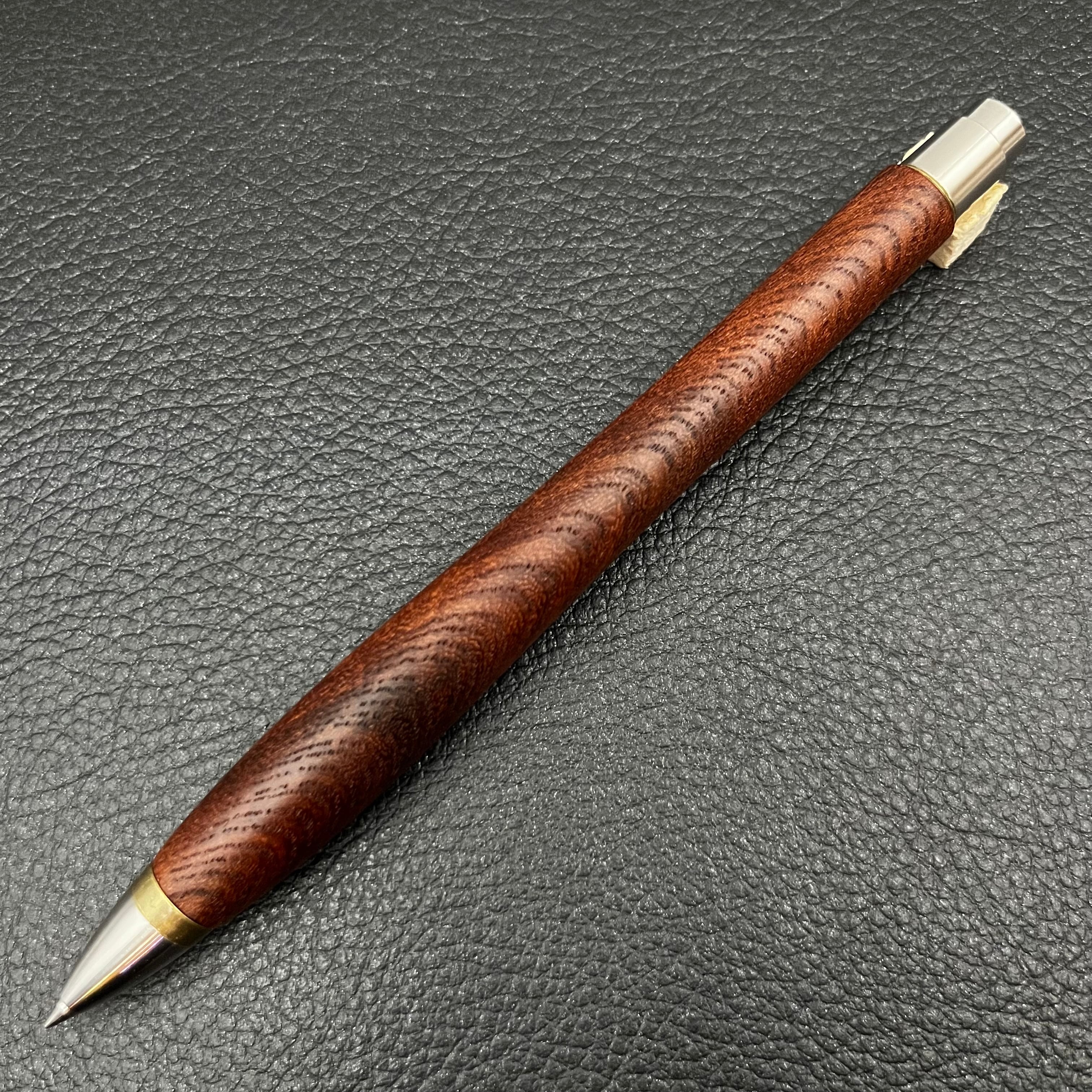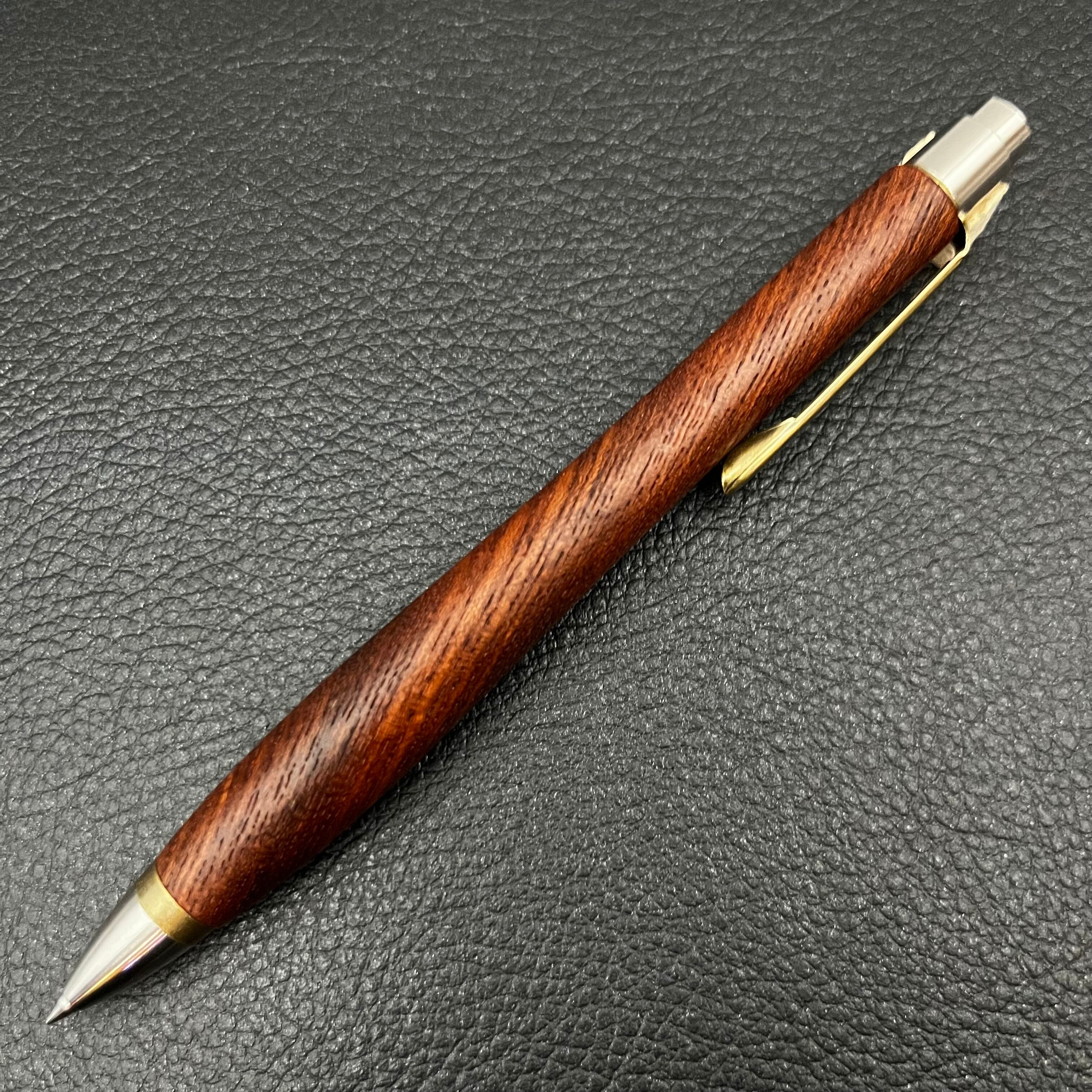 ペンに使った木は、推定50年以上も前に雷に打たれた大枝を強剪定したもので、巨木と雷の影響で普通の欅と色合いが全く違い濃いです。