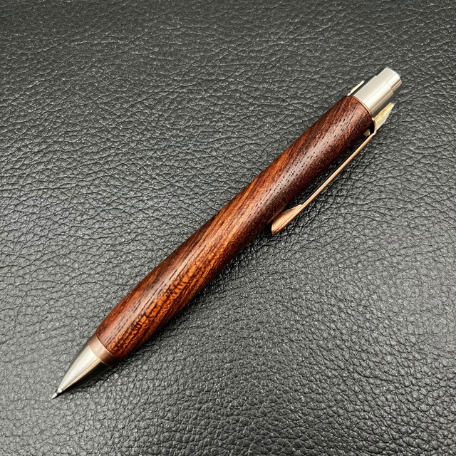 ペンに使った木は、推定50年以上も前に雷に打たれた大枝を強剪定したもので、巨木と雷の影響で普通の欅と色合いが全く違い濃いです。