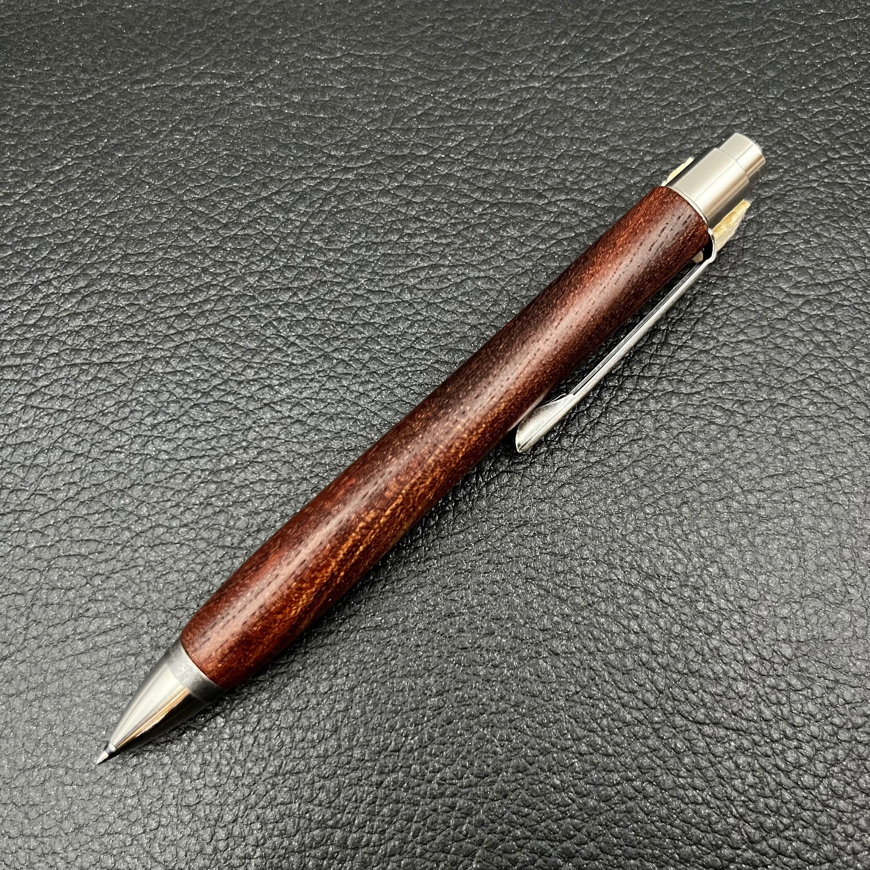 ペンに使った木は、推定50年以上も前に雷に打たれた大枝を強剪定したもので、巨木と雷の影響で普通の欅と色合いが全く違い濃いです。