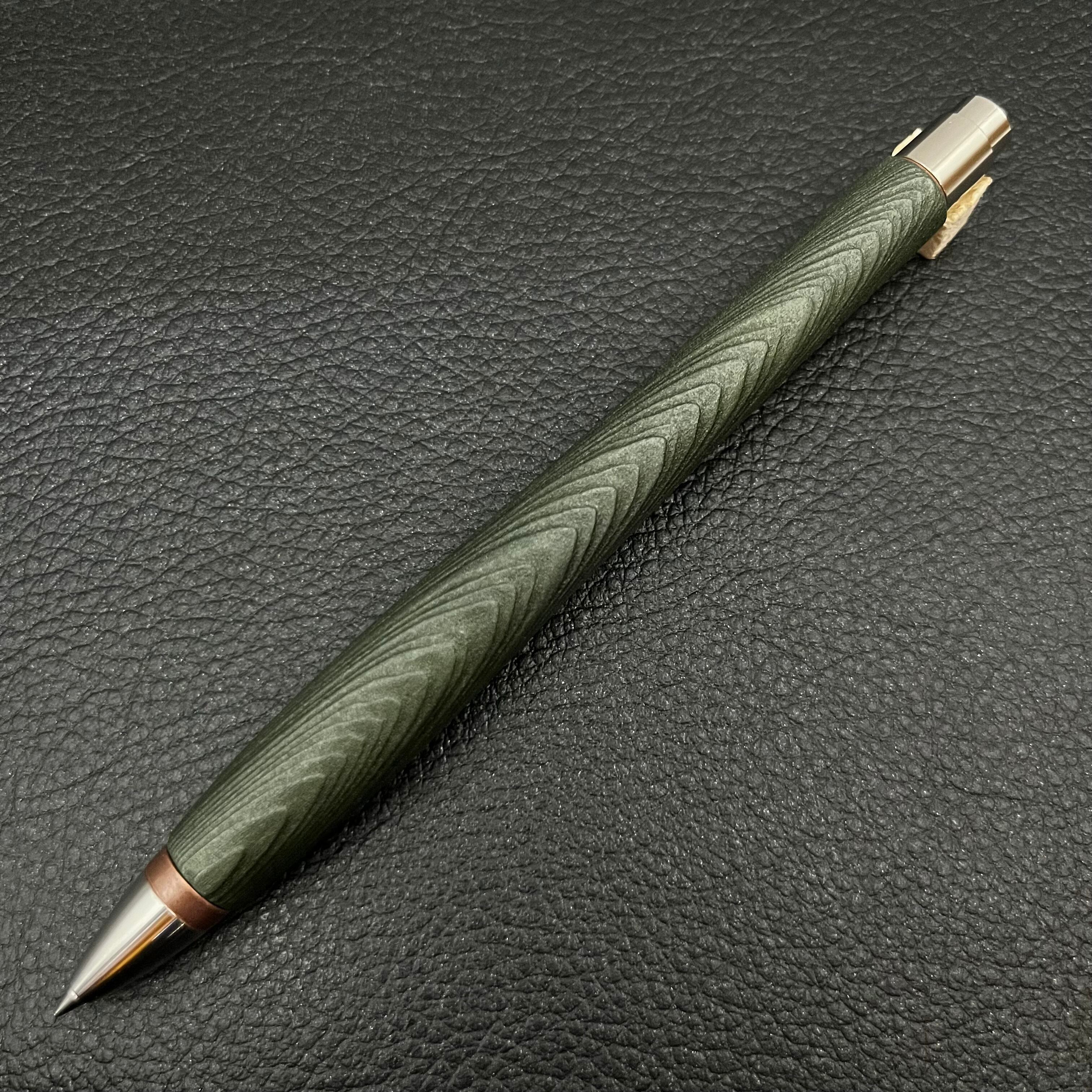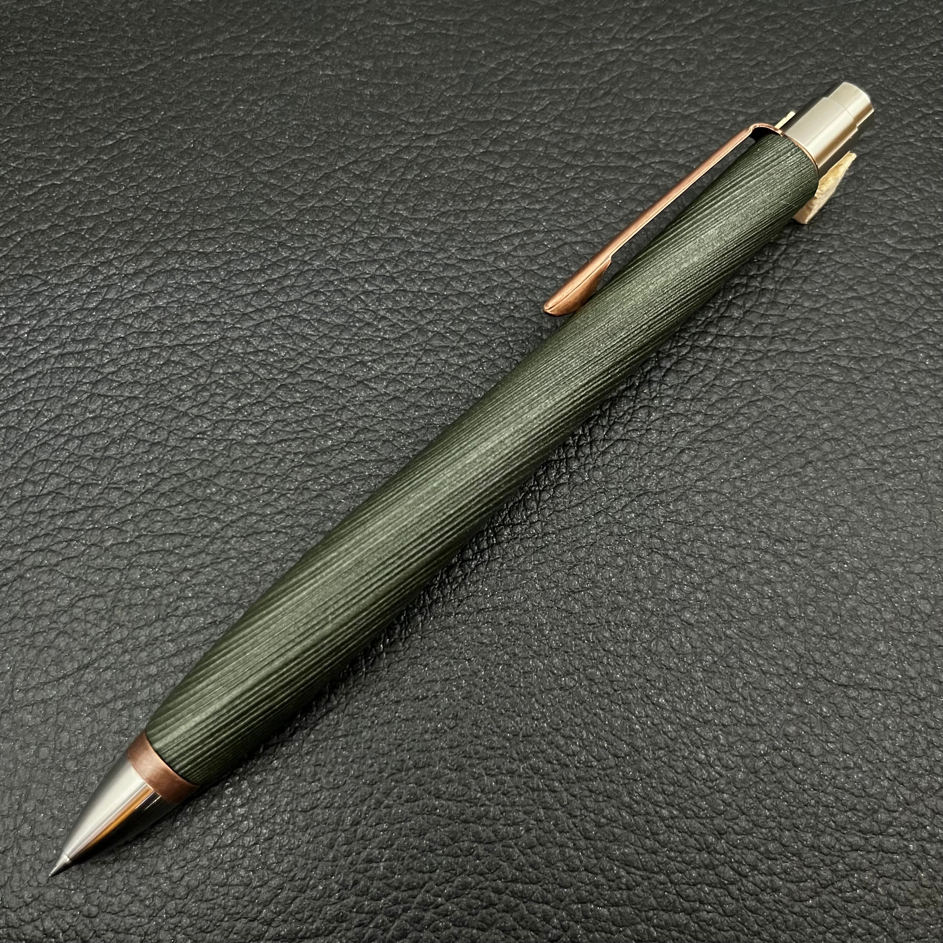 ボールペンのノックシステムは、ドイツ最高のクリックメカニズムを採用してあります。このメカニズムはユニークな機構のため、クリックしたときのカチカチ音が静かで、どんな場所でも気兼ねなく使うことができます。滑らかに動くこのプッシュ感覚を一度味わうと他には戻れなくなってしまうほどの魅力があります。 100分の1単位の加工精度で削り出されたペン先は、軸ブレも全くありません。