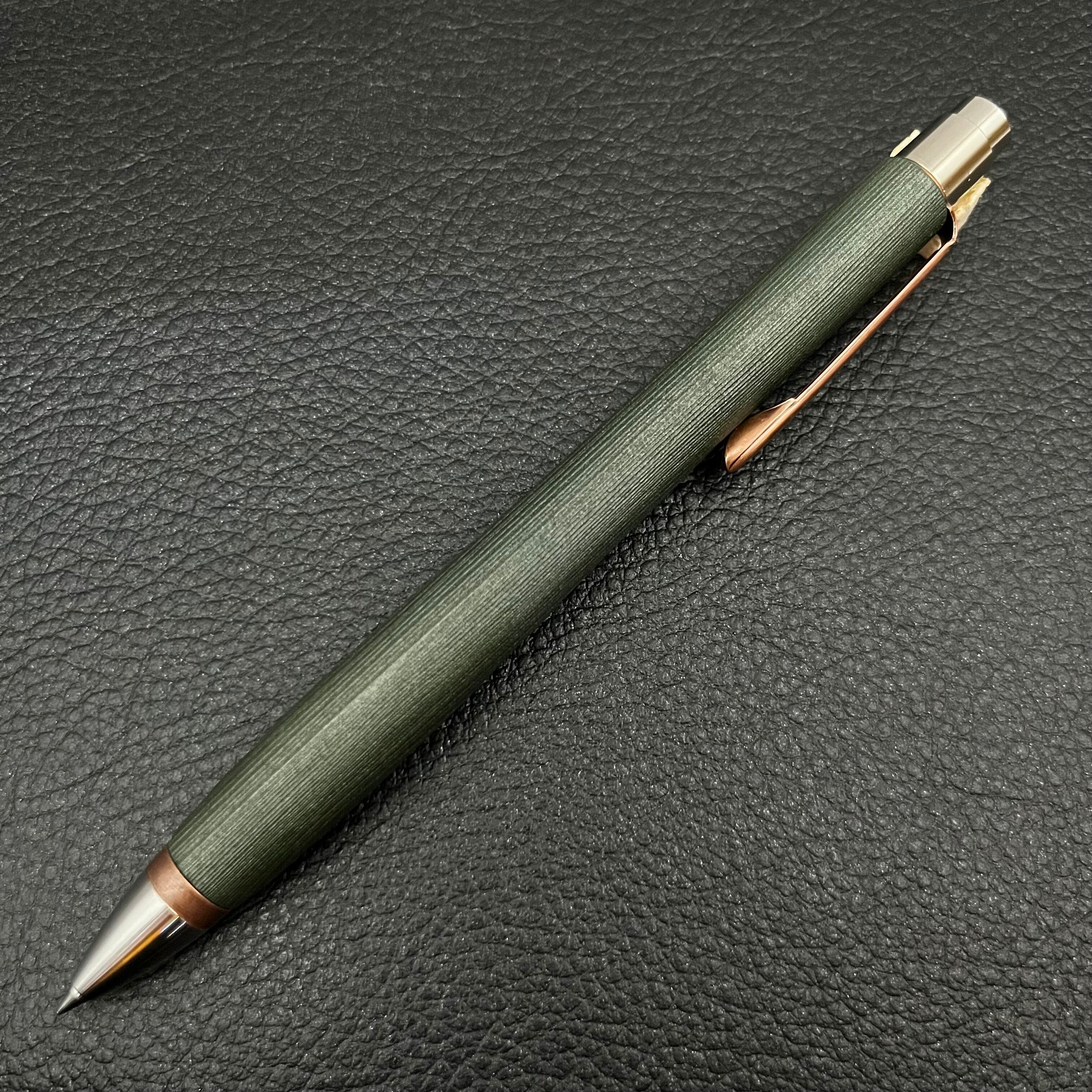 ボールペンのノックシステムは、ドイツ最高のクリックメカニズムを採用してあります。このメカニズムはユニークな機構のため、クリックしたときのカチカチ音が静かで、どんな場所でも気兼ねなく使うことができます。滑らかに動くこのプッシュ感覚を一度味わうと他には戻れなくなってしまうほどの魅力があります。 100分の1単位の加工精度で削り出されたペン先は、軸ブレも全くありません。