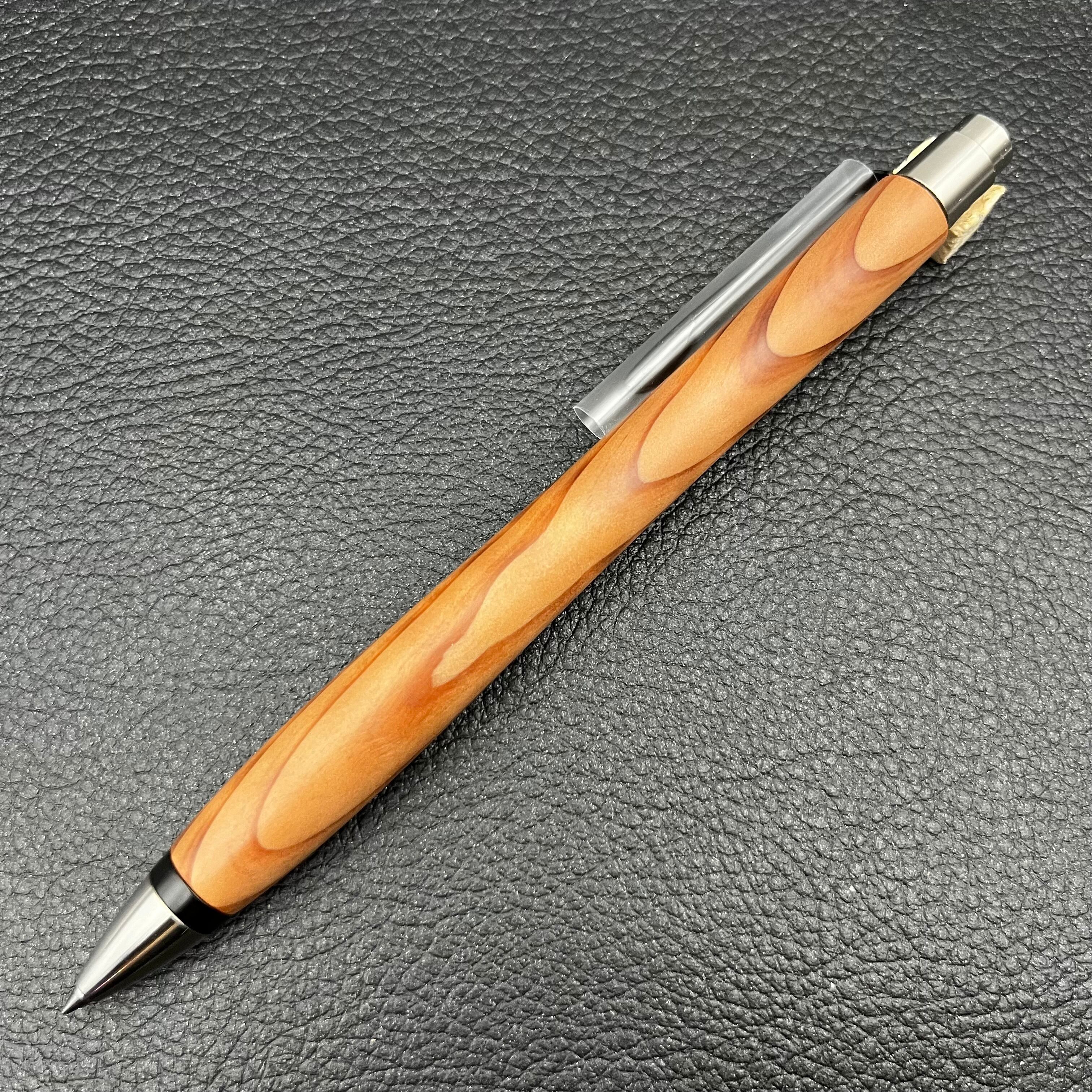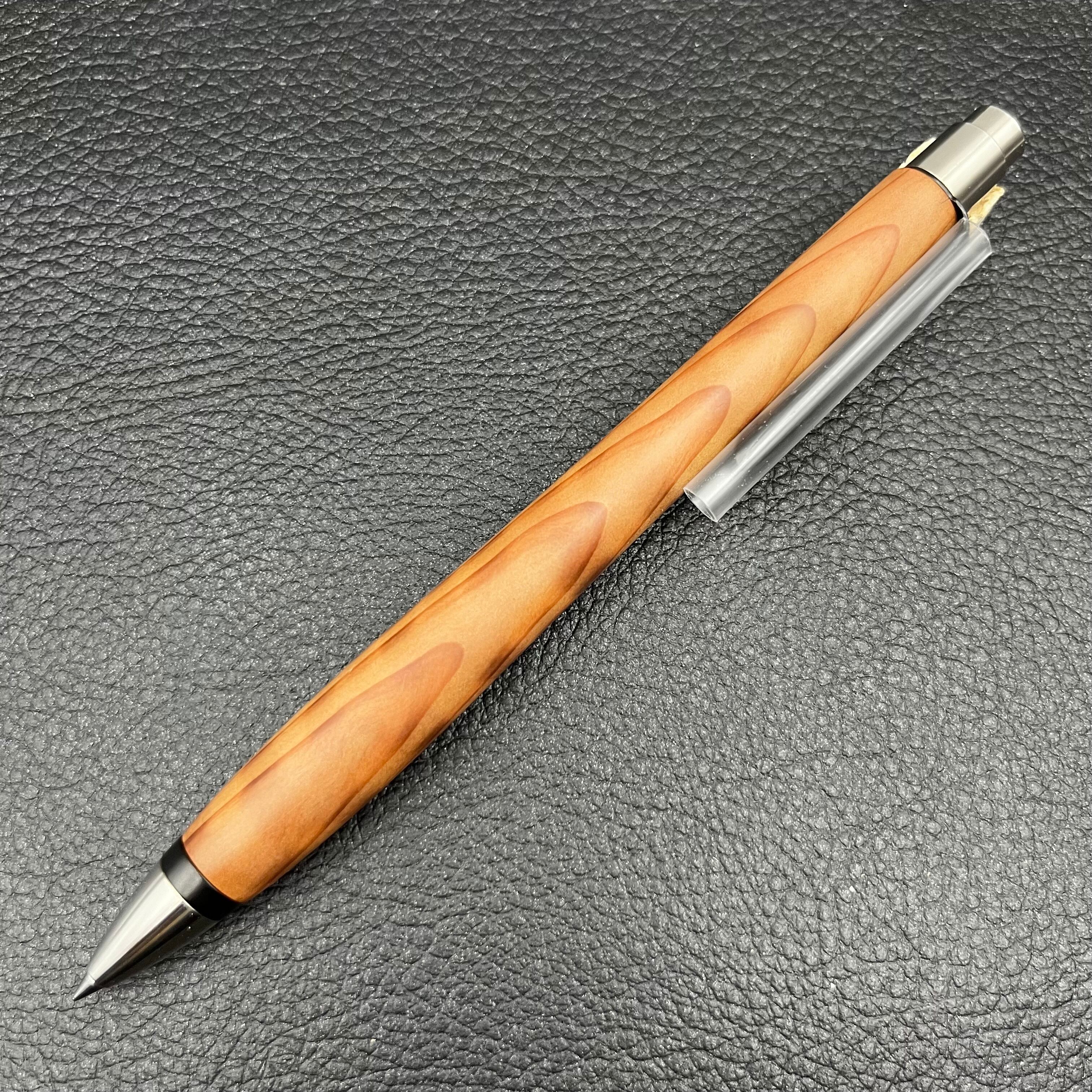 ボールペンのノックシステムは、ドイツ最高のクリックメカニズムを採用してあります。このメカニズムはユニークな機構のため、クリックしたときのカチカチ音が静かで、どんな場所でも気兼ねなく使うことができます。滑らかに動くこのプッシュ感覚を一度味わうと他には戻れなくなってしまうほどの魅力があります。 100分の1単位の加工精度で削り出されたペン先は、軸ブレも全くありません。