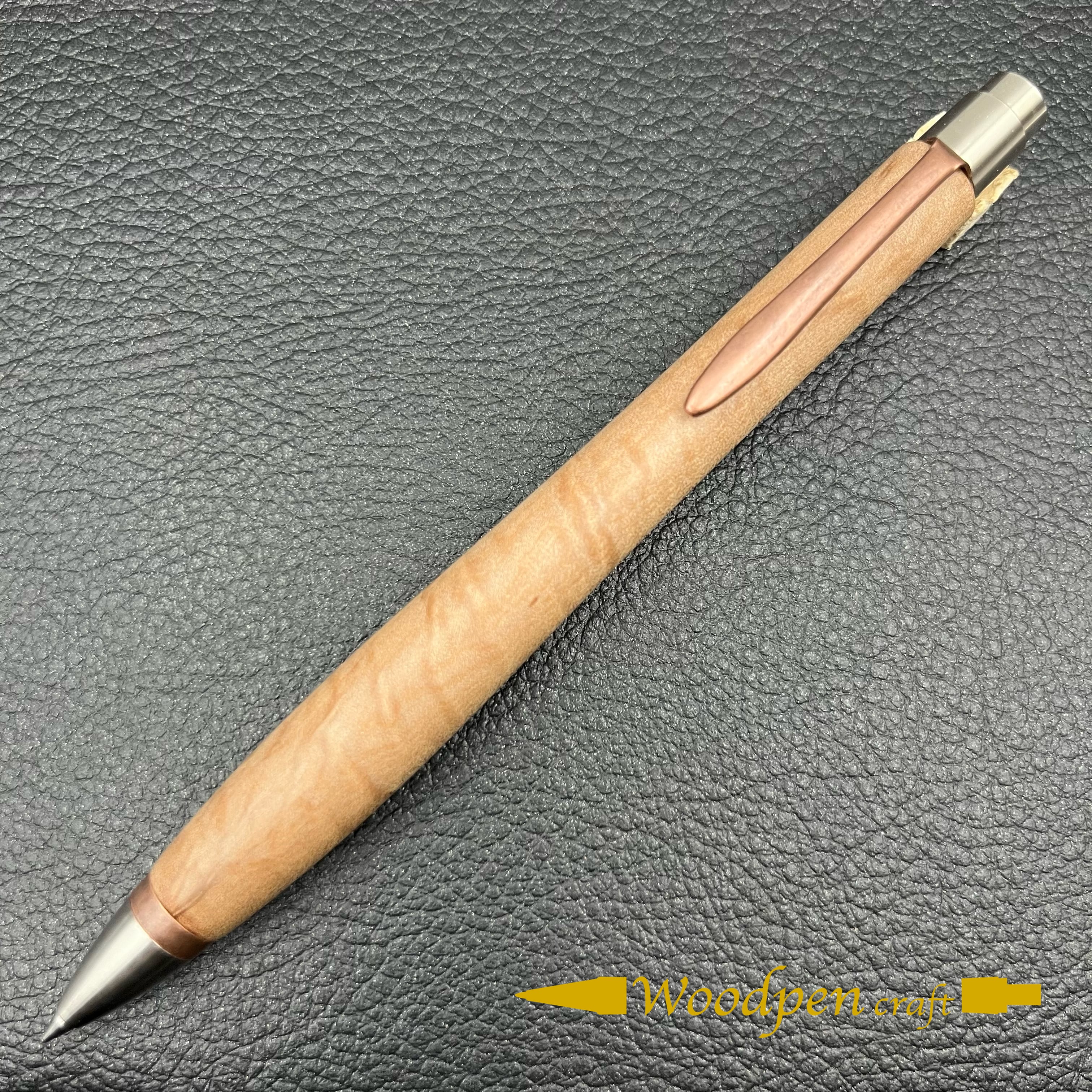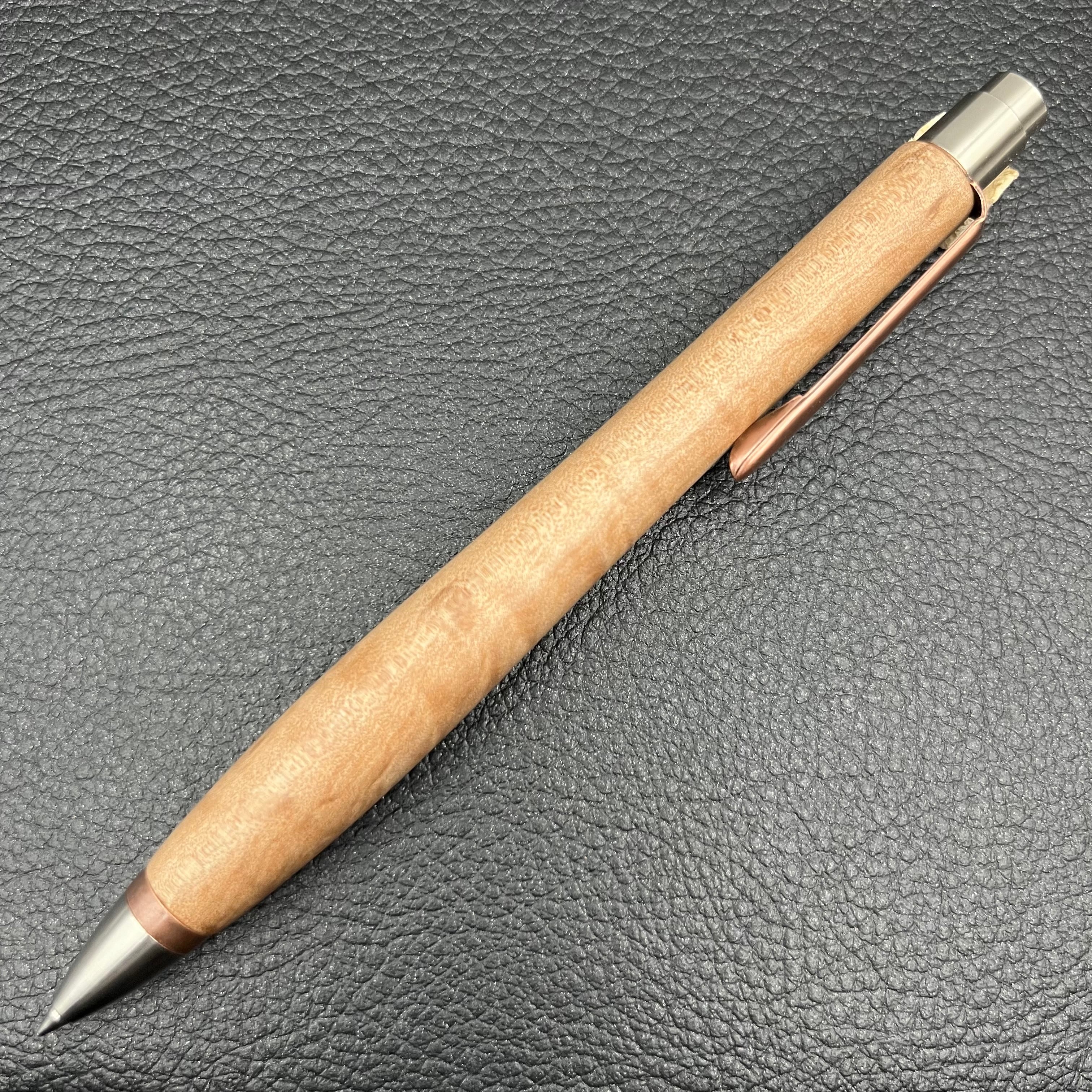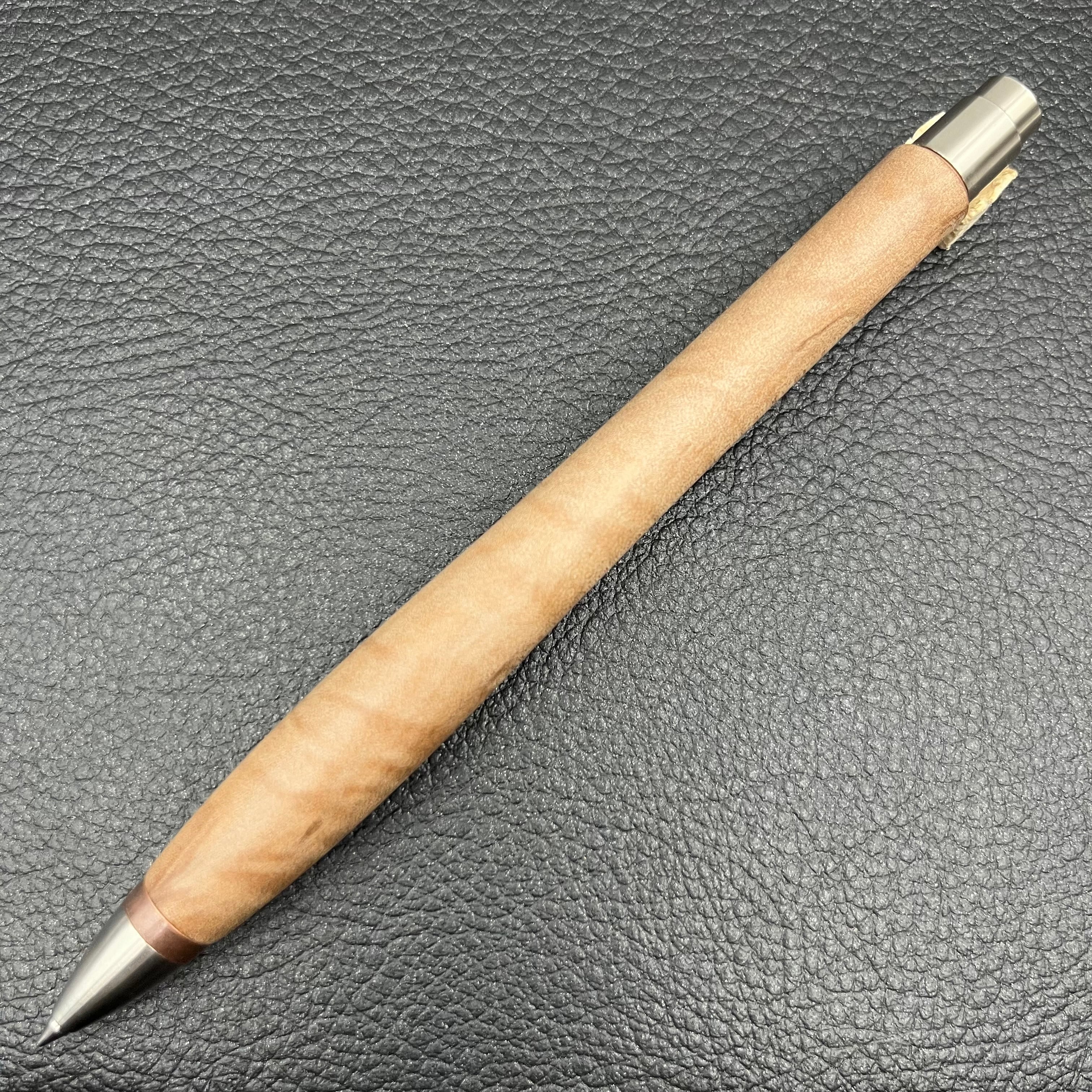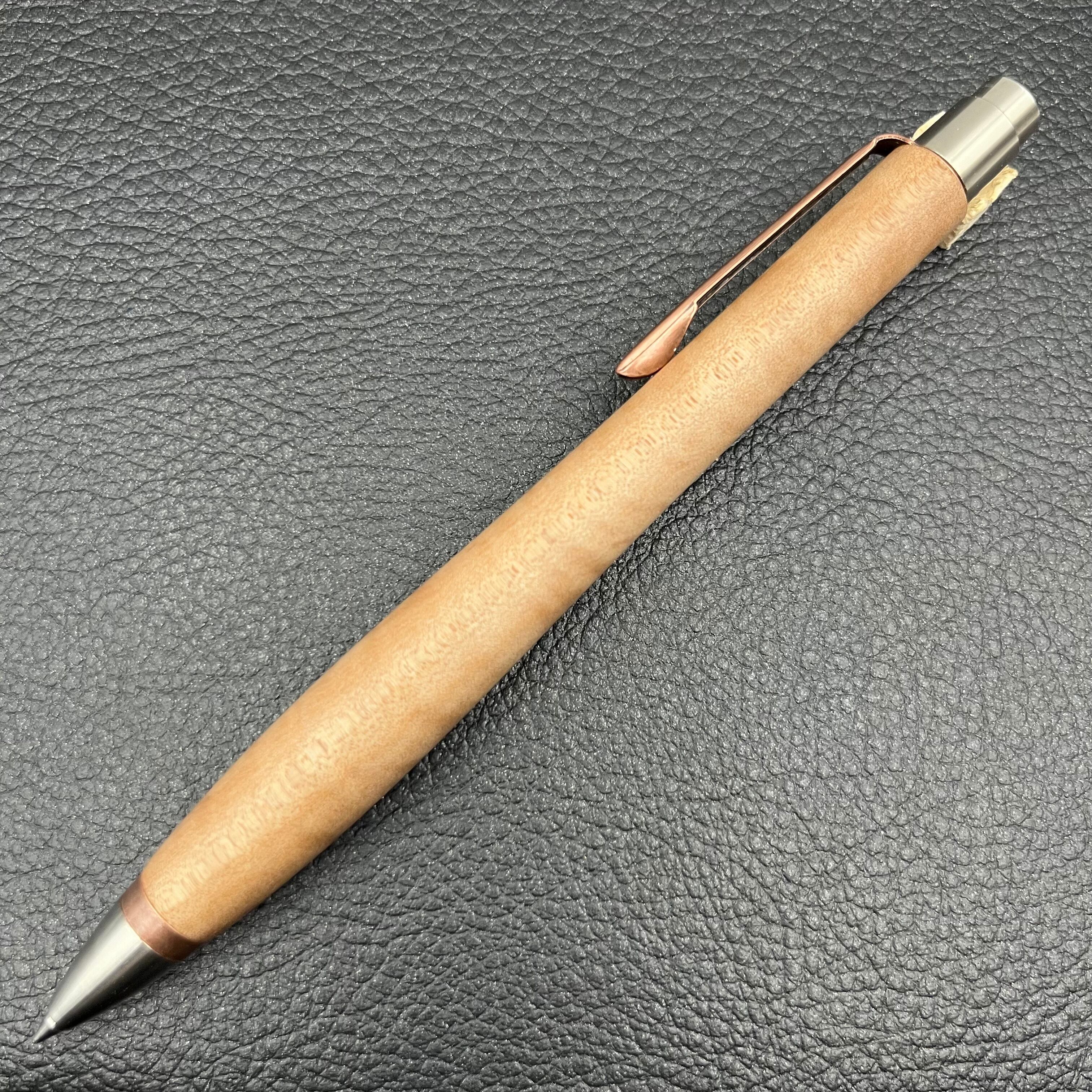 ボールペンのノックシステムは、ドイツ最高のクリックメカニズムを採用してあります。このメカニズムはユニークな機構のため、クリックしたときのカチカチ音が静かで、どんな場所でも気兼ねなく使うことができます。滑らかに動くこのプッシュ感覚を一度味わうと他には戻れなくなってしまうほどの魅力があります。 100分の1単位の加工精度で削り出されたペン先は、軸ブレも全くありません。