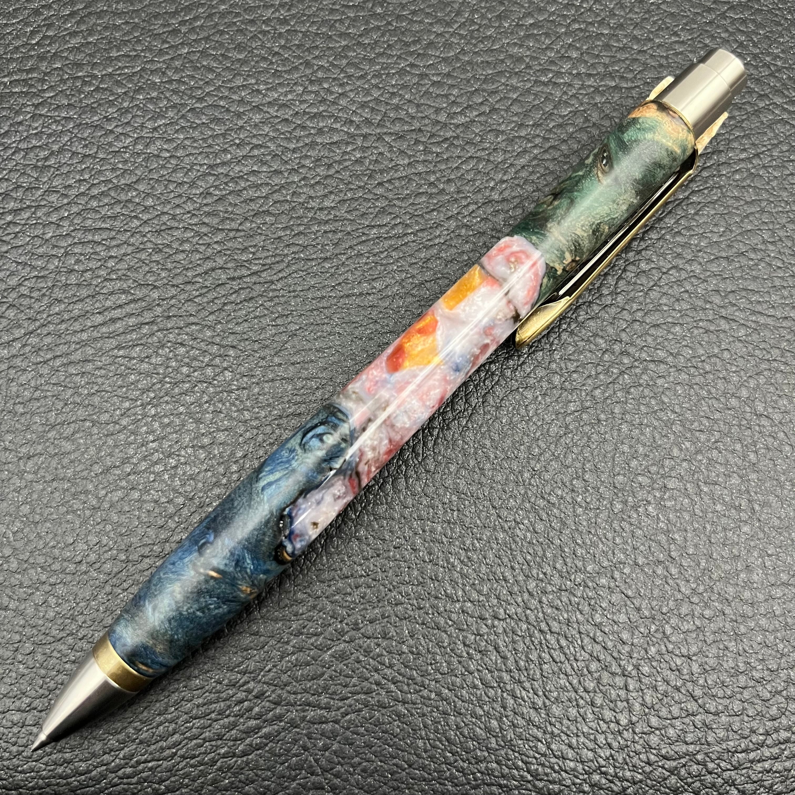 ボールペンのノックシステムは、ドイツ最高のクリックメカニズムを採用してあります。このメカニズムはユニークな機構のため、クリックしたときのカチカチ音が静かで、どんな場所でも気兼ねなく使うことができます。滑らかに動くこのプッシュ感覚を一度味わうと他には戻れなくなってしまうほどの魅力があります。 100分の1単位の加工精度で削り出されたペン先は、軸ブレも全くありません。
