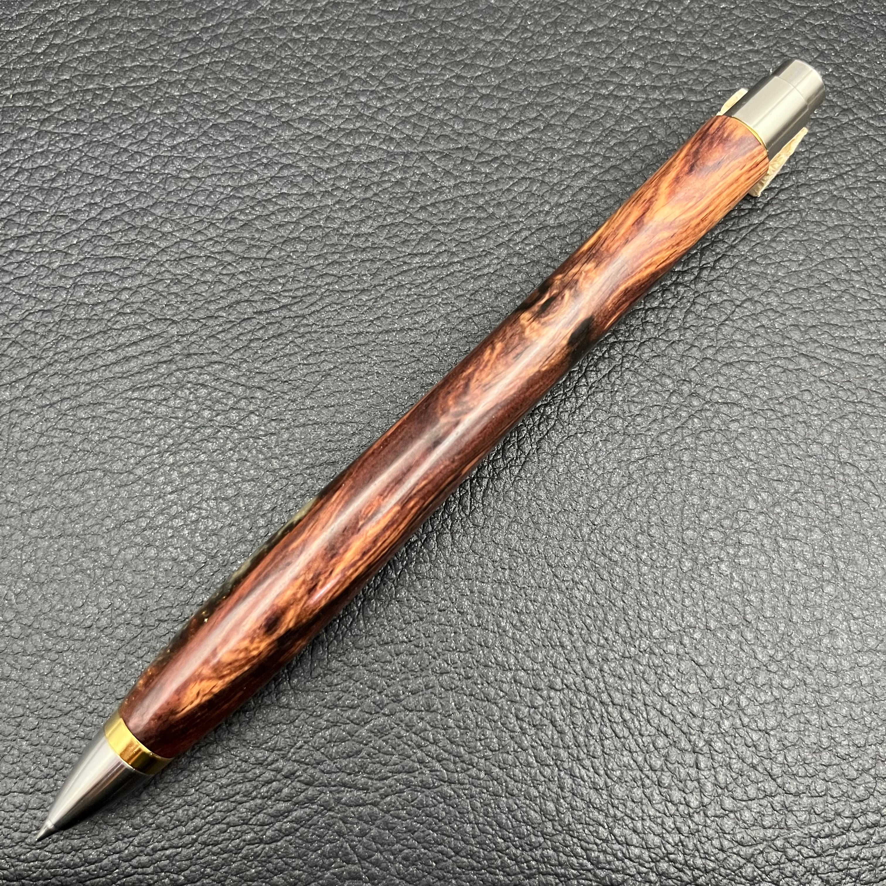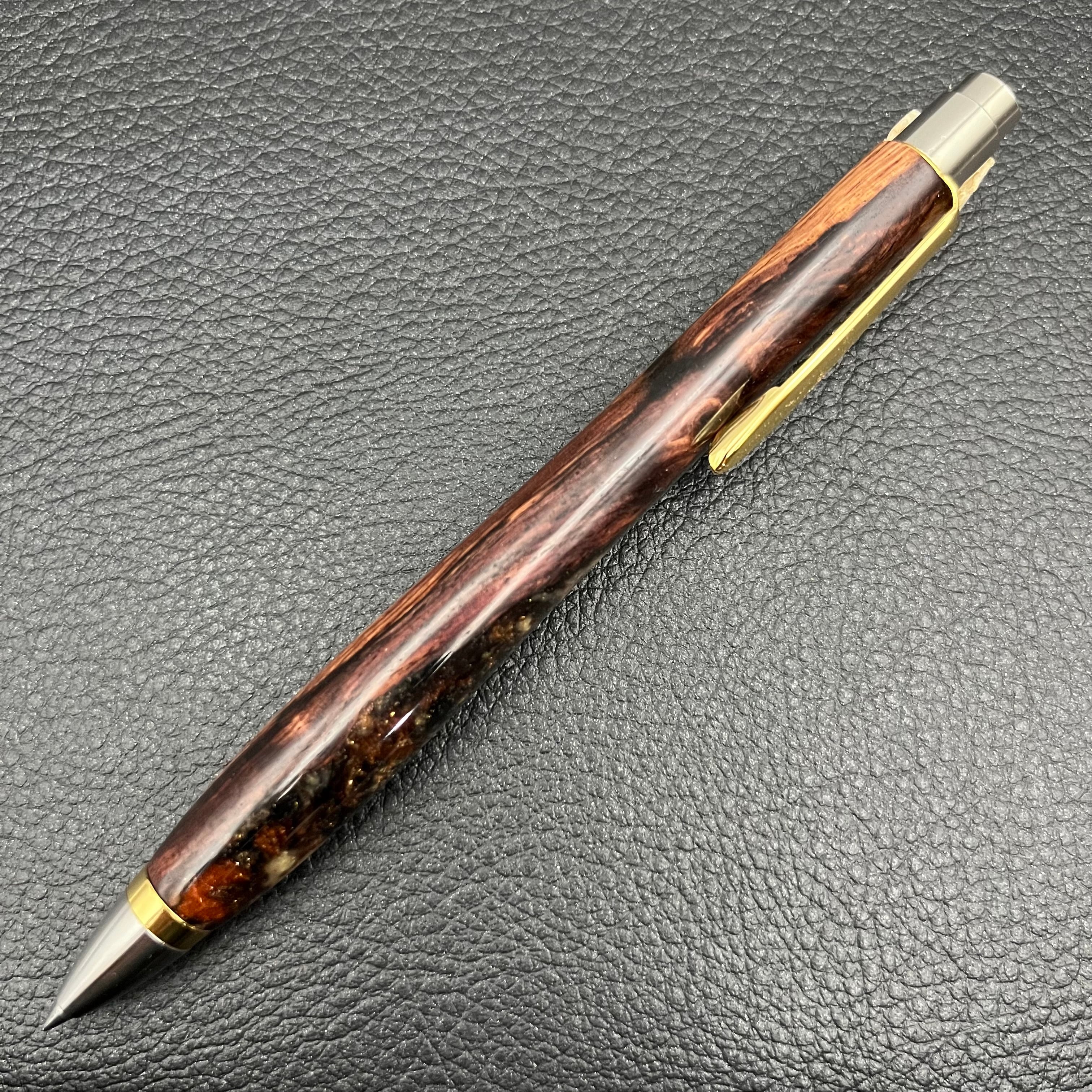 ボールペンのノックシステムは、ドイツ最高のクリックメカニズムを採用してあります。このメカニズムはユニークな機構のため、クリックしたときのカチカチ音が静かで、どんな場所でも気兼ねなく使うことができます。滑らかに動くこのプッシュ感覚を一度味わうと他には戻れなくなってしまうほどの魅力があります。 100分の1単位の加工精度で削り出されたペン先は、軸ブレも全くありません。