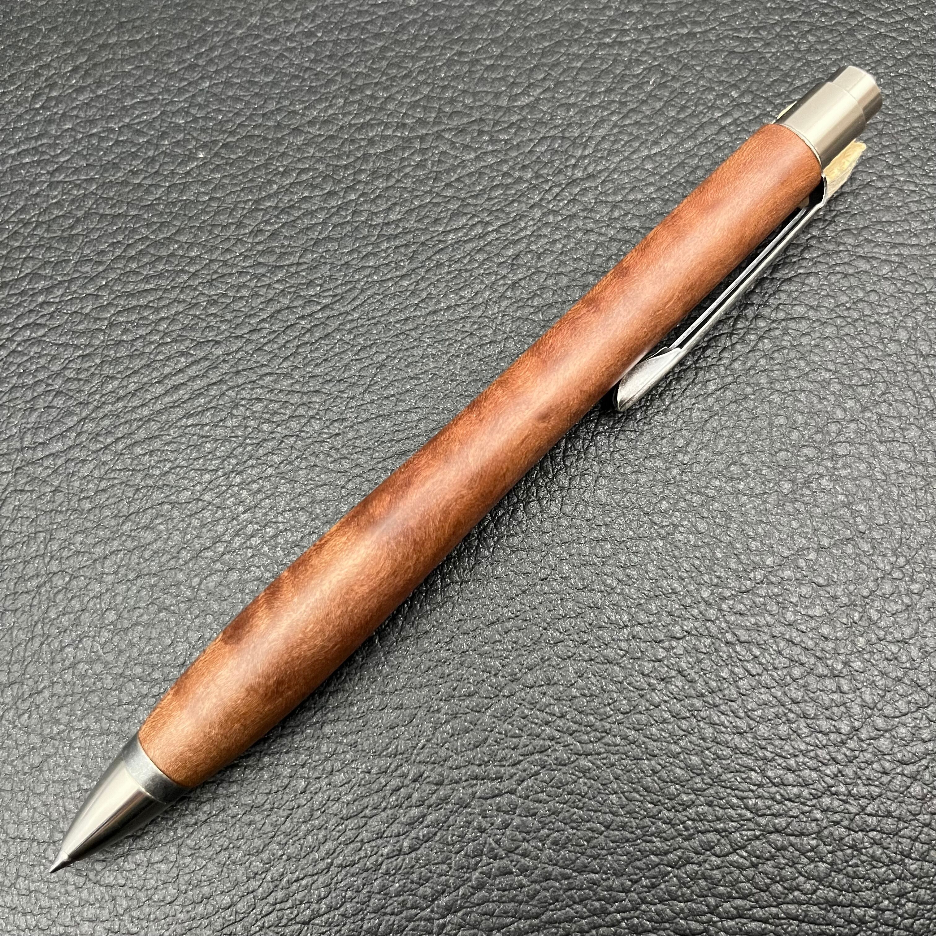 ボールペンのノックシステムは、ドイツ最高のクリックメカニズムを採用してあります。このメカニズムはユニークな機構のため、クリックしたときのカチカチ音が静かで、どんな場所でも気兼ねなく使うことができます。滑らかに動くこのプッシュ感覚を一度味わうと他には戻れなくなってしまうほどの魅力があります。 100分の1単位の加工精度で削り出されたペン先は、軸ブレも全くありません。