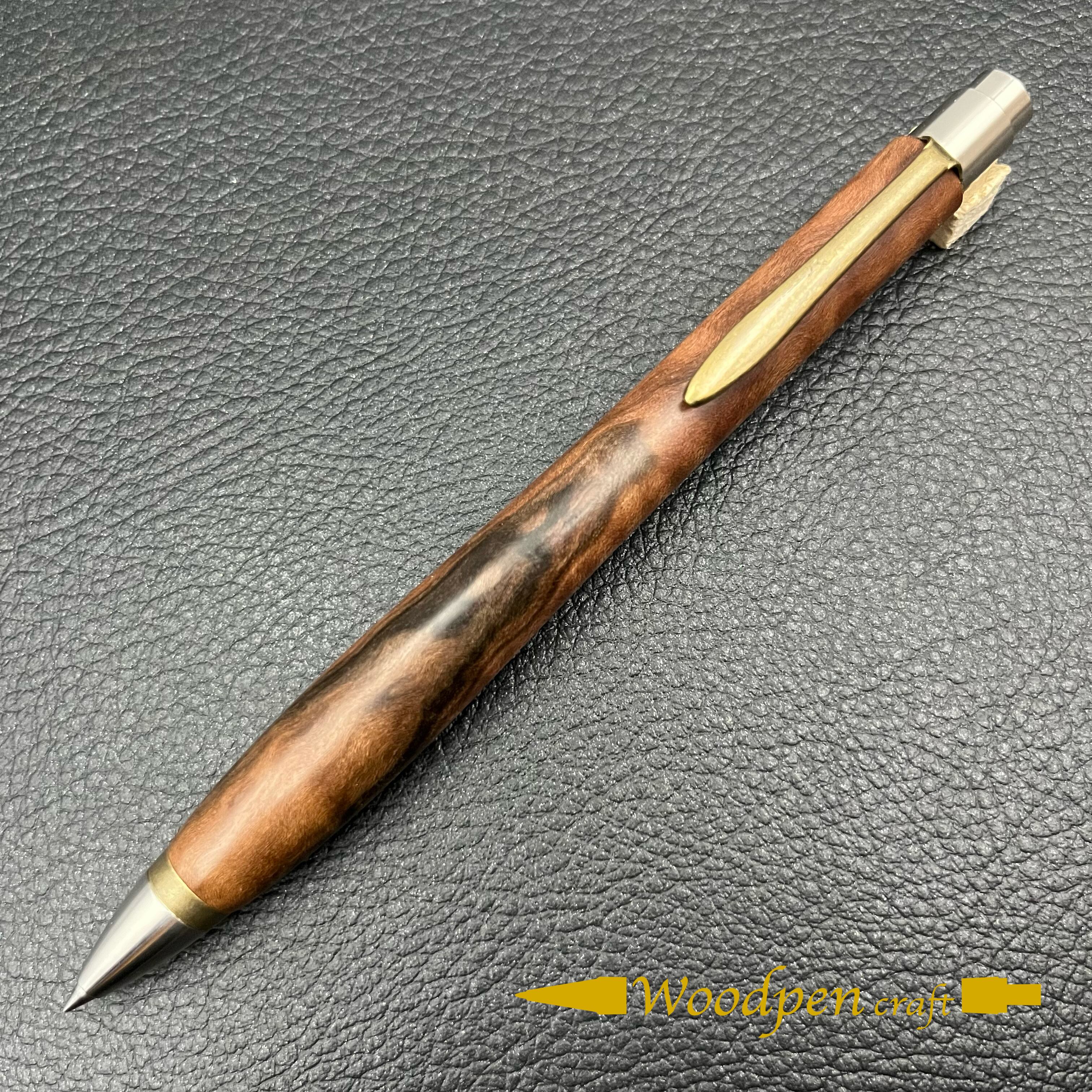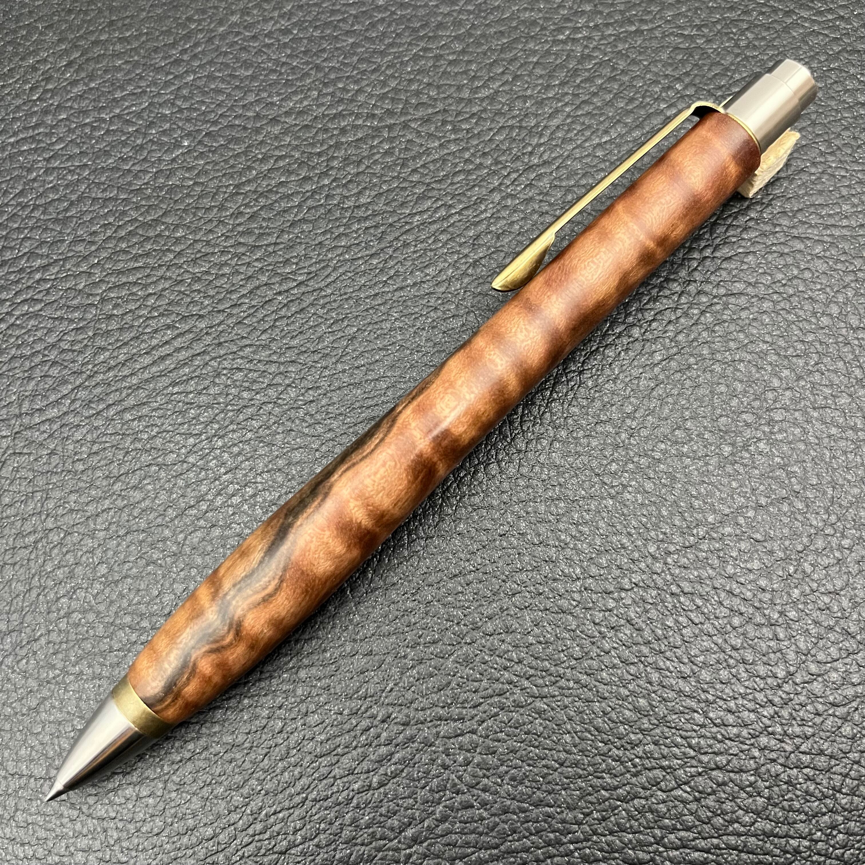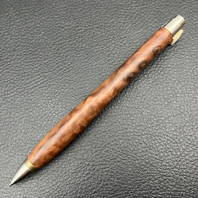 ボールペンのノックシステムは、ドイツ最高のクリックメカニズムを採用してあります。このメカニズムはユニークな機構のため、クリックしたときのカチカチ音が静かで、どんな場所でも気兼ねなく使うことができます。滑らかに動くこのプッシュ感覚を一度味わうと他には戻れなくなってしまうほどの魅力があります。 100分の1単位の加工精度で削り出されたペン先は、軸ブレも全くありません。