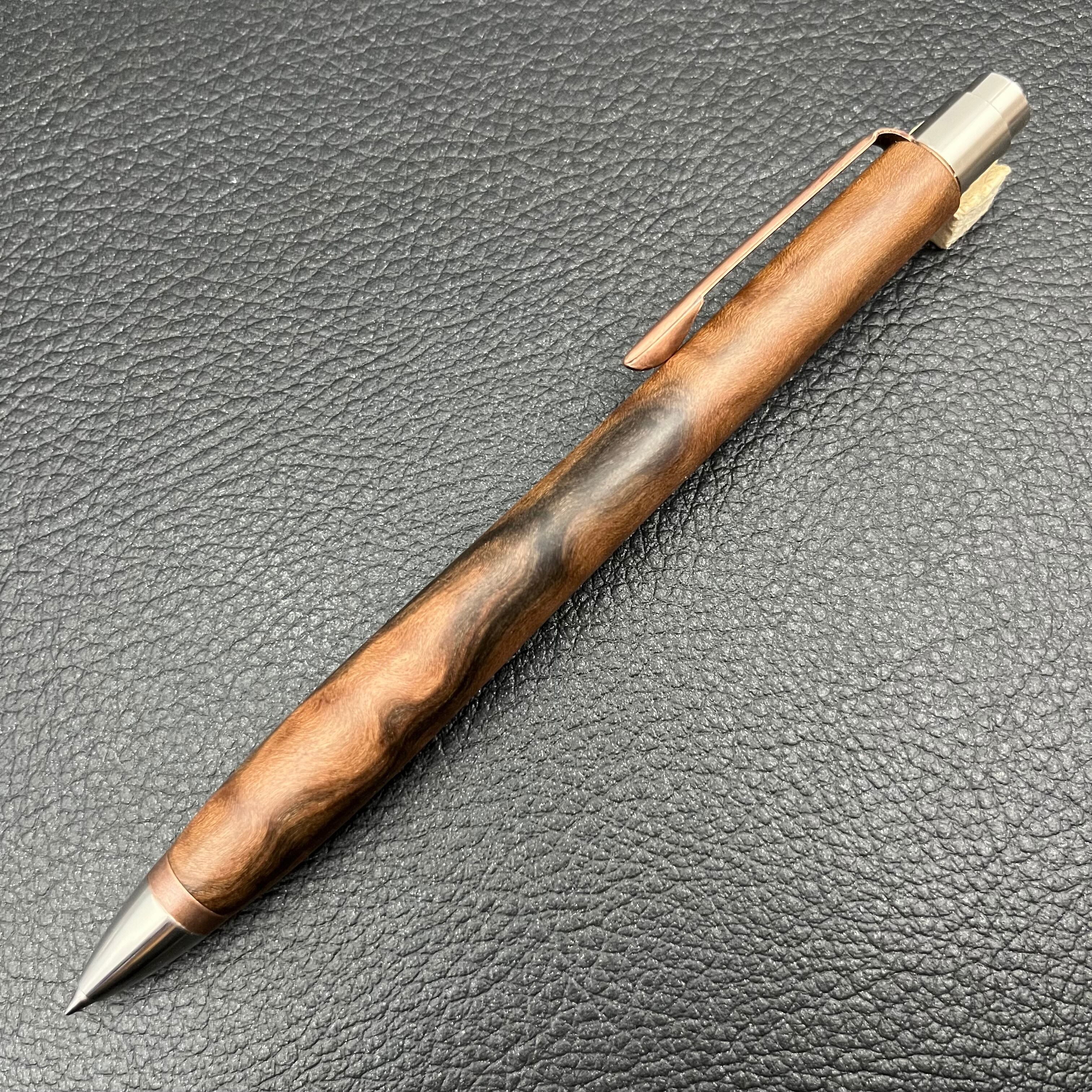 ボールペンのノックシステムは、ドイツ最高のクリックメカニズムを採用してあります。このメカニズムはユニークな機構のため、クリックしたときのカチカチ音が静かで、どんな場所でも気兼ねなく使うことができます。滑らかに動くこのプッシュ感覚を一度味わうと他には戻れなくなってしまうほどの魅力があります。 100分の1単位の加工精度で削り出されたペン先は、軸ブレも全くありません。