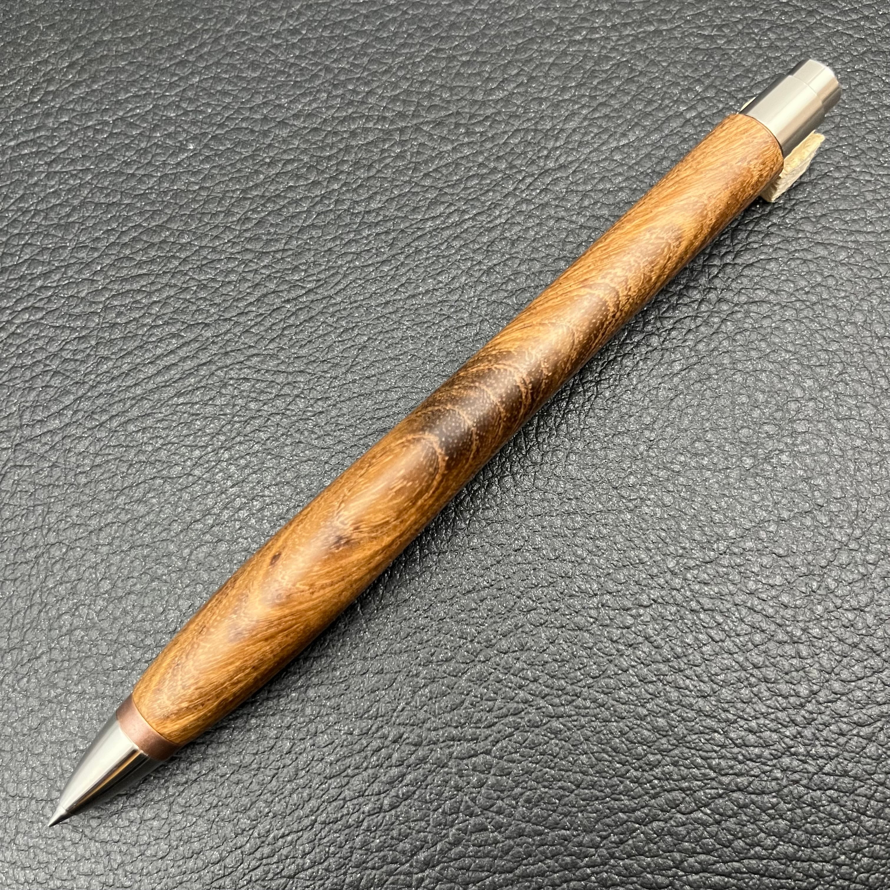 ボールペンのノックシステムは、ドイツ最高のクリックメカニズムを採用してあります。このメカニズムはユニークな機構のため、クリックしたときのカチカチ音が静かで、どんな場所でも気兼ねなく使うことができます。滑らかに動くこのプッシュ感覚を一度味わうと他には戻れなくなってしまうほどの魅力があります。 100分の1単位の加工精度で削り出されたペン先は、軸ブレも全くありません。
