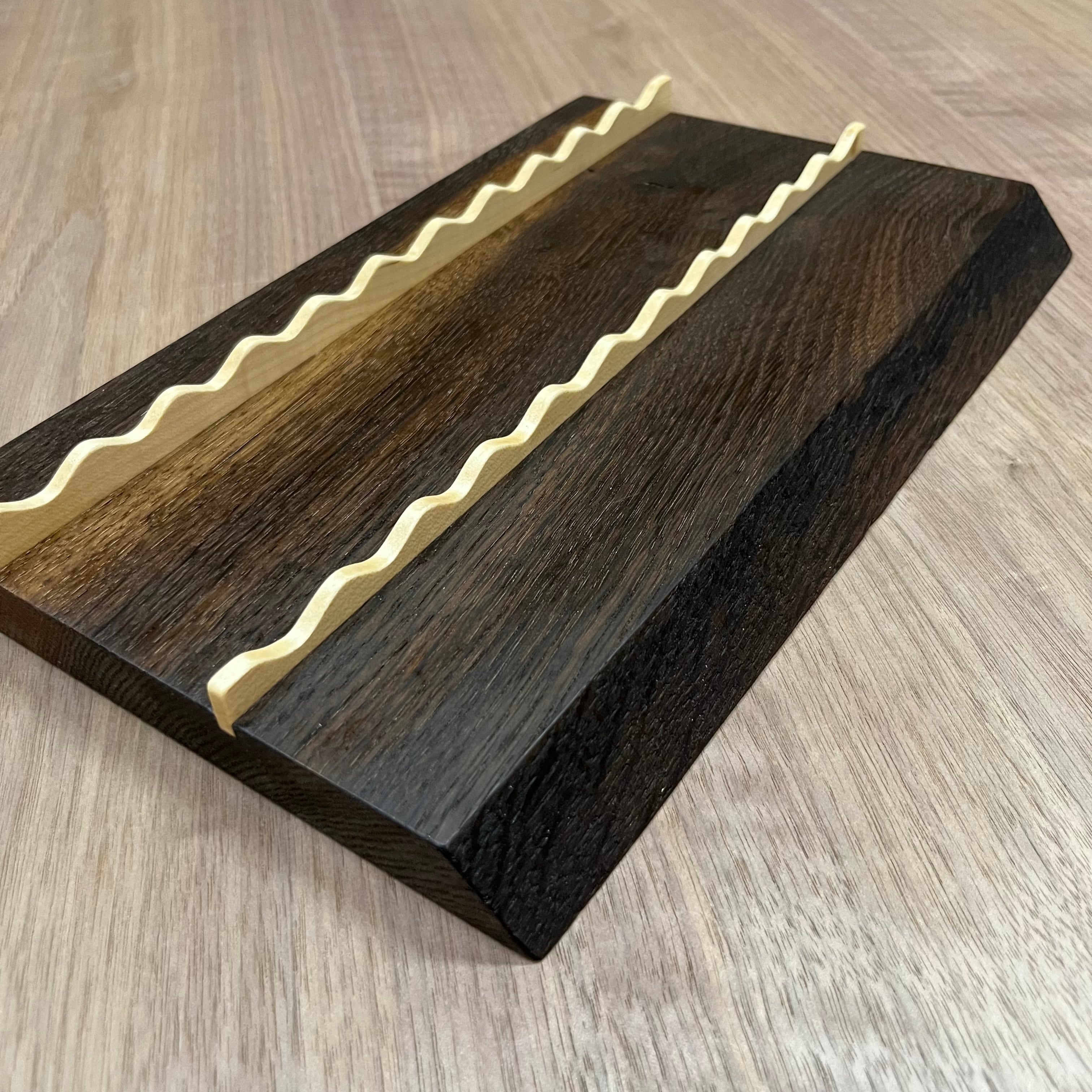 耳付き一枚板を天然オイルで仕上げてあり、ペンの長さや太さが違っても置けるように作られています。