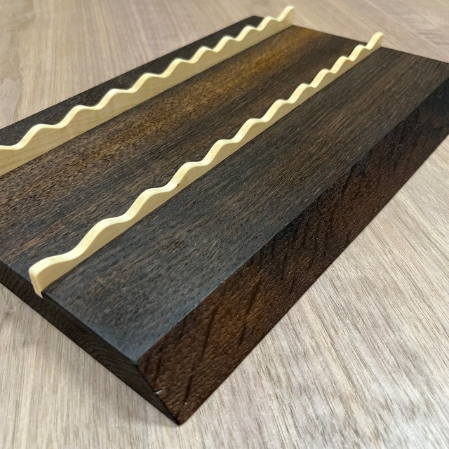 耳付き一枚板を天然オイルで仕上げてあり、ペンの長さや太さが違っても置けるように作られています。