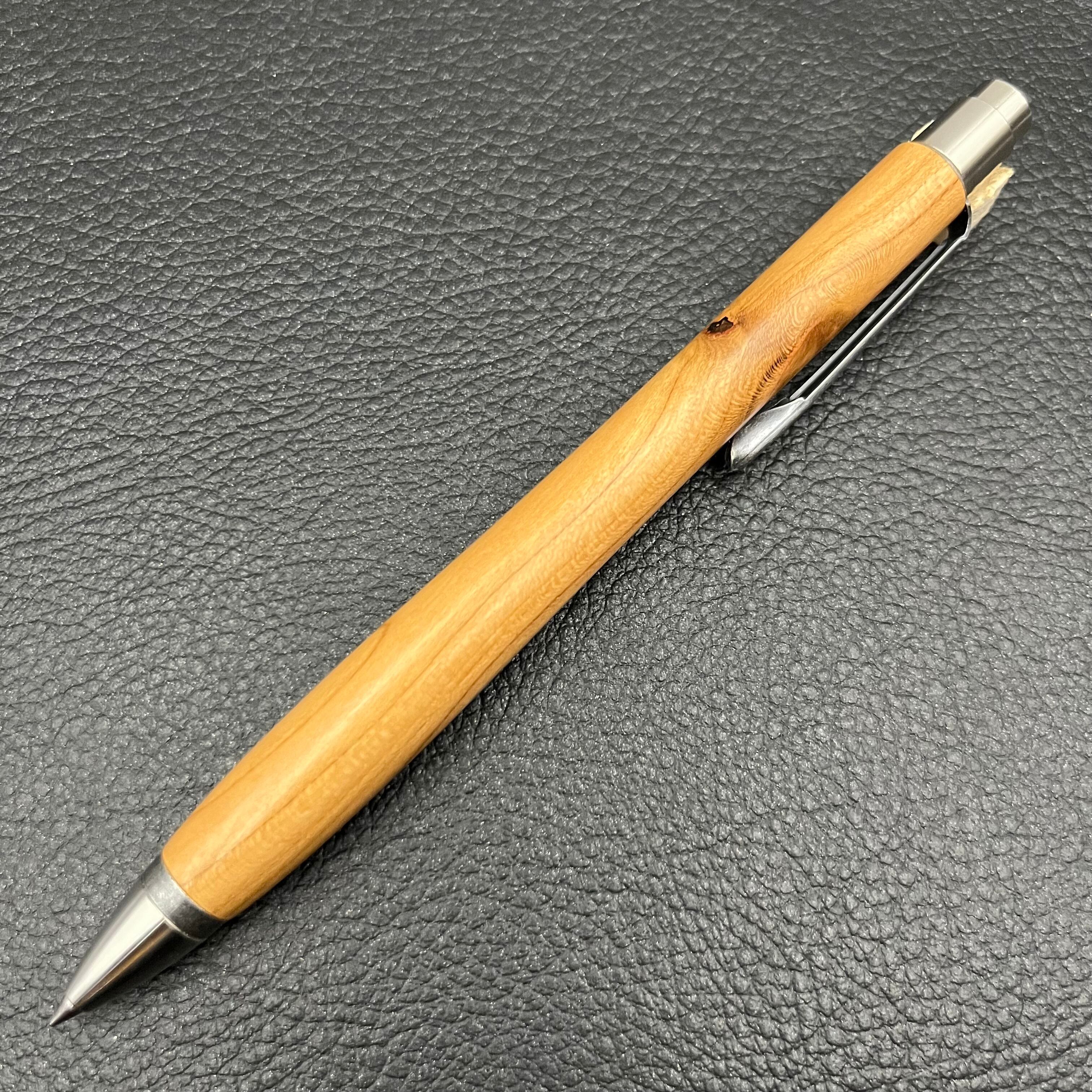 ボールペンのノックシステムは、ドイツ最高のクリックメカニズムを採用してあります。このメカニズムはユニークな機構のため、クリックしたときのカチカチ音が静かで、どんな場所でも気兼ねなく使うことができます。滑らかに動くこのプッシュ感覚を一度味わうと他には戻れなくなってしまうほどの魅力があります。 100分の1単位の加工精度で削り出されたペン先は、軸ブレも全くありません。