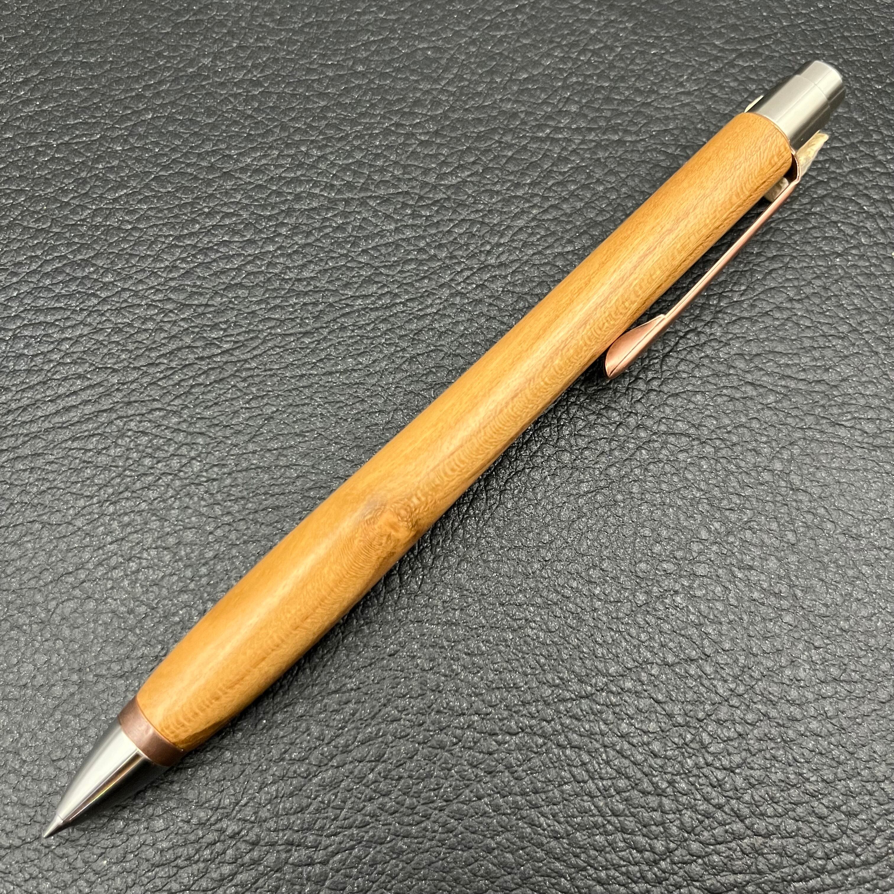 ボールペンのノックシステムは、ドイツ最高のクリックメカニズムを採用してあります。このメカニズムはユニークな機構のため、クリックしたときのカチカチ音が静かで、どんな場所でも気兼ねなく使うことができます。滑らかに動くこのプッシュ感覚を一度味わうと他には戻れなくなってしまうほどの魅力があります。 100分の1単位の加工精度で削り出されたペン先は、軸ブレも全くありません。