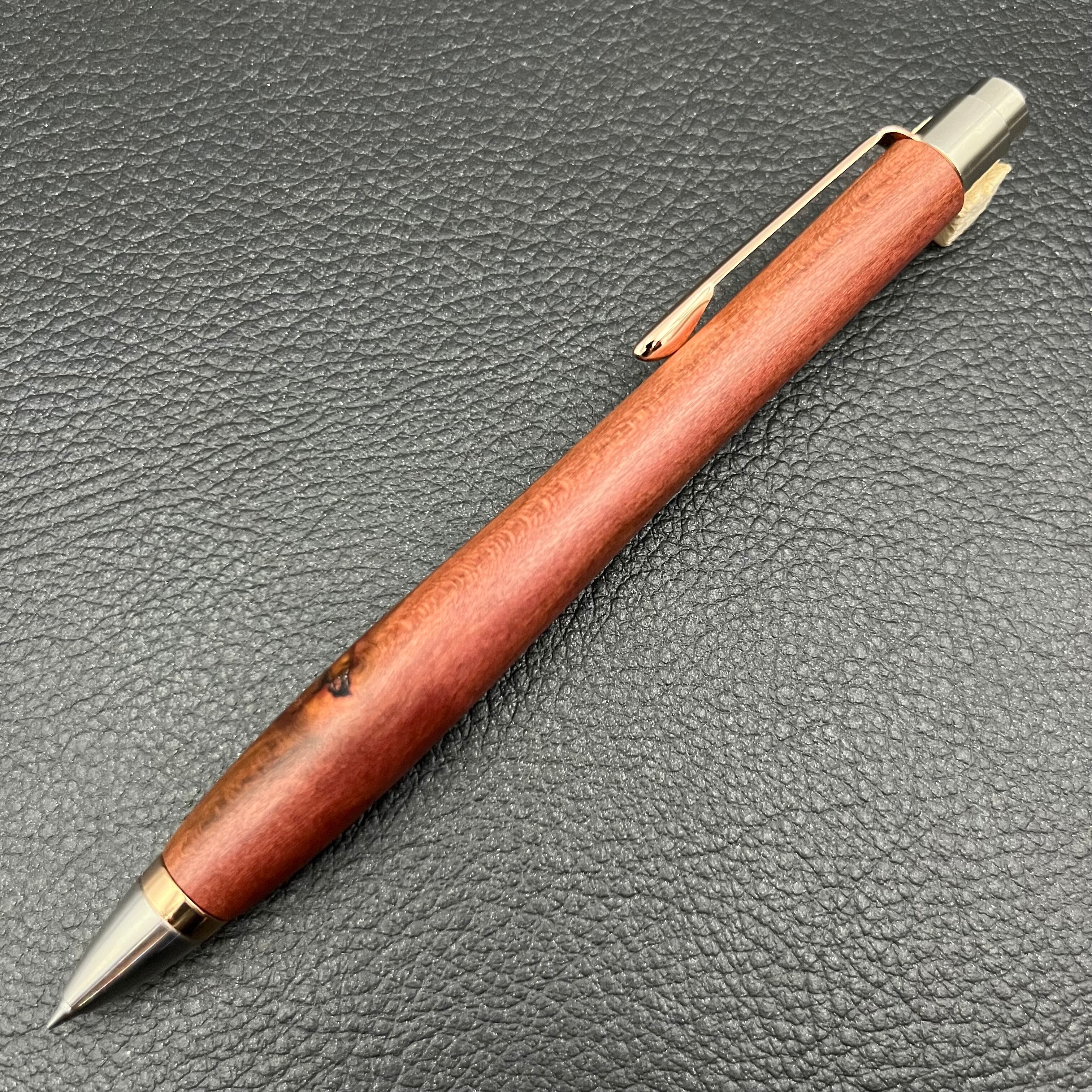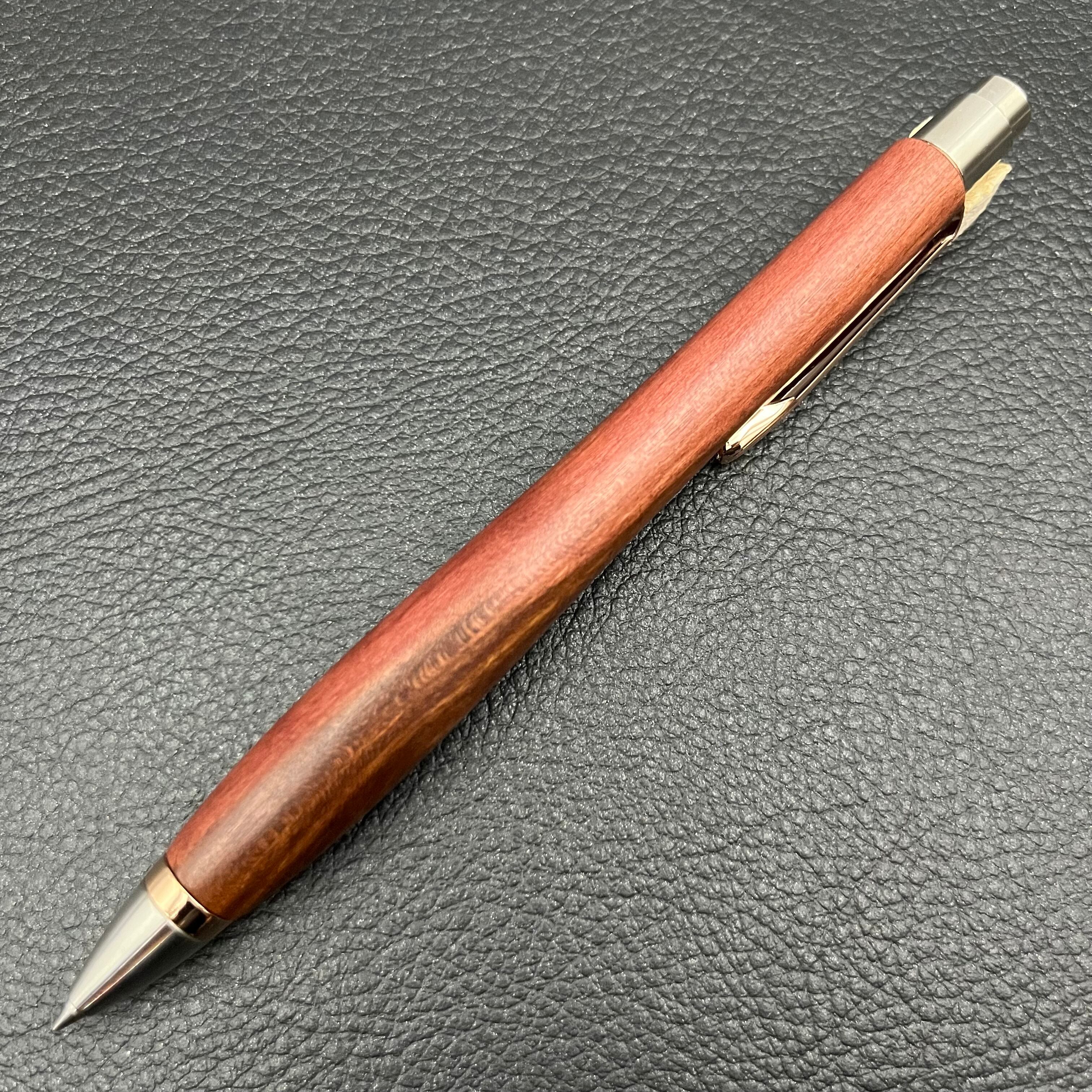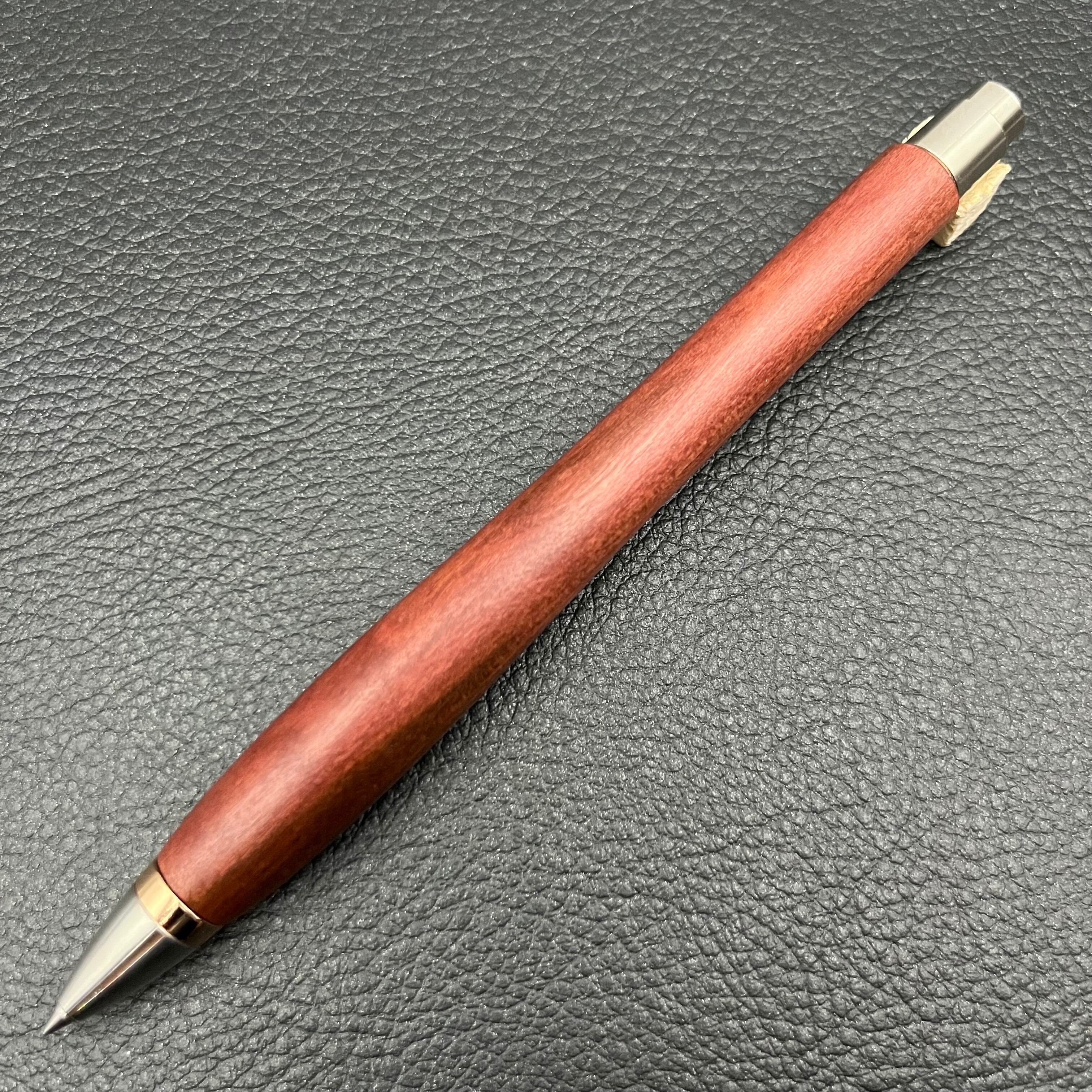 ボールペンのノックシステムは、ドイツ最高のクリックメカニズムを採用してあります。このメカニズムはユニークな機構のため、クリックしたときのカチカチ音が静かで、どんな場所でも気兼ねなく使うことができます。滑らかに動くこのプッシュ感覚を一度味わうと他には戻れなくなってしまうほどの魅力があります。 100分の1単位の加工精度で削り出されたペン先は、軸ブレも全くありません。