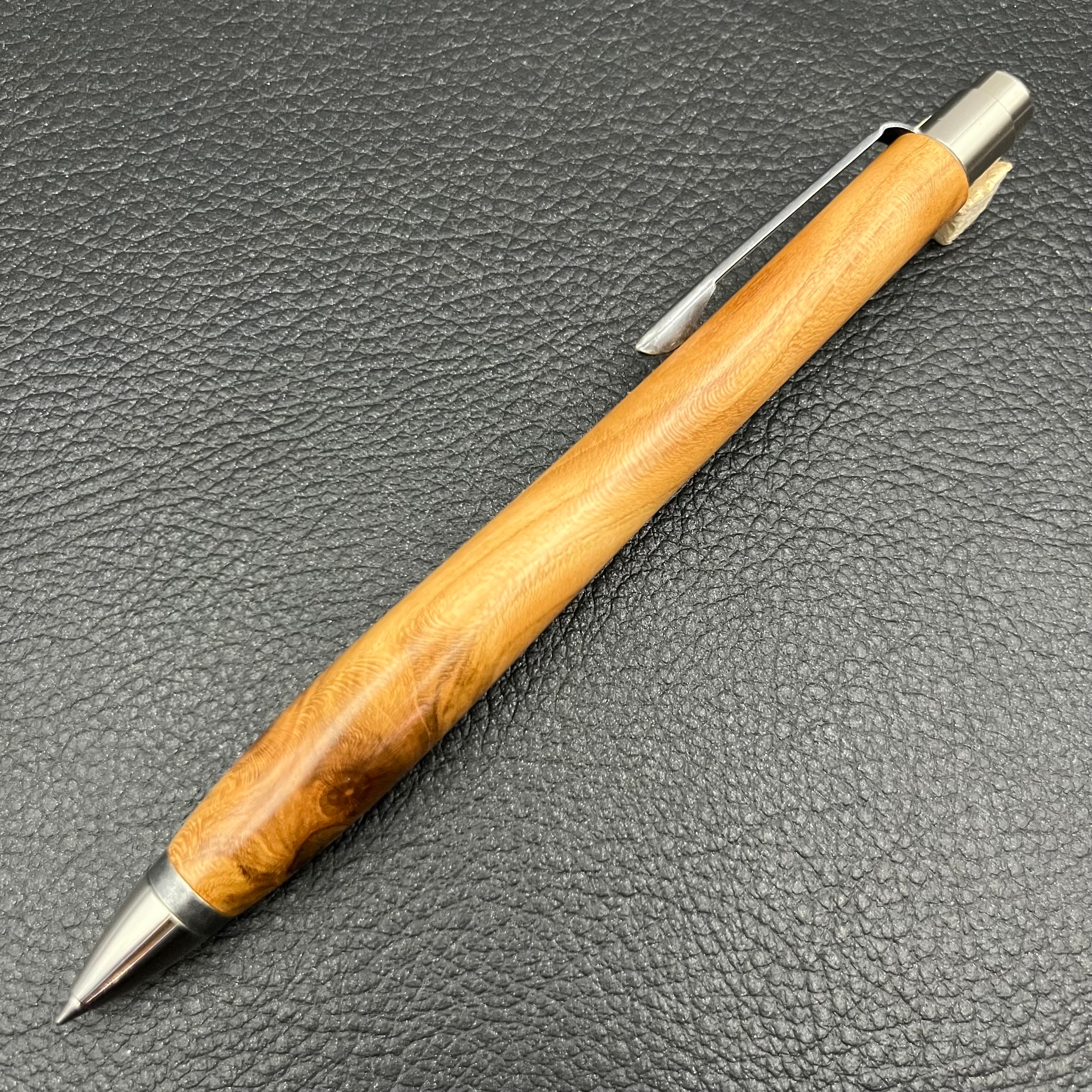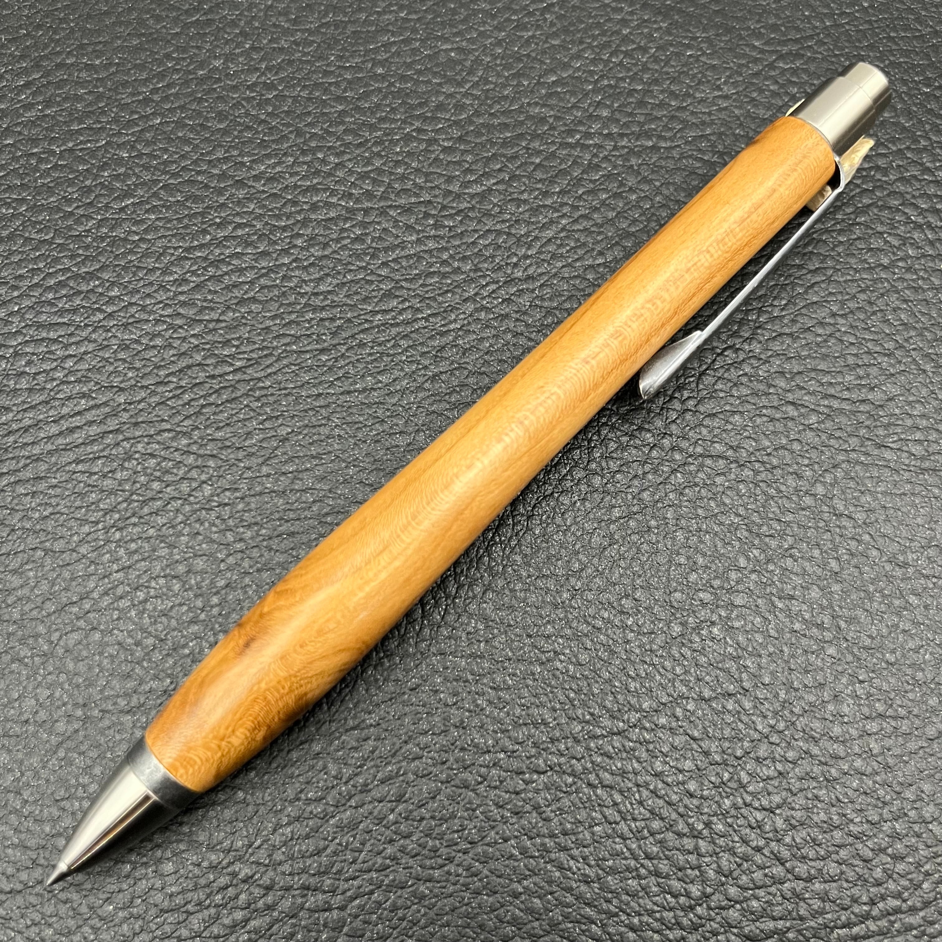 ボールペンのノックシステムは、ドイツ最高のクリックメカニズムを採用してあります。このメカニズムはユニークな機構のため、クリックしたときのカチカチ音が静かで、どんな場所でも気兼ねなく使うことができます。滑らかに動くこのプッシュ感覚を一度味わうと他には戻れなくなってしまうほどの魅力があります。 100分の1単位の加工精度で削り出されたペン先は、軸ブレも全くありません。