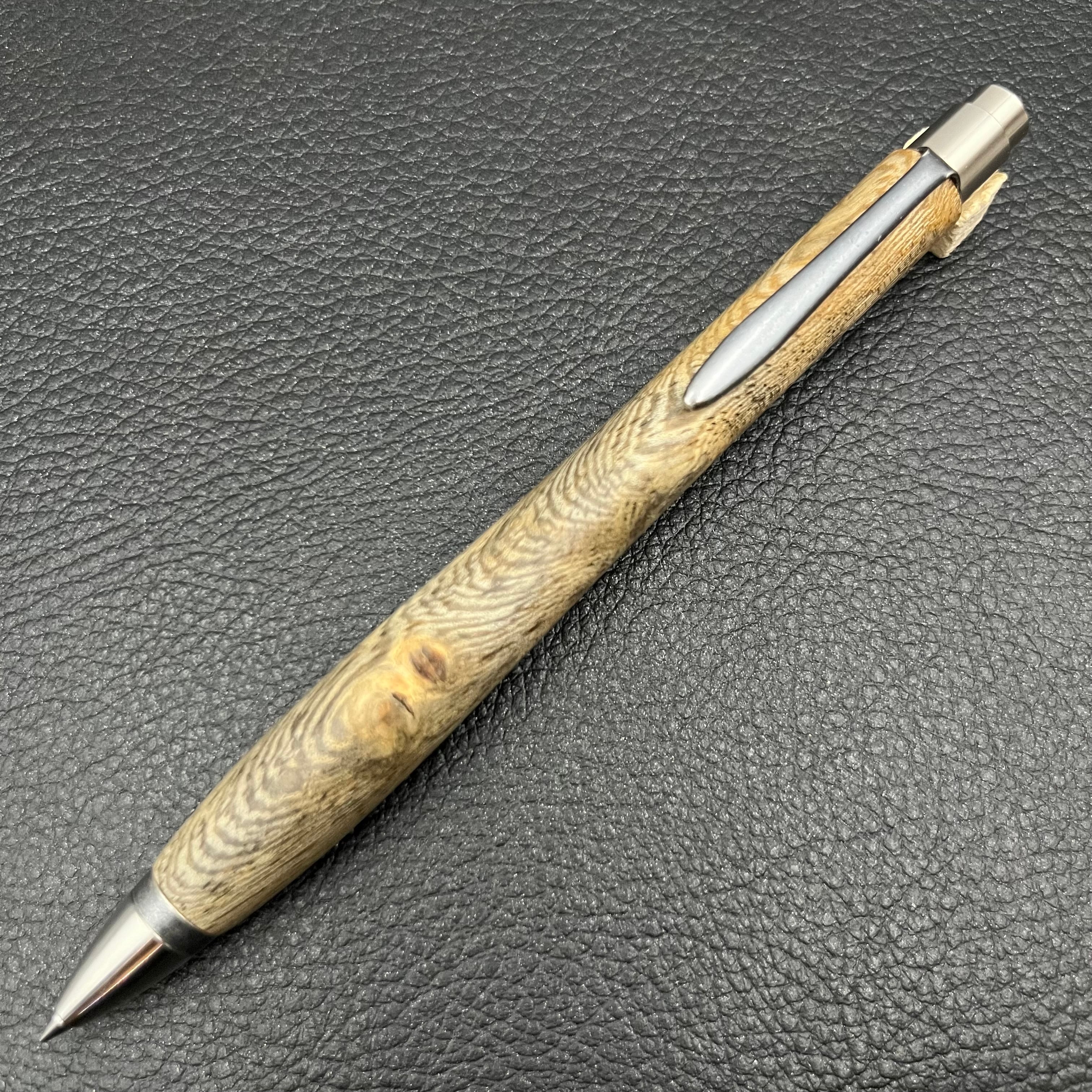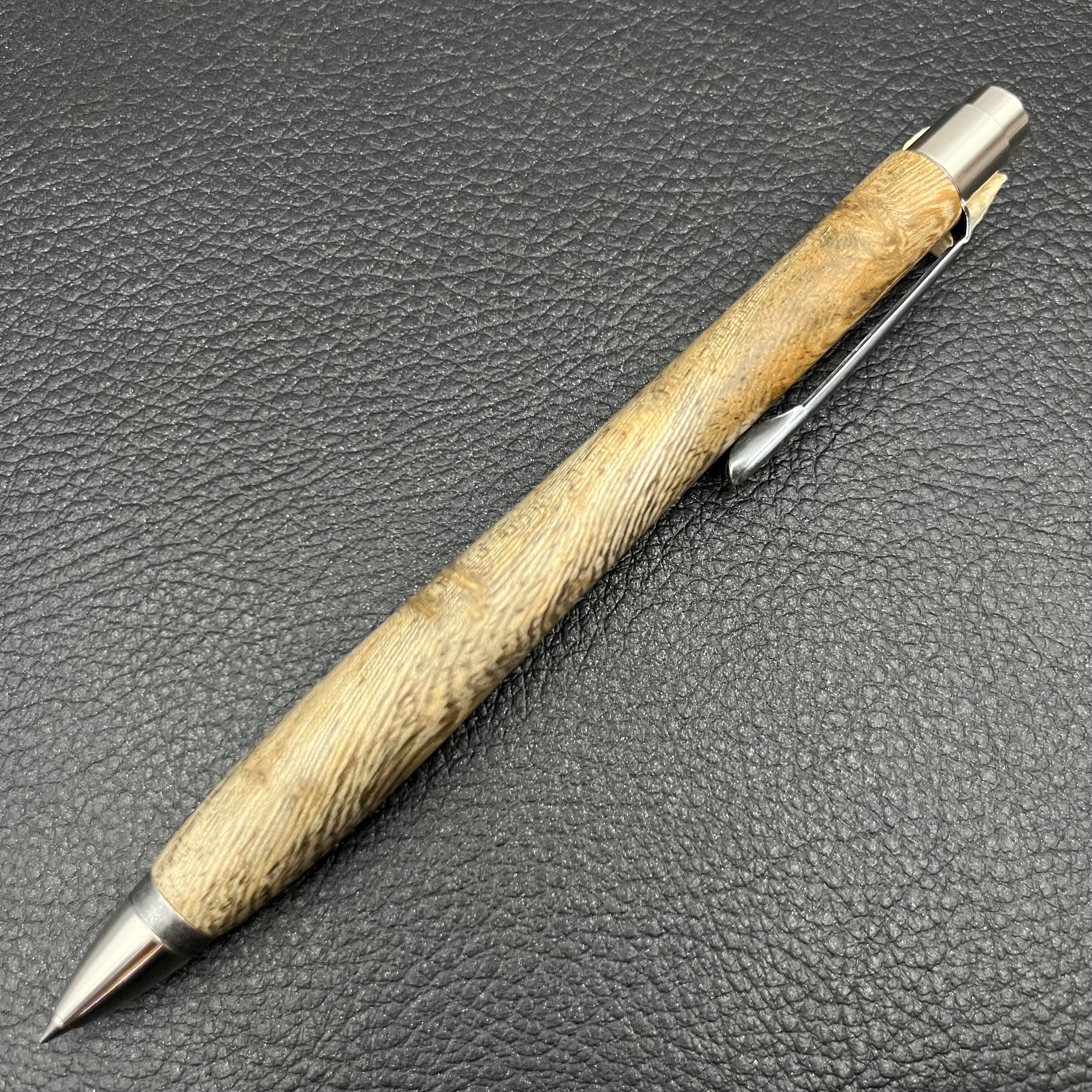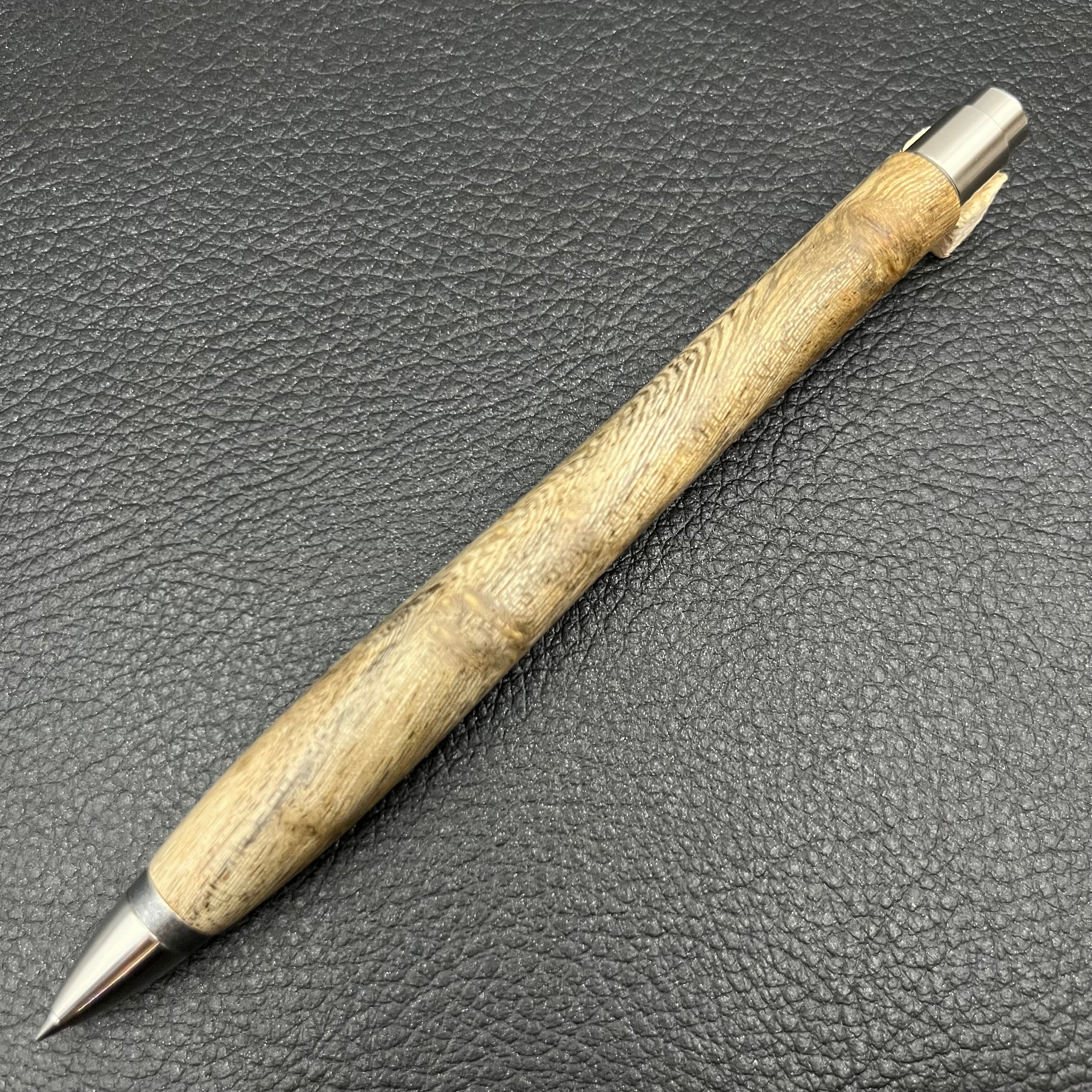ボールペンのノックシステムは、ドイツ最高のクリックメカニズムを採用してあります。このメカニズムはユニークな機構のため、クリックしたときのカチカチ音が静かで、どんな場所でも気兼ねなく使うことができます。滑らかに動くこのプッシュ感覚を一度味わうと他には戻れなくなってしまうほどの魅力があります。 100分の1単位の加工精度で削り出されたペン先は、軸ブレも全くありません。