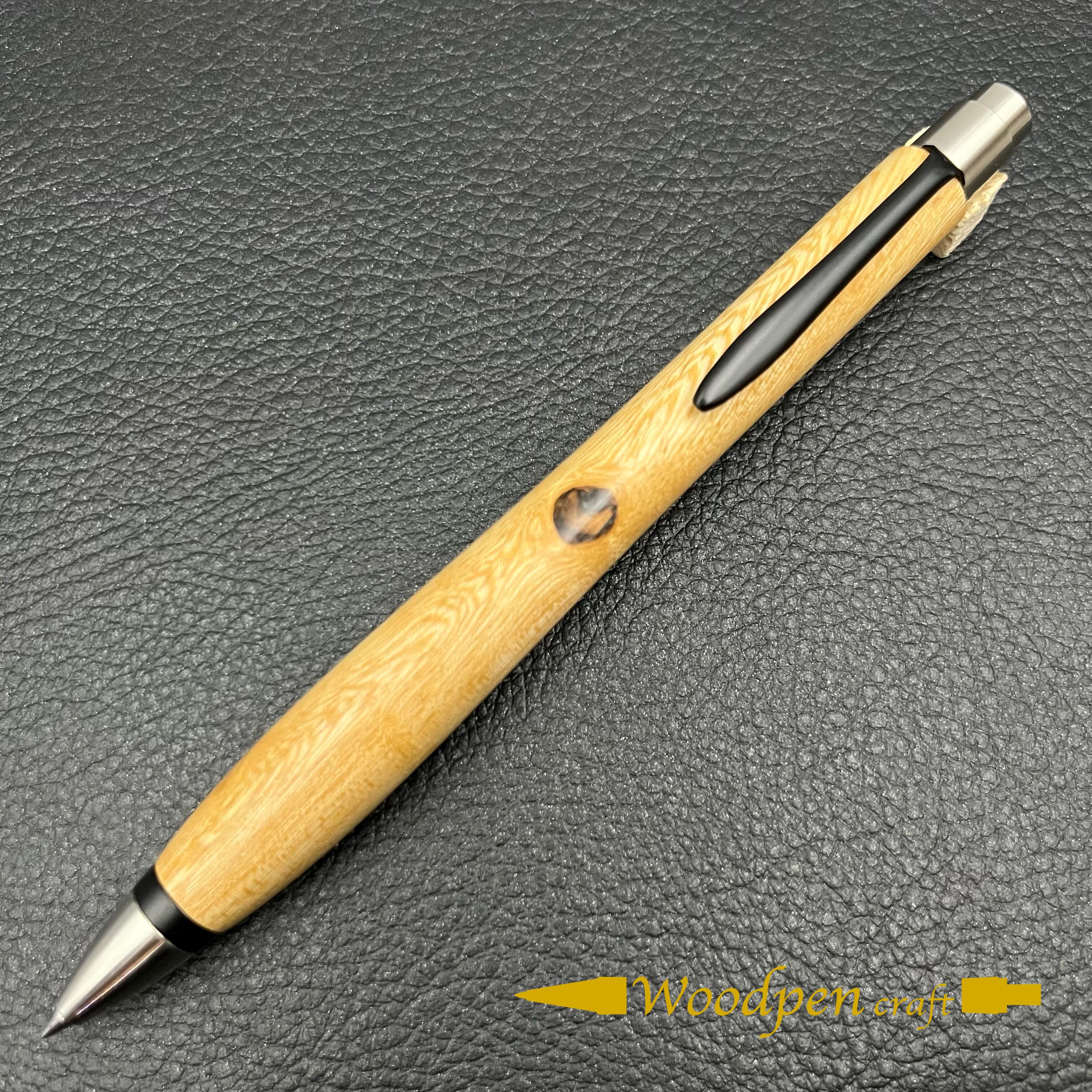 ボールペンのノックシステムは、ドイツ最高のクリックメカニズムを採用してあります。このメカニズムはユニークな機構のため、クリックしたときのカチカチ音が静かで、どんな場所でも気兼ねなく使うことができます。滑らかに動くこのプッシュ感覚を一度味わうと他には戻れなくなってしまうほどの魅力があります。 100分の1単位の加工精度で削り出されたペン先は、軸ブレも全くありません。