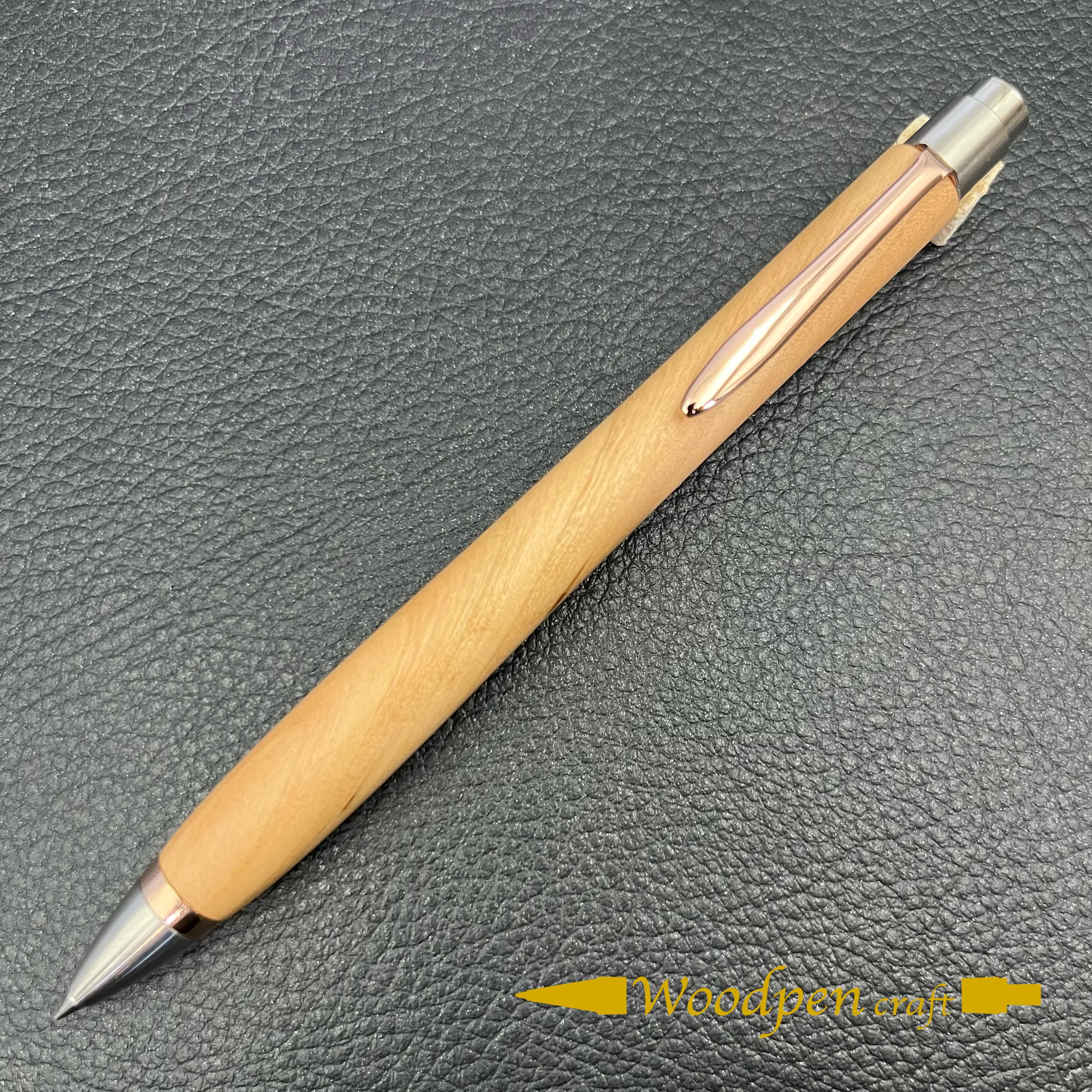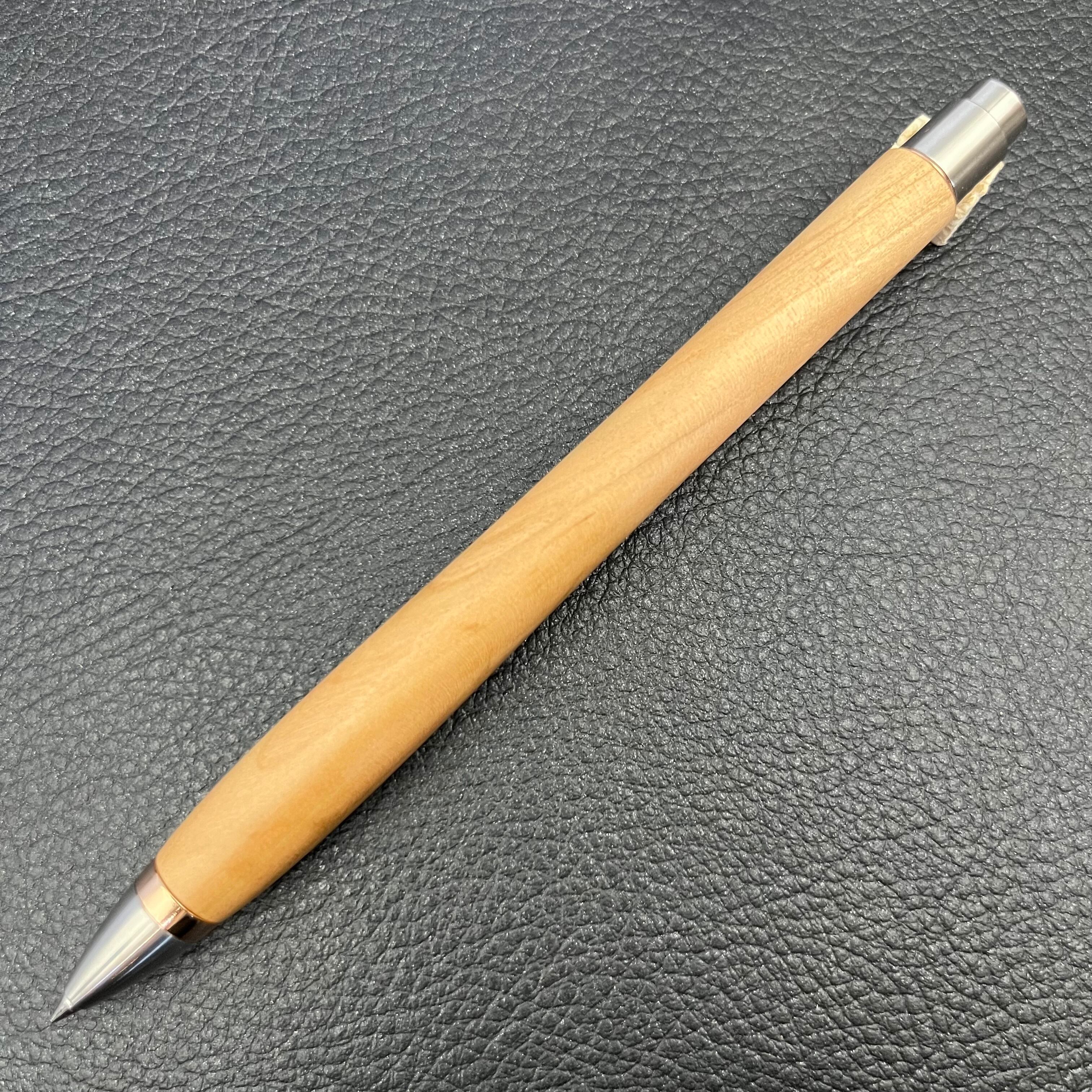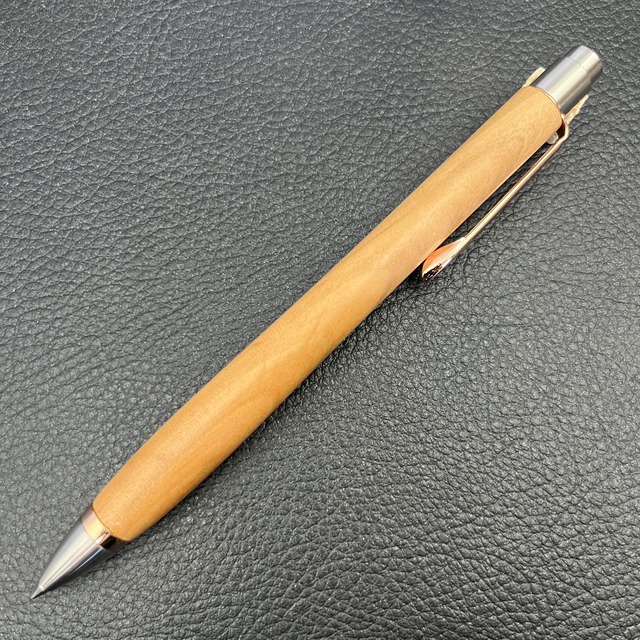ボールペンのノックシステムは、ドイツ最高のクリックメカニズムを採用してあります。このメカニズムはユニークな機構のため、クリックしたときのカチカチ音が静かで、どんな場所でも気兼ねなく使うことができます。滑らかに動くこのプッシュ感覚を一度味わうと他には戻れなくなってしまうほどの魅力があります。 100分の1単位の加工精度で削り出されたペン先は、軸ブレも全くありません。
