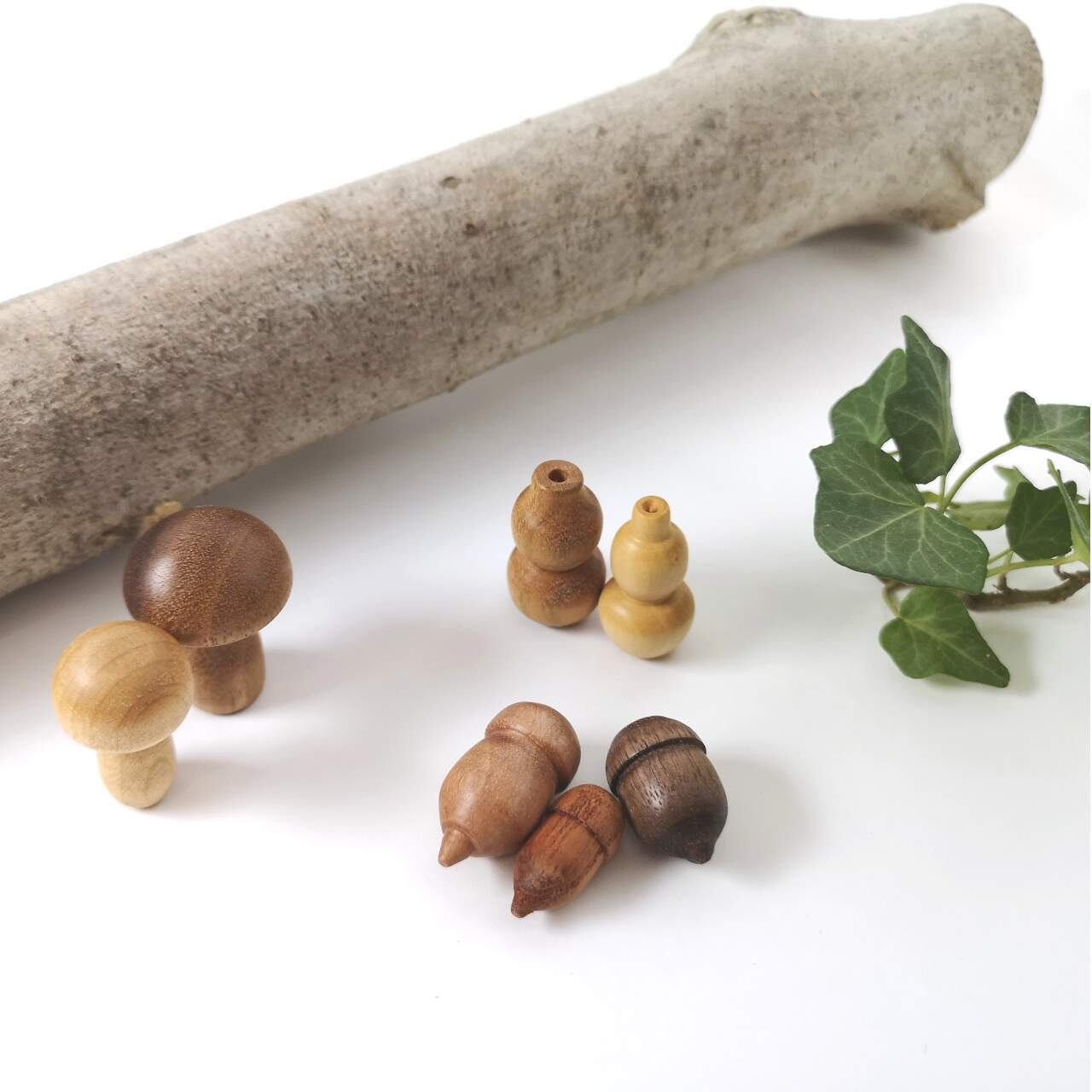 ボールペンを作る時に出た端材で、小さなキノコやドングリ、ヒョウタンなどを作りました。お買い上げいただいた皆さまに、感謝の気持ちを込めておひとつプレゼントいたします。