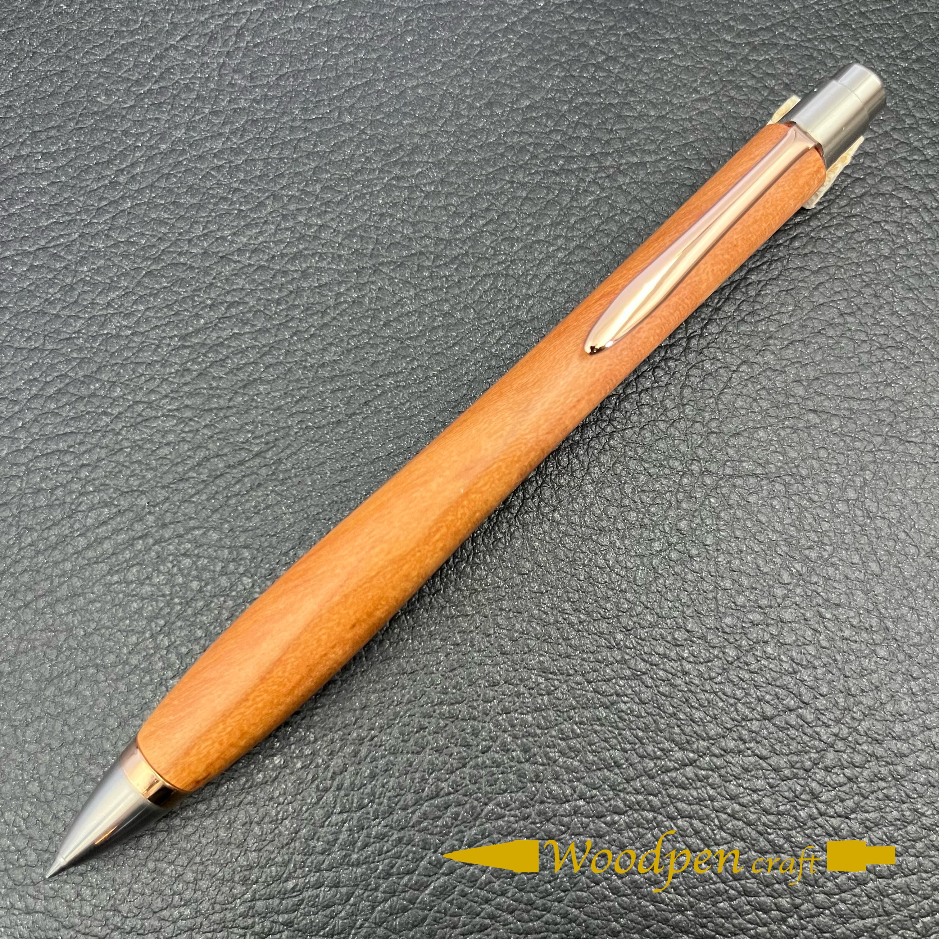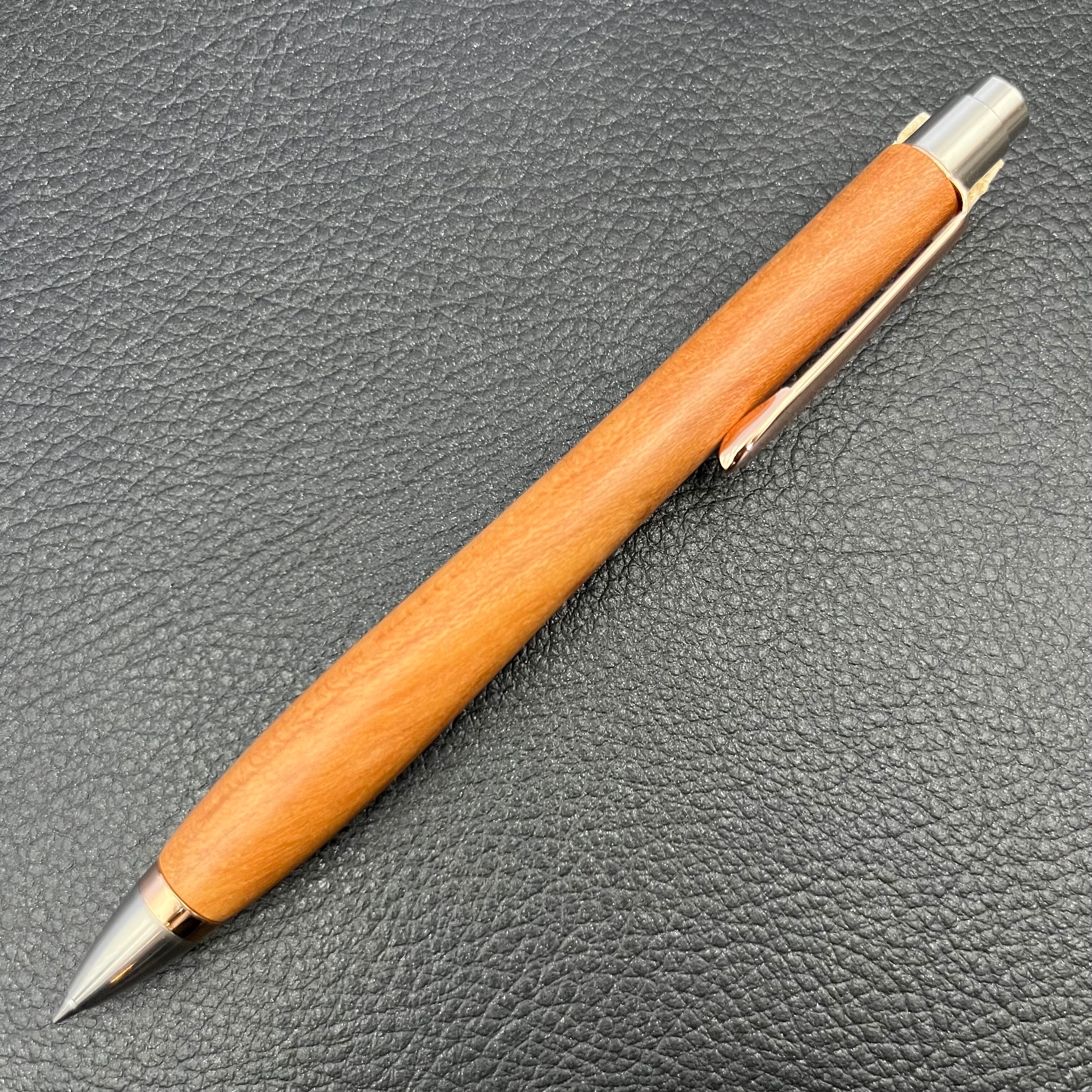 ボールペンのノックシステムは、ドイツ最高のクリックメカニズムを採用してあります。このメカニズムはユニークな機構のため、クリックしたときのカチカチ音が静かで、どんな場所でも気兼ねなく使うことができます。滑らかに動くこのプッシュ感覚を一度味わうと他には戻れなくなってしまうほどの魅力があります。 100分の1単位の加工精度で削り出されたペン先は、軸ブレも全くありません。
