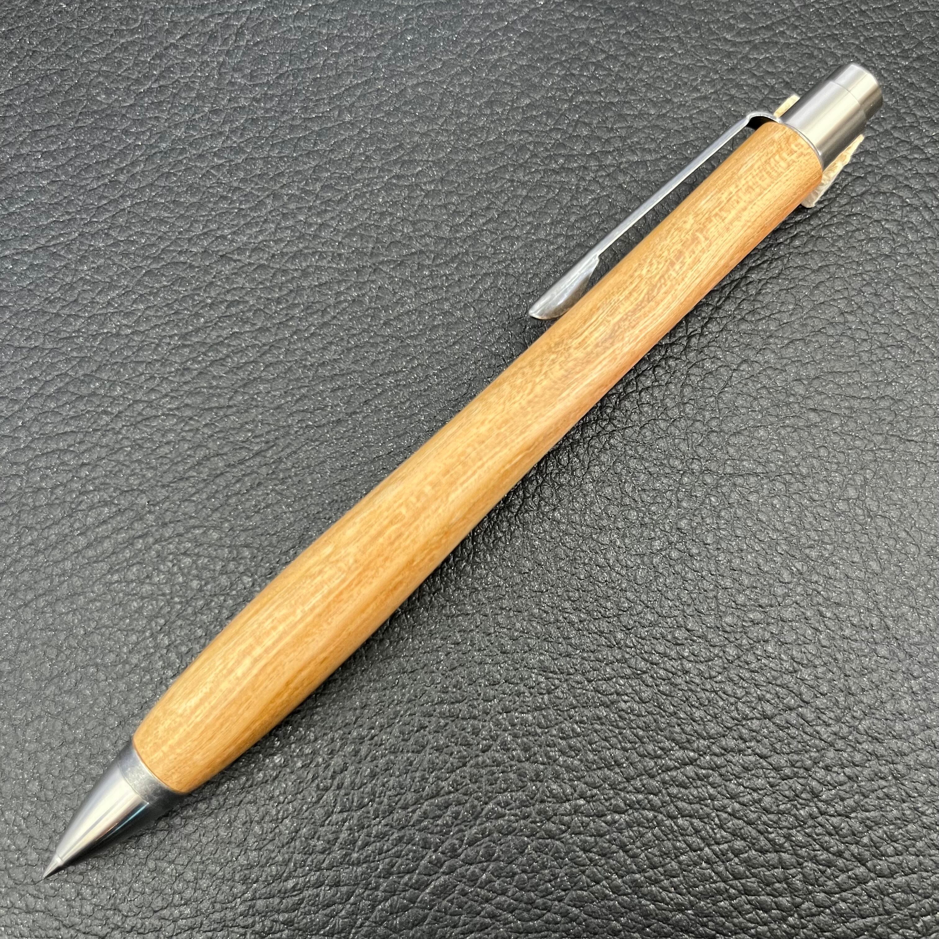 ボールペンのノックシステムは、ドイツ最高のクリックメカニズムを採用してあります。このメカニズムはユニークな機構のため、クリックしたときのカチカチ音が静かで、どんな場所でも気兼ねなく使うことができます。滑らかに動くこのプッシュ感覚を一度味わうと他には戻れなくなってしまうほどの魅力があります。 100分の1単位の加工精度で削り出されたペン先は、軸ブレも全くありません。
